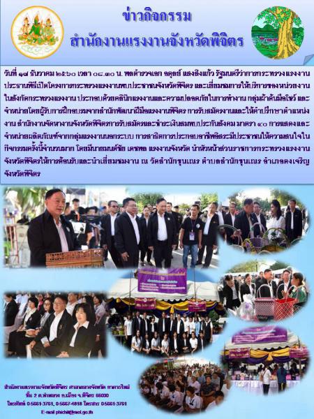 วันที่ 17 ธันวาคม 2560 เวลา 08.30 น. พลตำรวจเอก อดุลย์ แสงสิงแก้ว รัฐมนตรีว่าการกระทรวงแรงงาน ประธานพิธีเปิดโครงการกระทรวงแรงงานพบประชาชนจังหวัดพิจิตร และเยี่ยมชมการให้บริการของหน่วยงานในสังกัดกระทรวงแรงงาน ประกอบด้วยคลีนิกแรงงานและความปลอดภัยในการทำงาน กลุ่มผ้าด่นมือโชว์ และจำหน่ายโดยผู้รับการฝึกอบรมจากสำนักพัฒนาฝีมือแรงงานพิจิตร การรับสมัครงานและให้คำปรึกษาตำแหน่งงาน สำนักงานจัดหางานจังหวัดพิจิตรการรับสมัครและชำระเงินสมทบประกันสังคม มาตรา ๔๐ การแสดงและจำหน่ายผลิตภัณฑ์จากกลุ่มแรงงานนอกระบบ การสาธิตการประกอบอาชีพอิสระมีประชาชนให้ความสนใจในกิจกรรมครั้งนี้จำนวนมาก โดยมีนายมนต์ชัย เดชพล แรงงานจังหวัด นำหัวหน้าส่วนราชการกระทรวงแรงงานจังหวัดพิจิตรให้การต้อนรับและนำเยี่ยมชมงาน ณ วัดสำนักขุนเณร ตำบลสำนักขุนเณร อำเภอดงเจริญ จังหวัดพิจิตร