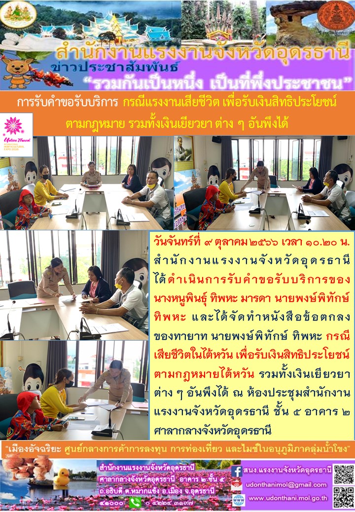 สรจ.อุดรธานี ได้ดำเนินการรับคำขอรับบริการ กรณีแรงงานเสียชีวิต เพื่อรับเงินสิทธิประโยชน์ตามกฎหมาย รวมทั้งเงินเยียวยาต่าง ๆ อันพึงได้