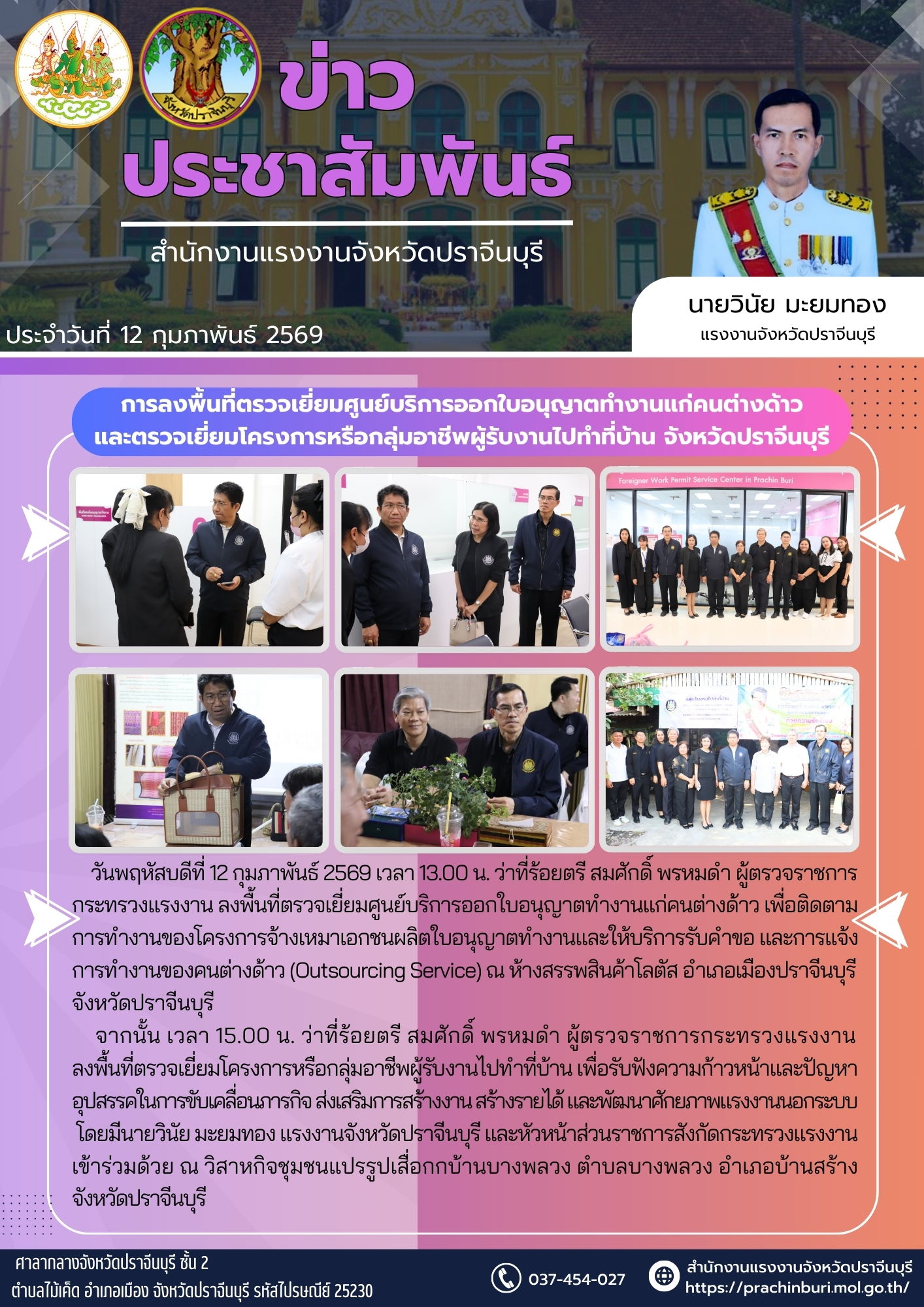 วันพฤหัสบดีที่ 12 กุมภาพันธ์ 2569 เวลา 13.00 น. ว่าที่ร้อยตรี สมศักดิ์ พรหมดำ ผู้ตรวจราชการกระทรวงแรงงาน ลงพื้นที่ตรวจเยี่ยมศูนย์บริการออกใบอนุญาตทำงานแก่คนต่างด้าว เพื่อติดตามการทำงานของโครงการจ้างเหมาเอกชนผลิตใบอนุญาตทำงานและให้บริการรับคำขอ และการแจ้งการทำงานของคนต่างด้าว (Outsourcing Service) ณ ห้างสรรพสินค้าโลตัส อำเภอเมืองปราจีนบุรี จังหวัดปราจีนบุรี