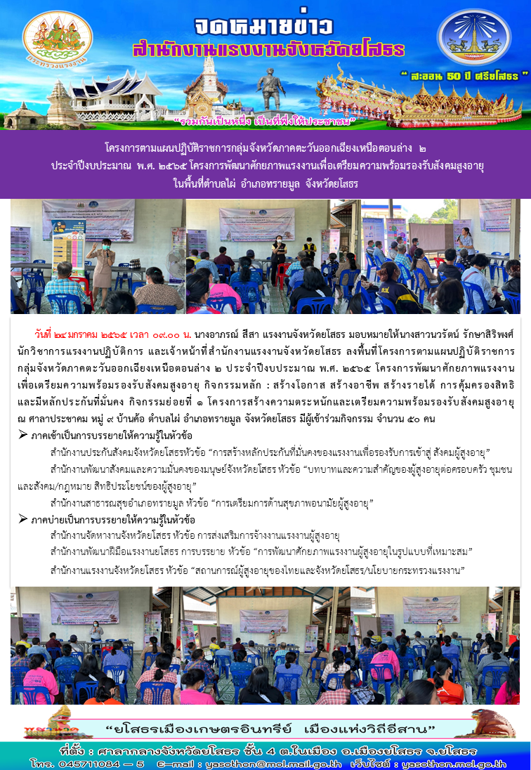 สรจ.ยโสธร ลงพื้นที่เปิดโครงการแก้ไขปัญหาความเดือดร้อนด้านอาชีพ ประจำปีงบประมาณ พ.ศ. ๒๕๖๕ กิจกรรมหลัก : พัฒนาทักษะฝีมือ ในเขตพื้นที่อำเภอมหาชนะชัย