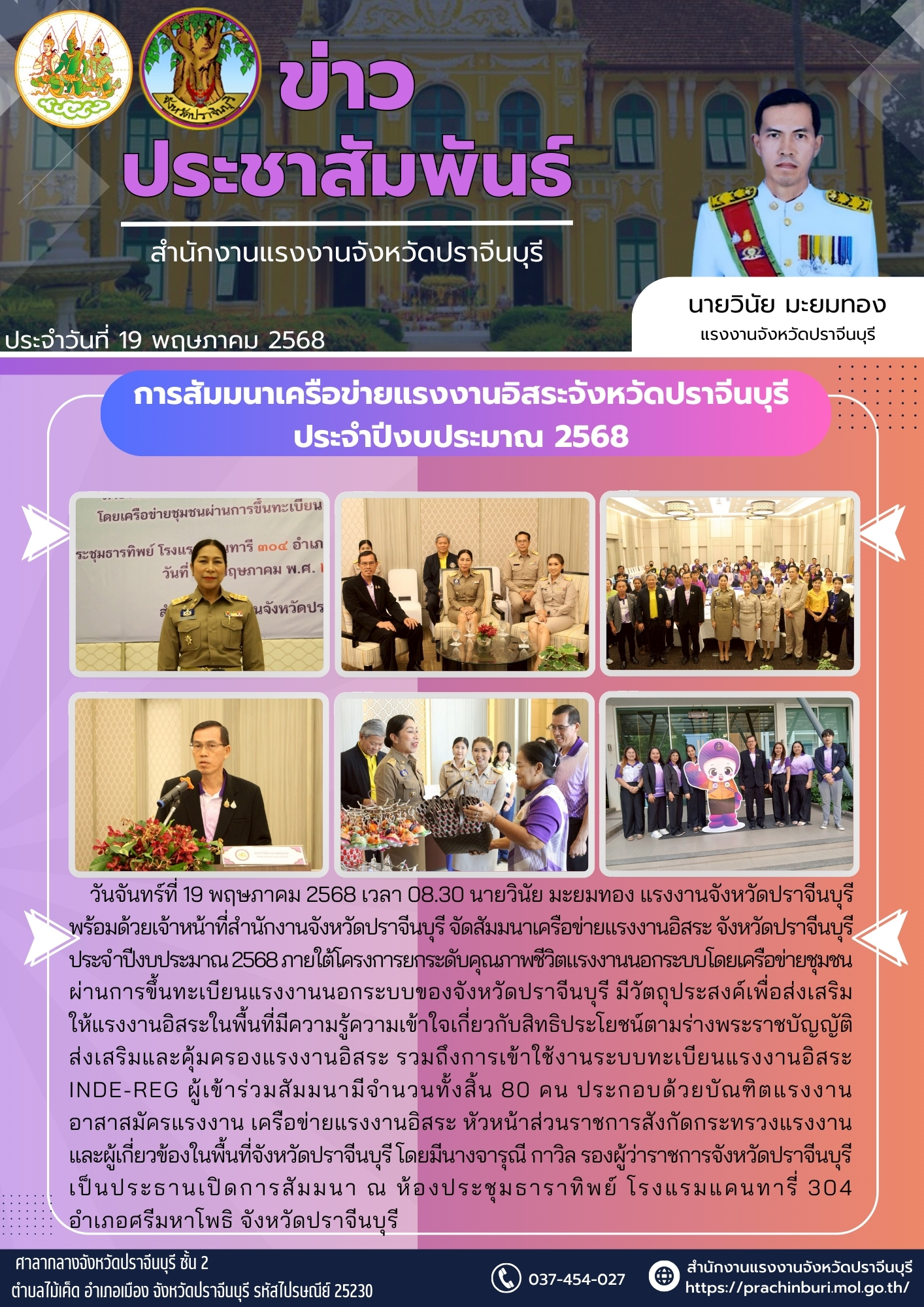 วันจันทร์ที่ 19 พฤษภาคม 2568 เวลา 08.30 นายวินัย มะยมทอง แรงงานจังหวัดปราจีนบุรี พร้อมด้วยเจ้าหน้าที่สำนักงานจังหวัดปราจีนบุรี จัดสัมมนาเครือข่ายแรงงานอิสระ จังหวัดปราจีนบุรี ประจำปีงบประมาณ 2568 ภายใต้โครงการยกระดับคุณภาพชีวิตแรงงานนอกระบบโดยเครือข่ายชุมชน ผ่านการขึ้นทะเบียนแรงงานนอกระบบของจังหวัดปราจีนบุรี มีวัตถุประสงค์เพื่อส่งเสริม ให้แรงงานอิสระในพื้นที่มีความรู้ความเข้าใจเกี่ยวกับสิทธิประโยชน์ตามร่างพระราชบัญญัติ ส่งเสริมและคุ้มครองแรงงานอิสระ รวมถึงการเข้าใช้งานระบบทะเบียนแรงงานอิสระ INDE-REG ผู้เข้าร่วมสัมมนามีจำนวนทั้งสิ้น 80 คน ประกอบด้วยบัณฑิตแรงงาน อาสาสมัครแรงงาน เครือข่ายแรงงานอิสระ หัวหน้าส่วนราชการสังกัดกระทรวงแรงงาน และผู้เกี่ยวข้องในพื้นที่จังหวัดปราจีนบุรี โดยมีนางจารุณี กาวิล รองผู้ว่าราชการจังหวัดปราจีนบุรี เป็นประธานเปิดการสัมมนา ณ ห้องประชุมธาราทิพย์ โรงแรมแคนทารี่ 304 อำเภอศรีมหาโพธิ จังหวัดปราจีนบุรี