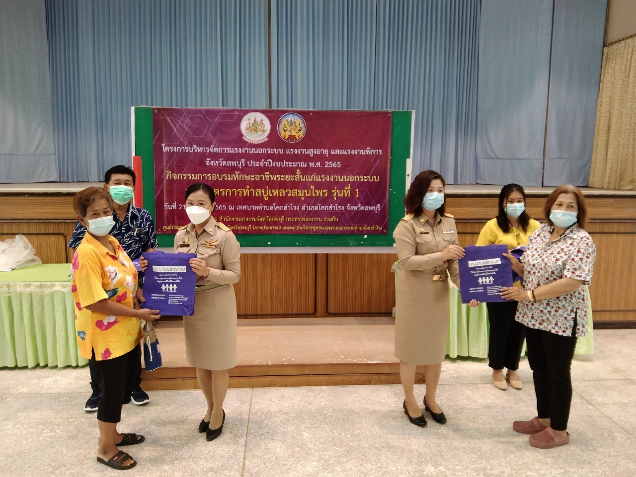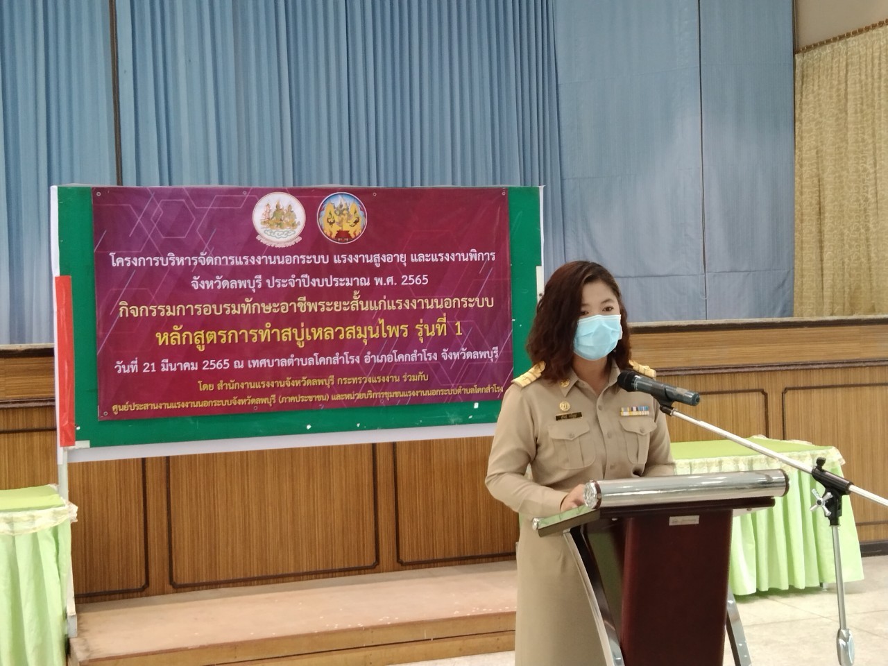 วันที่ 21 มีนาคม 2565 นางสาวสุกัญญา องค์วิเศษไพบูลย์ แรงงานจังหวัดลพบุรี เป็นประธานเปิดการอบรมทักษะอาชีพระยะสั้นแก่แรงงานนอกระบบ หลักสูตรการทำสบู่เหลวสมุนไพร รุ่น 1 ภายใต้โครงการบริหารจัดการแรงงานนอกระบบ แรงงานสูงอายุ และแรงงานพิการจังหวัดลพบุรี ประจำปีงบประมาณ พ.ศ.2565 มีผู้เข้าร่วมกิจกรรมเป็นแรงงานนอกระบบ จำนวน 21 คน ณ เทศบาลตำบลโคกสำโรง ตำบลโคกสำโรง อำเภอโคกสำโรง จังหวัดลพบุรี โดยการอบรมครั้งนี้ มีวัตถุประสงค์เพื่อให้แรงงานนอกระบบนำความรู้ที่ได้รับไปประยุกต์ใช้เพื่อเพิ่มโอกาสในการประกอบอาชีพ เพื่อสร้างรายได้ และลดค่าใช้จ่ายในครัวเรือน พร้อมนี้ นางสาวสุรีรัตน์ วรปัญญา นายกเทศมนตรีตำบลโคกสำโรง และเจ้าหน้าที่เทศบาลตำบลโคกสำโรง เข้าร่วมเป็นเกียรติในการเปิดการอบรมและอำนวยความสะดวกในการดำเนินกิจกรรม โดยมีนายวิรัตน์ เอี่ยมสอาด อาสาสมัครแรงงานตำบลโคกสำโรง เป็นผู้ประสานงาน
