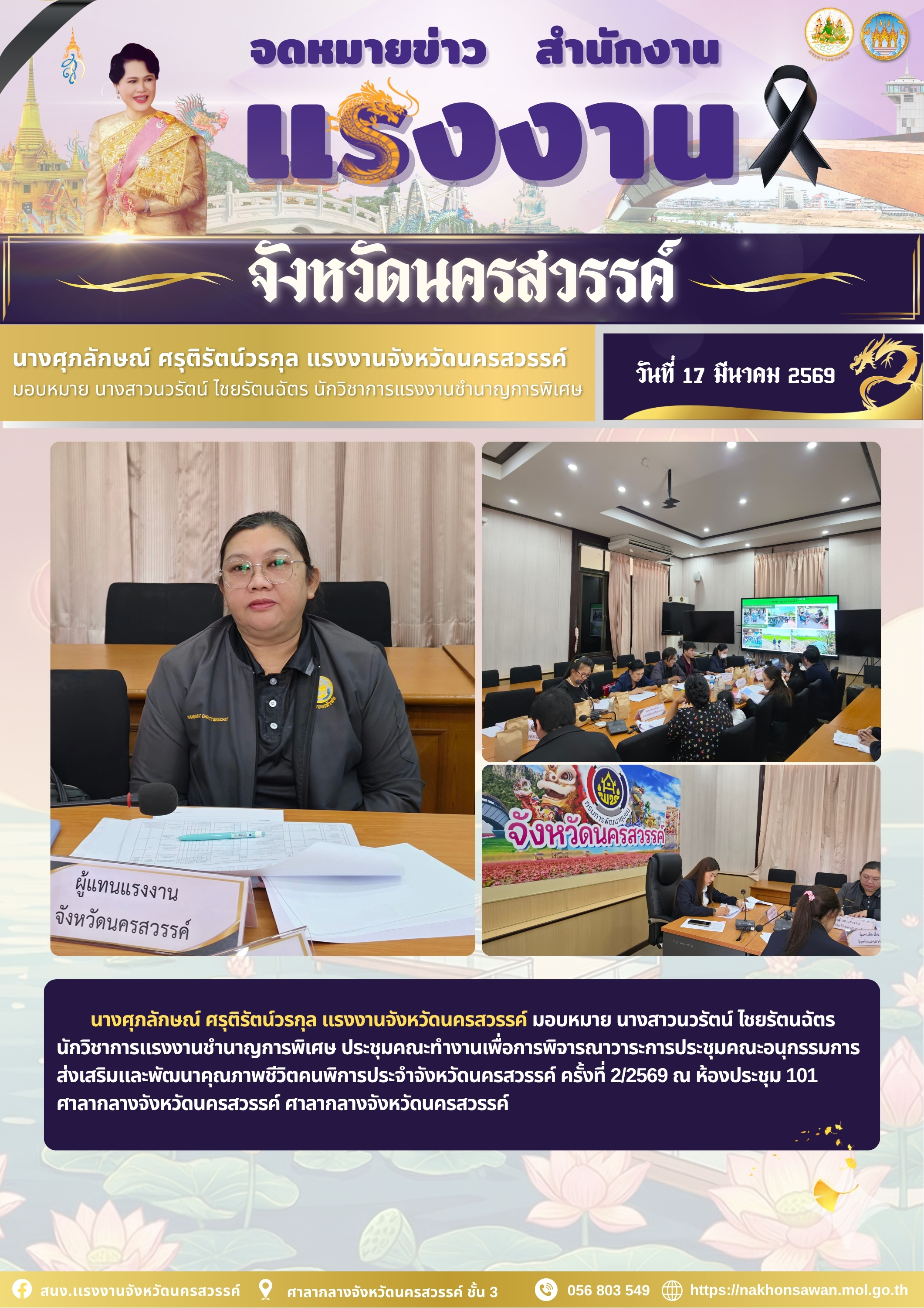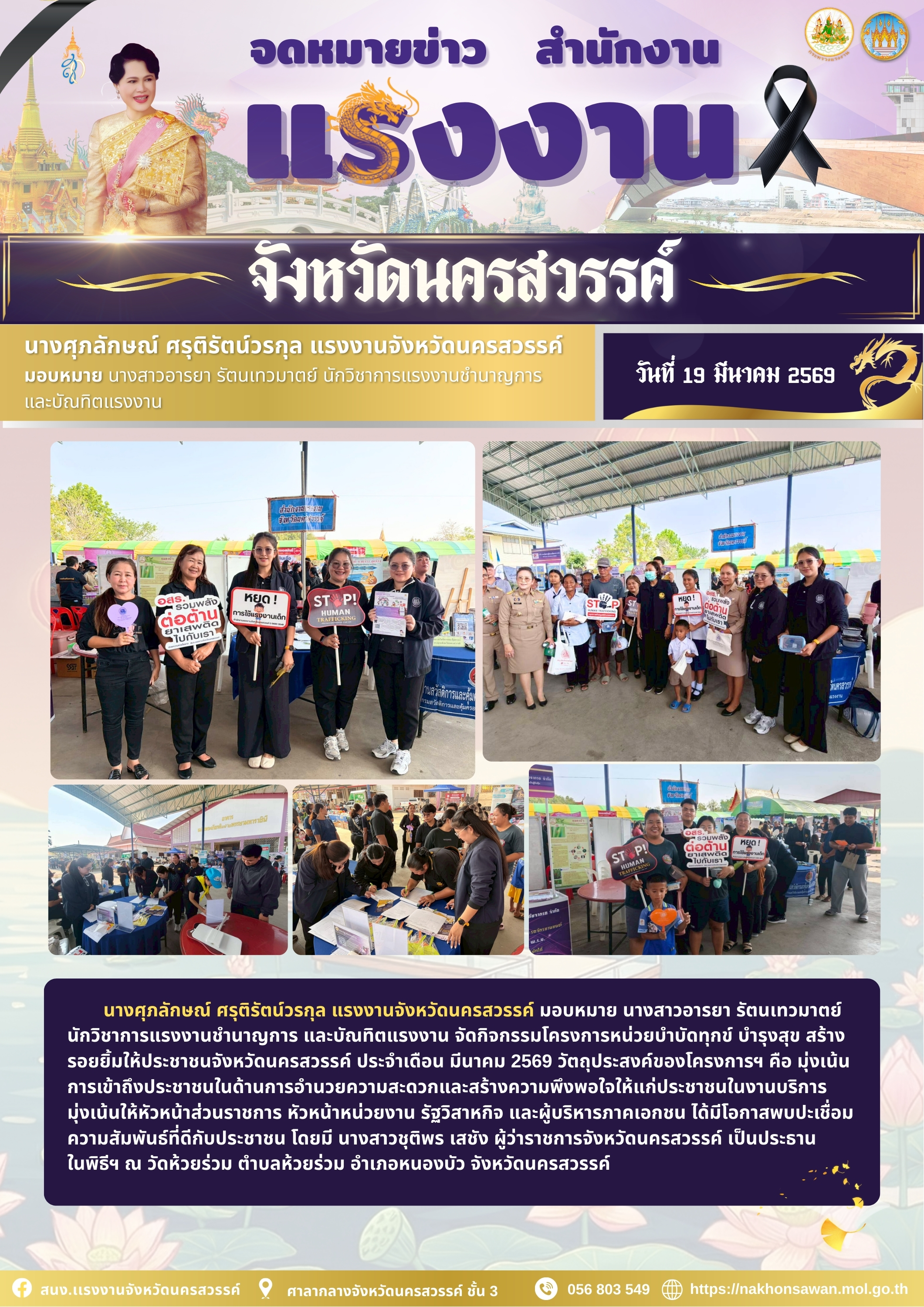 นางศุภลักษณ์ ศรุติรัตน์วรกุล แรงงานจังหวัดนครสวรรค์ มอบหมาย นางสาวอารยา รัตนเทวมาตย์ นักวิชาการแรงงานชำนาญการ และบัณทิตแรงงาน จัดกิจกรรมโครงการหน่วยบำบัดทุกข์ บำรุงสุข สร้างรอยยิ้มให้ประชาชนจังหวัดนครสวรรค์ ประจำเดือน มีนาคม 2569 วัตถุประสงค์ของโครงการฯ คือ มุ่งเน้นการเข้าถึงประชาชนในด้านการอำนวยความสะดวกและสร้างความพึงพอใจให้แก่ประชาชนในงานบริการ มุ่งเน้นให้หัวหน้าส่วนราชการ หัวหน้าหน่วยงาน รัฐวิสาหกิจ และผู้บริหารภาคเอกชน ได้มีโอกาสพบปะเชื่อมความสัมพันธ์ที่ดีกับประชาชน โดยมี นางสาวชุติพร เสชัง ผู้ว่าราชการจังหวัดนครสวรรค์ เป็นประธาน ในพิธีฯ ณ วัดห้วยร่วม ตำบลห้วยร่วม อำเภอหนองบัว จังหวัดนครสวรรค์