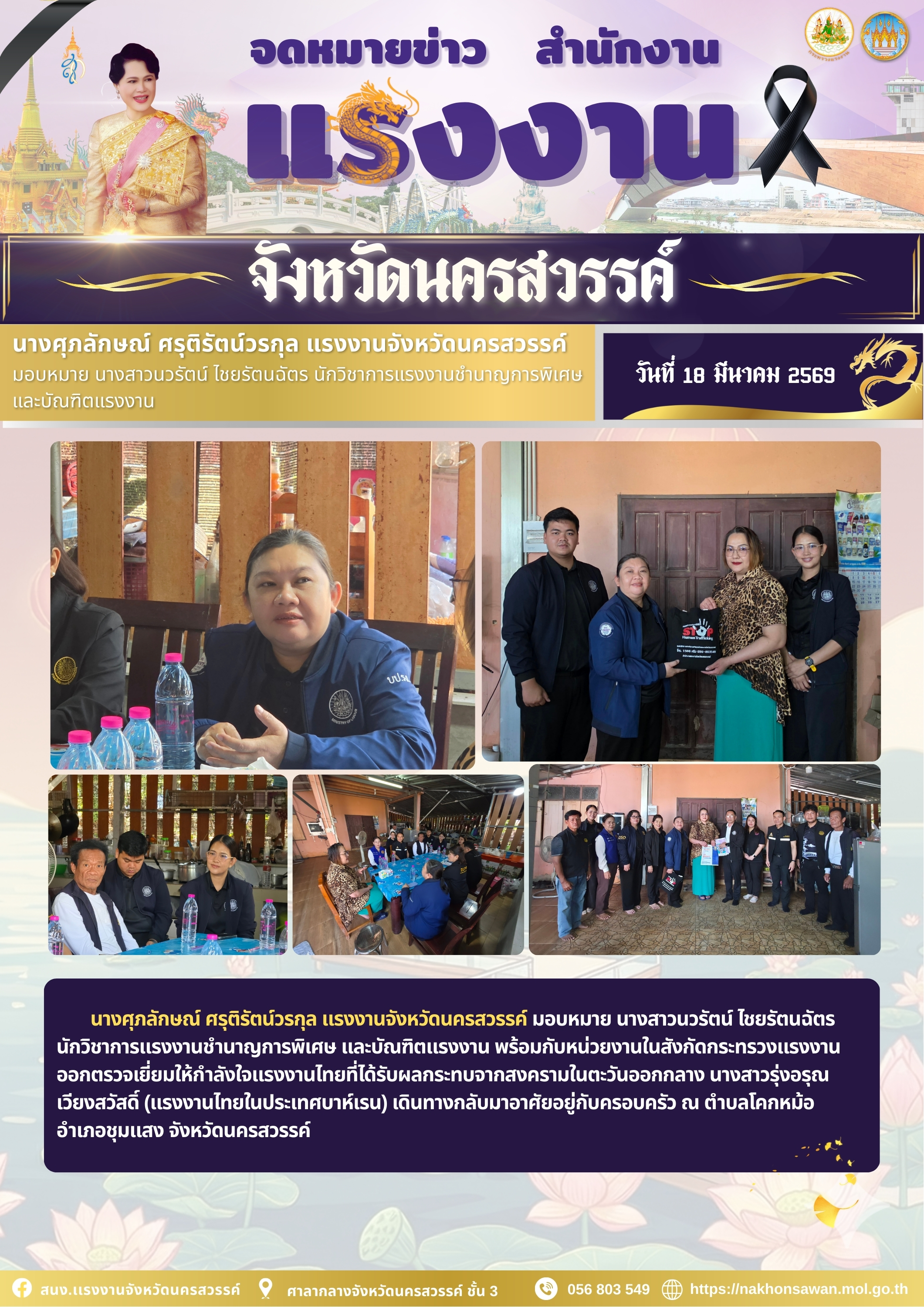 นางศุภลักษณ์ ศรุติรัตน์วรกุล แรงงานจังหวัดนครสวรรค์ มอบหมาย นางสาวนวรัตน์ ไชยรัตนฉัตร นักวิชาการแรงงานชำนาญการพิเศษ และบัณฑิตแรงงาน พร้อมกับหน่วยงานในสังกัดกระทรวงแรงงาน ออกตรวจเยี่ยมให้กำลังใจแรงงานไทยที่ได้รับผลกระทบจากสงครามในตะวันออกกลาง นางสาวรุ่งอรุณ เวียงสวัสดิ์ (แรงงานไทยในประเทศบาห์เรน) เดินทางกลับมาอาศัยอยู่กับครอบครัว ณ ตำบลโคกหม้อ อำเภอชุมแสง จังหวัดนครสวรรค์
