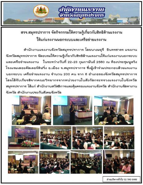 การอบรมให้ความรู้เกี่ยวกับสิทธํฤิด้านแรงงาน แก่แรงงานนอกระบบและเครือข่ายแรงงานจังหวัดสมุทรปราการ ปี 2560