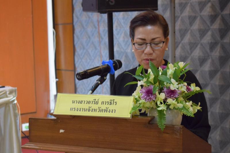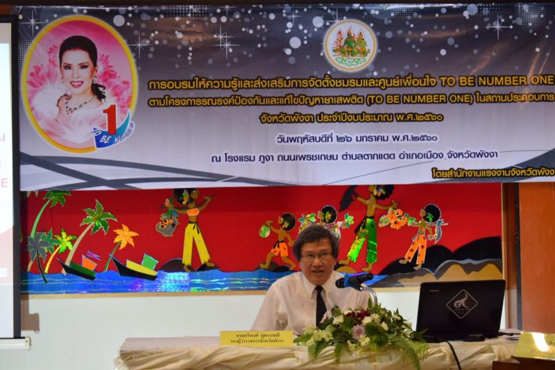 วันที่ 26 มกราคม 2560 สำนักงานแรงงานโดย นางสาวอารีย์ การธิโร แรงงานจังหวัดพังงา จัดการอบรมให้ความรู้และส่งเสริมการจัดตั้งชมรมและศูนย์เพื่อนใจ TO BE NUMBER ONE ตามโครงการรณรงค์ป้องกันและแก้ไขปัญหายาเสพติด (TO BE NUMBER ONE) ในสถานประกอบการ จังหวัดพังงา ประจำปีงบประมาณ 2560 ณ โรงแรมภูงา โดยมีนายศรีพงศ์ บุตรงามดี รองผู้ว่าราชการจังหวัดพังงา เป็นประธานในพิธี