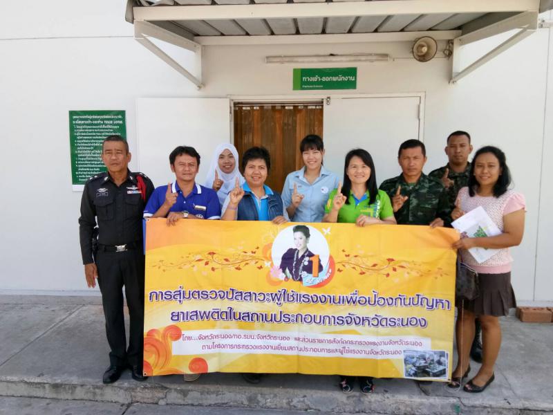การออกตรวจเยี่ยมสถานประกอบการและสุ่มตรวจปัสสาวะผู้ใช้แรงงาน วันที่ 21 กุมภาพันธ์ 2561 เวลา 13.30 น. นายสุรนารถ จิตต์เอื้อเฟื้อ นำหน่วยงานในสังกัดกระทรวงแรงงาน สำนักงานสาธารณสุขจังหวัดระนอง ศอ.ปส.จ.ระนอง กอ.รมน.ระนอง อำเภอเมืองระนอง และตำรวจภูธรจังหวัดระนอง ออกตรวจเยี่ยมสถานประกอบการแบบบูรณาการฯ ณ ห้างโลตัส สาขาระนอง ตามนโยบายกระทรวงแรงงานที่ต้องให้สถานประกอบการ/ผู้ใช้แรงงาน มีความรู้ ความเข้าใจ ในสิทธิประโยชน์ที่พึงจะได้รับ รวมถึงข้อมูลข่าวสาร ระเบียบข้อกฎหมายใหม่ๆ ตลอดจนรับทราบปัญหาความต้องการของเจ้าของสถานประกอบการ/ผู้ใช้แรงงาน เพื่อนำข้อคิดเห็น/ข้อเสนอแนะ เสนอผู้บริหารของกระทรวงแรงงาน และสุมตรวจสารสเพติดผู้ใช้แรงงาน แนะนำมาตราการป้องกันและแก้ไขปัญหายาเสพติดในสถานประกอบการ จากการสุ่มตรวจปัสสาวะผู้ใช้แรงงาน จำนวน 36 คน ผลปรากฎว่าไม่พบสารเสพติดแต่อย่างใด