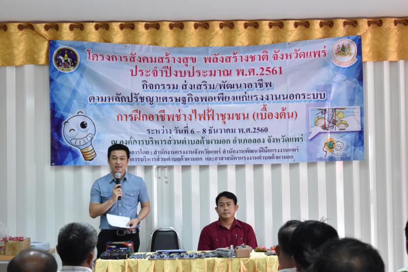 วันที่ 6 ธันวาคม 2560 สำนักงานแรงงานจังหวัดแพร่ เปิดโครงการสังคมสร้างสุข พลังสร้างชาติ จังหวัดแพร่ ประจำปีงบประมาณ พ.ศ.2561 กิจกรรม ส่งเสริม/พัฒนาอาชีพตามหลักปรัชญาเศรษฐกิจพอเพียงแก่แรงงานนอกระบบการฝึกอาชีพช่างไฟฟ้าชุมชน (เบื้องต้น) ณ องค์การบริหารส่วนตำบลต้าผามอก อำเภอลอง จังหวัดแพร่
