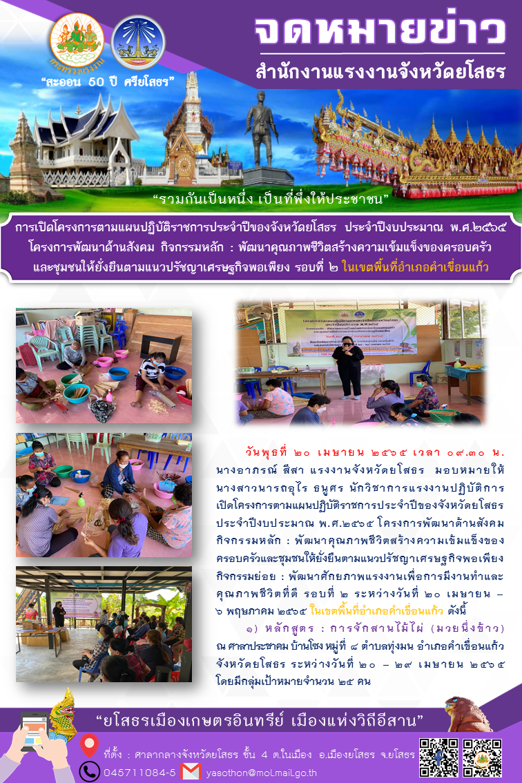 วันพุธที่ ๒๐ เมษายน ๒๕๖๕ เวลา ๐๙.๓๐ น. นางอาภรณ์ สีสา แรงงานจังหวัดยโสธร มอบหมายให้นางสาวนารถอุไร ธนูศร นักวิชาการแรงงานปฏิบัติการ เปิดโครงการตามแผนปฏิบัติราชการประจำปีของจังหวัดยโสธร ประจำปีงบประมาณ พ.ศ.๒๕๖๕ โครงการพัฒนาด้านสังคม กิจกรรมหลัก : พัฒนาคุณภาพชีวิตสร้างความเข้มแข็งของครอบครัวและชุมชนให้ยั่งยืนตามแนวปรัชญาเศรษฐกิจพอเพียง กิจกรรมย่อย : พัฒนาศักยภาพแรงงานเพื่อการมีงานทำและคุณภาพชีวิตที่ดี รอบที่ ๒ ระหว่างวันที่ ๒๐ เมษายน – ๖ พฤษภาคม ๒๕๖๕ ในเขตพื้นที่อำเภอคำเขื่อนแก้ว ดังนี้