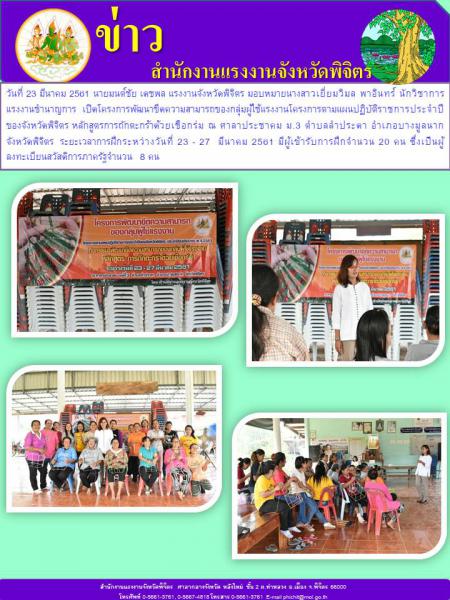 วันที่ 23 มีนาคม 2561 นายมนต์ชัย เดชพล แรงงานจังหวัดพิจิตร มอบหมายนางสาวเยี่ยมวิมล พาอินทร์ นักวิชาการแรงงานชำนาญการ เปิดโครงการพัฒนาขีดความสามารถของกลุ่มผู้ใช้แรงงานโครงการตามแผนปฏิบัติราชการประจำปีของจังหวัดพิจิตร หลักสูตรการถักตะกร้าด้วยเชือกร่ม ณ ศาลาประชาคม ม.3 ตำบลลำประดา อำเภอบางมูลนาก จังหวัดพิจิตร ระยะเวลาการฝึกระหว่างวันที่ 23 – 27 มีนาคม 2561 มีผู้เข้ารับการฝึกจำนวน 20 คน ซึ่งเป็นผู้ลงทะเบียนสวัสดิการภาครัฐจำนวน 8 คน
