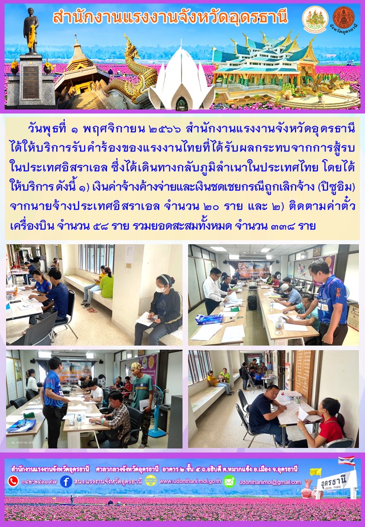 สรจ.อุดรธานี ให้บริการรับคำร้องของแรงงานไทยที่ได้รับผลกระทบจากการสู้รบในประเทศอิสราเอล ซึ่งได้เดินทางกลับภูมิลำเนาในประเทศไทย