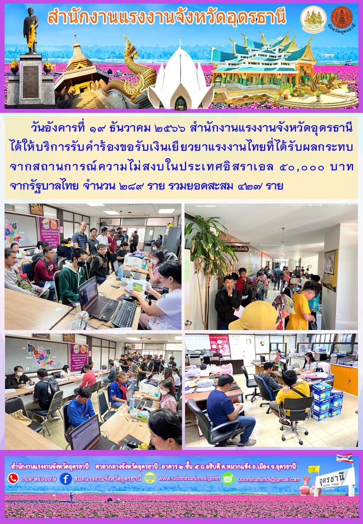 สรจ.อุดรธานี ให้บริการรับคำร้องขอรับเงินเยียวยาแรงงานไทยที่ได้รับผลกระทบจากสถานการณ์ความไม่สงบในประเทศอิสราเอล 50,000 บาท จากรัฐบาลไทย