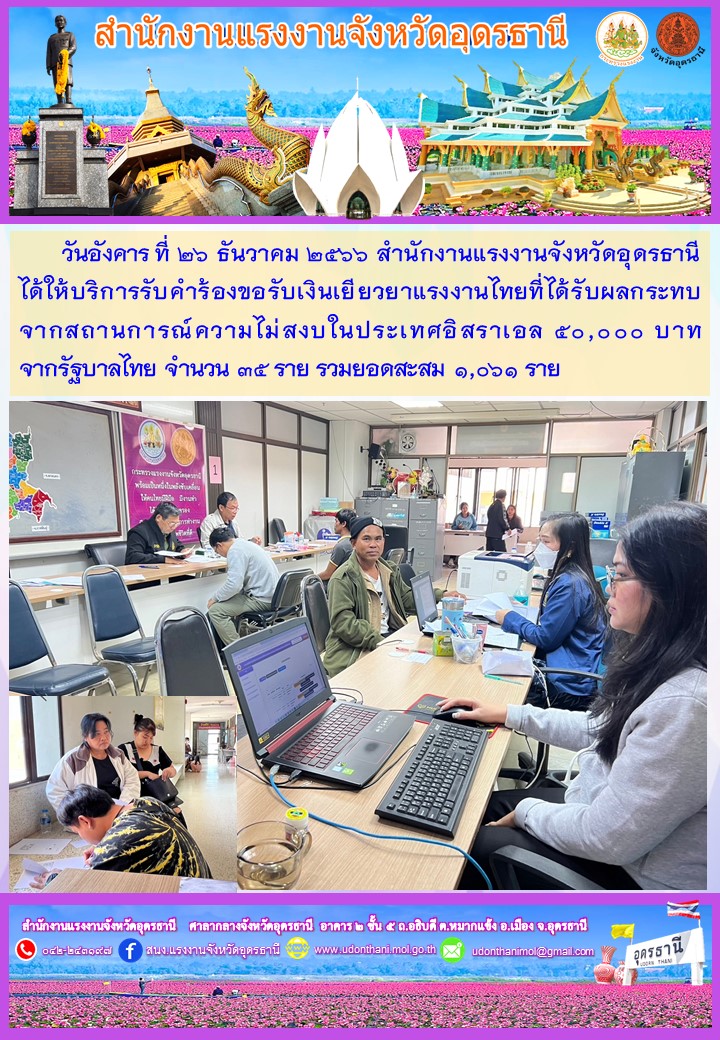 สรจ.อุดรธานี ให้บริการรับคำร้องขอรับเงินเยียวยาแรงงานไทยที่ได้รับผลกระทบจากสถานการณ์ความไม่สงบในประเทศอิสราเอล 50,000 บาท จากรัฐบาลไทย