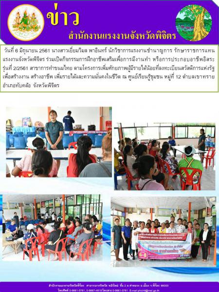 วันที่ 6 มิถุนายน 2561 นางสาวเยี่ยมวิมล พาอินทร์ นักวิชาการแรงงานชำนาญการ รักษาราชการแทนแรงงานจังหวัดพิจิตร ร่วมเปิดกิจกรรมการฝึกอาชีพเสริมเพื่อการมีงานทำ หรือการประกอบอาชีพอิสระ รุ่นที่ 2/2561 สาขาการทำขนมไทย ตามโครงการเพิ่มศักยภาพผู้มีรายได้น้อยที่ลงทะเบียนสวัสดิการแห่งรัฐ เพื่อสร้างงาน สร้างอาชีพ เพิ่มรายได้และความมั่นคงในชีวิต ณ ศูนย์เรียนรู้ชุมชน หมู่ที่ 12 ตำบลเขาทราย อำเภอทับคล้อ จังหวัดพิจิตร