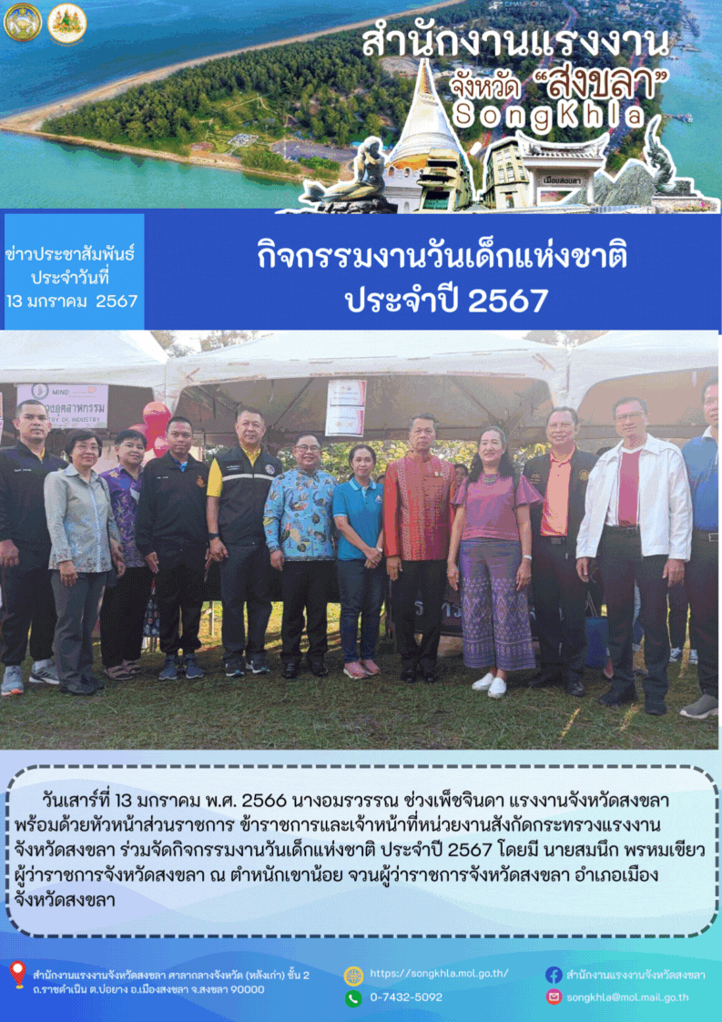 วันเสาร์ที่ 13 มกราคม พ.ศ. 2566 นางอมรวรรณ ช่วงเพ็ชจินดา แรงงานจังหวัดสงขลา พร้อมด้วยหัวหน้าส่วนราชการ ข้าราชการและเจ้าหน้าที่หน่วยงานสังกัดกระทรวงแรงงานจังหวัดสงขลา ร่วมจัดกิจกรรมงานวันเด็กแห่งชาติ ประจำปี 2567 โดยมี นายสมนึก พรหมเขียว ผู้ว่าราชการจังหวัดสงขลา ณ ตำหนักเขาน้อย จวนผู้ว่าราชการจังหวัดสงขลา อำเภอเมือง จังหวัดสงขลา