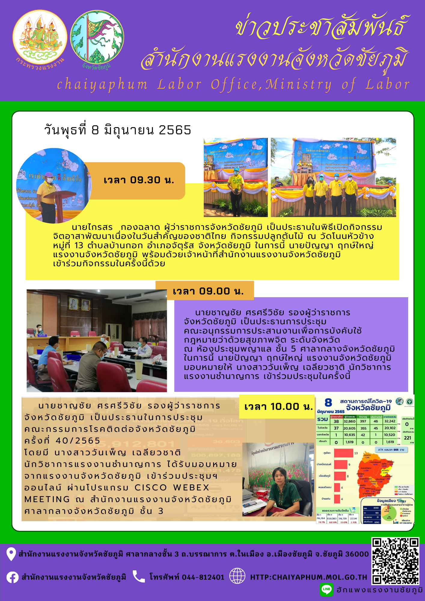 เวลา 10.00 น. นายชาญชัย ศรศรีวิชัย รองผู้ว่าราชการจังหวัดชัยภูมิ เป็นประธานในการประชุม คณะกรรมการโรคติดต่อจังหวัดชัยภูมิ ครั้งที่ 40/2565 โดยมี นางสาววันเพ็ญ เฉลียวชาติ นักวิชาการแรงงานชำนาญการ ได้รับมอบหมายจากแรงงานจังหวัดชัยภูมิ เข้าร่วมประชุมฯ ออนไลน์ ผ่านโปรแกรม Cisco Webex Meeting ณ สำนักงานแรงงานจังหวัดชัยภูมิ