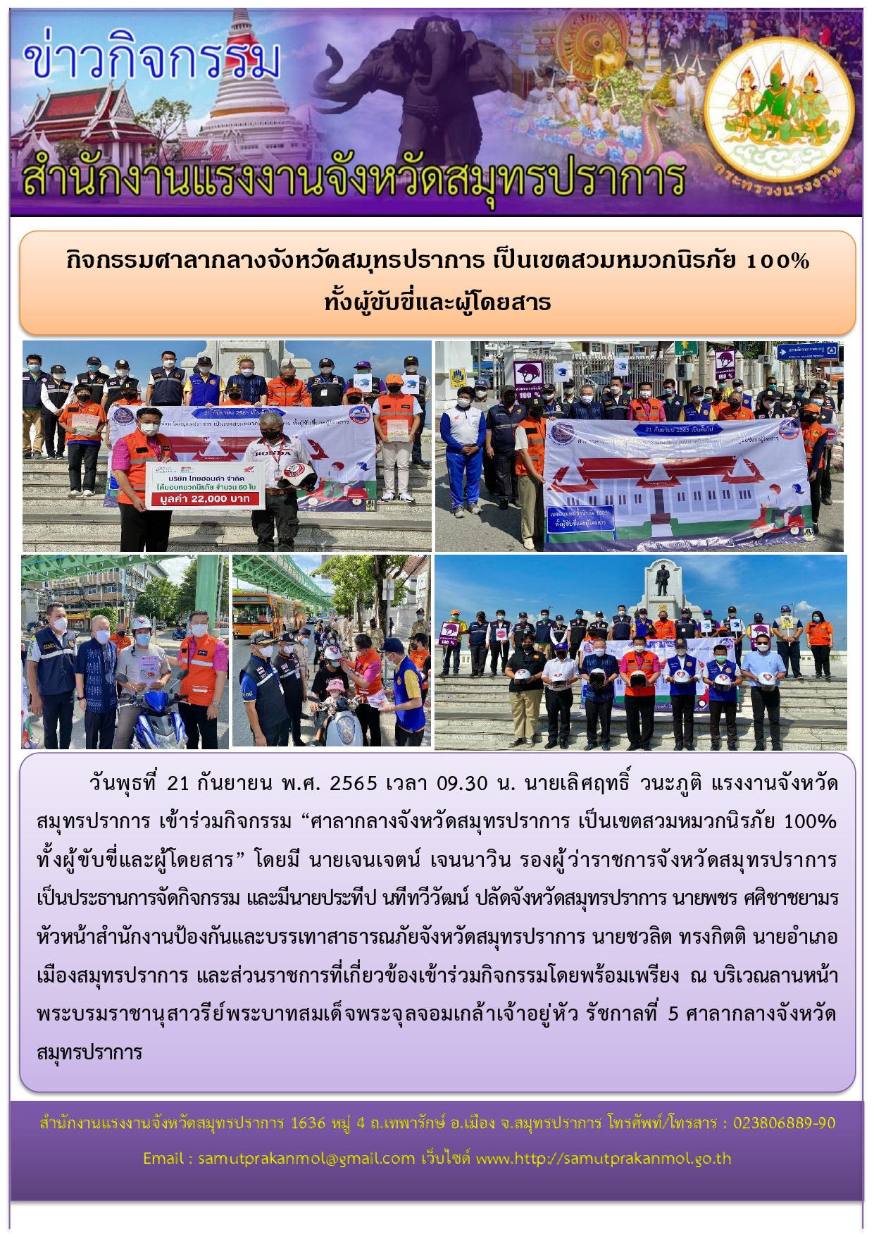 กิจกรรมศาลากลางจังหวัดสมุทรปราการ เป็นเขตสวมหมวกนิรภัย 100% ทั้งผู้ขับขี่และผู้โดยสาร