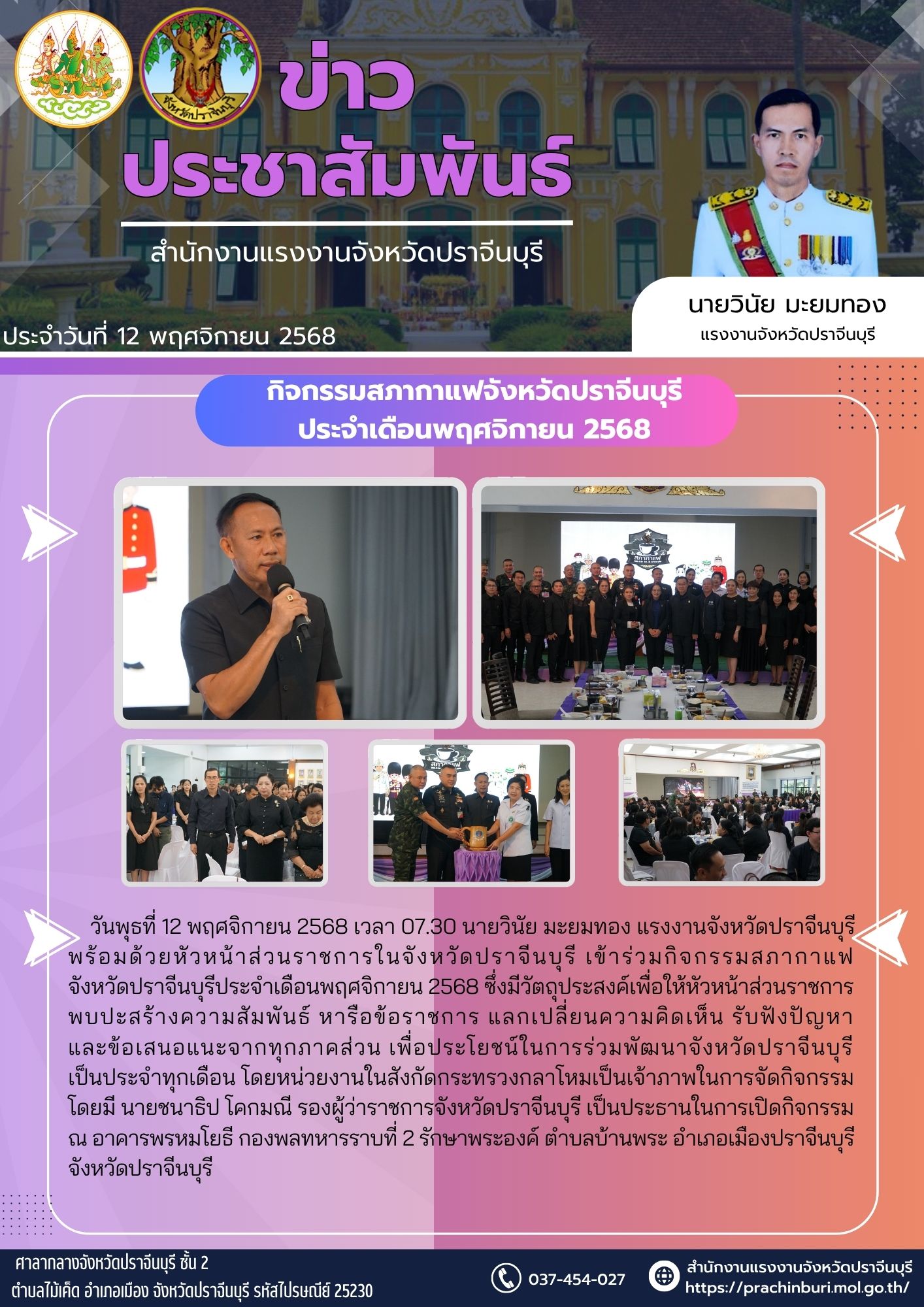 วันพุธที่ 12 พฤศจิกายน 2568 เวลา 07.30 นายวินัย มะยมทอง แรงงานจังหวัดปราจีนบุรี พร้อมด้วยหัวหน้าส่วนราชการในจังหวัดปราจีนบุรี เข้าร่วมกิจกรรมสภากาแฟจังหวัดปราจีนบุรี ประจำเดือนพฤศจิกายน 2568 ซึ่งมีวัตถุประสงค์เพื่อให้หัวหน้าส่วนราชการ พบปะสร้างความสัมพันธ์ หารือข้อราชการ แลกเปลี่ยนความคิดเห็น รับฟังปัญหา และข้อเสนอแนะจากทุกภาคส่วน เพื่อประโยชน์ในการร่วมพัฒนาจังหวัดปราจีนบุรี เป็นประจำทุกเดือน โดยหน่วยงานในสังกัดกระทรวงกลาโหมเป็นเจ้าภาพในการจัดกิจกรรม โดยมี นายชนาธิป โคกมณี รองผู้ว่าราชการจังหวัดปราจีนบุรี เป็นประธานในการเปิดกิจกรรม ณ อาคารพรหมโยธี กองพลทหารราบที่ 2 รักษาพระองค์ ตำบลบ้านพระ อำเภอเมืองปราจีนบุรี จังหวัดปราจีนบุรี
