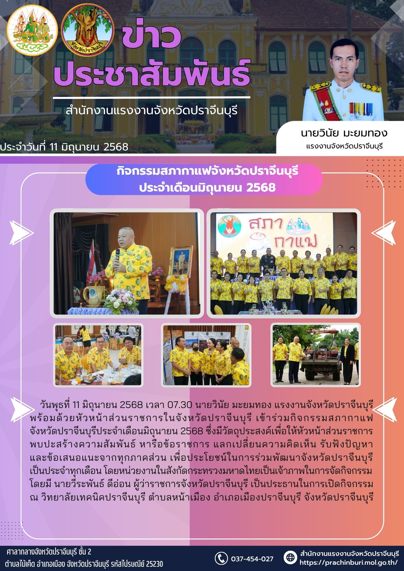 วันพุธที่ 11 มิถุนายน 2568 เวลา 07.30 นายวินัย มะยมทอง แรงงานจังหวัดปราจีนบุรี พร้อมด้วยหัวหน้าส่วนราชการในจังหวัดปราจีนบุรี เข้าร่วมกิจกรรมสภากาแฟ