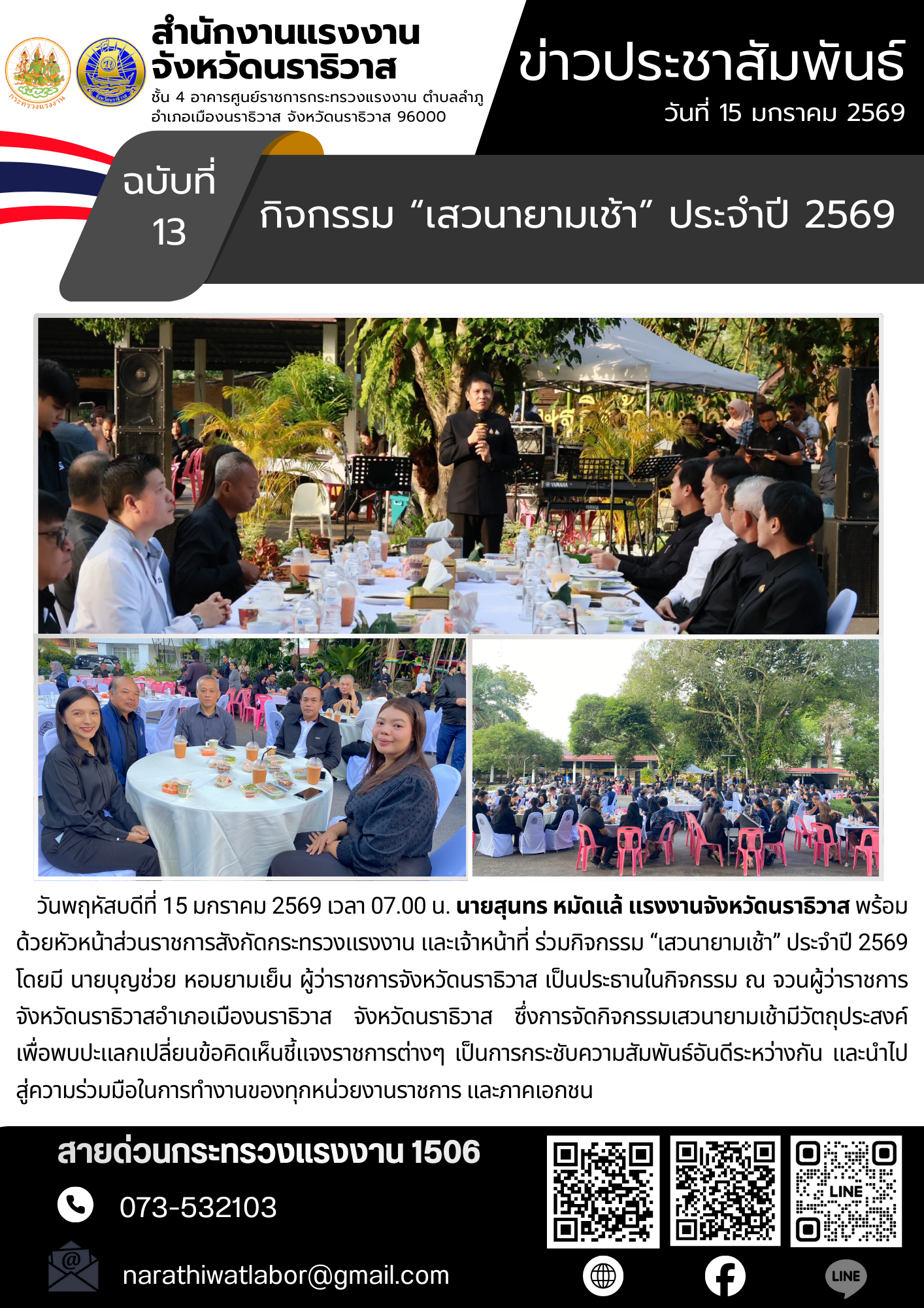 วันพฤหัสบดีที่ 15 มกราคม 2569 เวลา 07.00 น. นายสุนทร หมัดแล้ แรงงานจังหวัดนราธิวาส พร้อมด้วยหัวหน้าส่วนราชการสังกัดกระทรวงแรงงาน และเจ้าหน้าที่ ร่วมกิจกรรม “เสวนายามเช้า” ประจำปี 2569 โดยมี นายบุญช่วย หอมยามเย็น ผู้ว่าราชการจังหวัดนราธิวาส เป็นประธานในกิจกรรม ณ จวนผู้ว่าราชการจังหวัดนราธิวาสอำเภอเมืองนราธิวาส จังหวัดนราธิวาส ซึ่งการจัดกิจกรรมเสวนายามเช้ามีวัตถุประสงค์ เพื่อพบปะแลกเปลี่ยนข้อคิดเห็นชี้แจงราชการต่างๆ เป็นการกระชับความสัมพันธ์อันดีระหว่างกัน และนำไปสู่ความร่วมมือในการทำงานของทุกหน่วยงานราชการ และภาคเอกชน