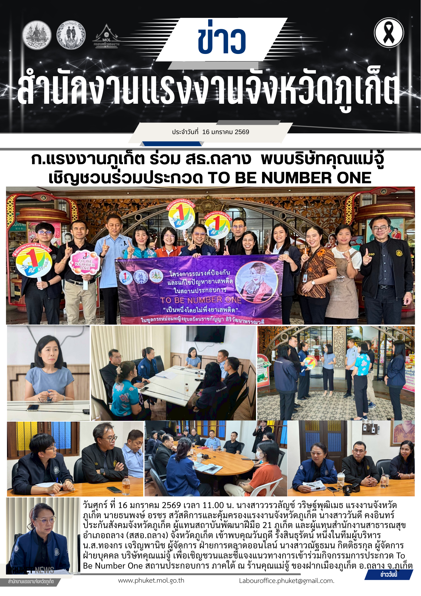 ก.แรงงานภูเก็ต ร่วม สธ.ถลาง พบบริษัทคุณแม่จู้ เชิญชวนร่วมประกวด TO BE NUMBER ONE