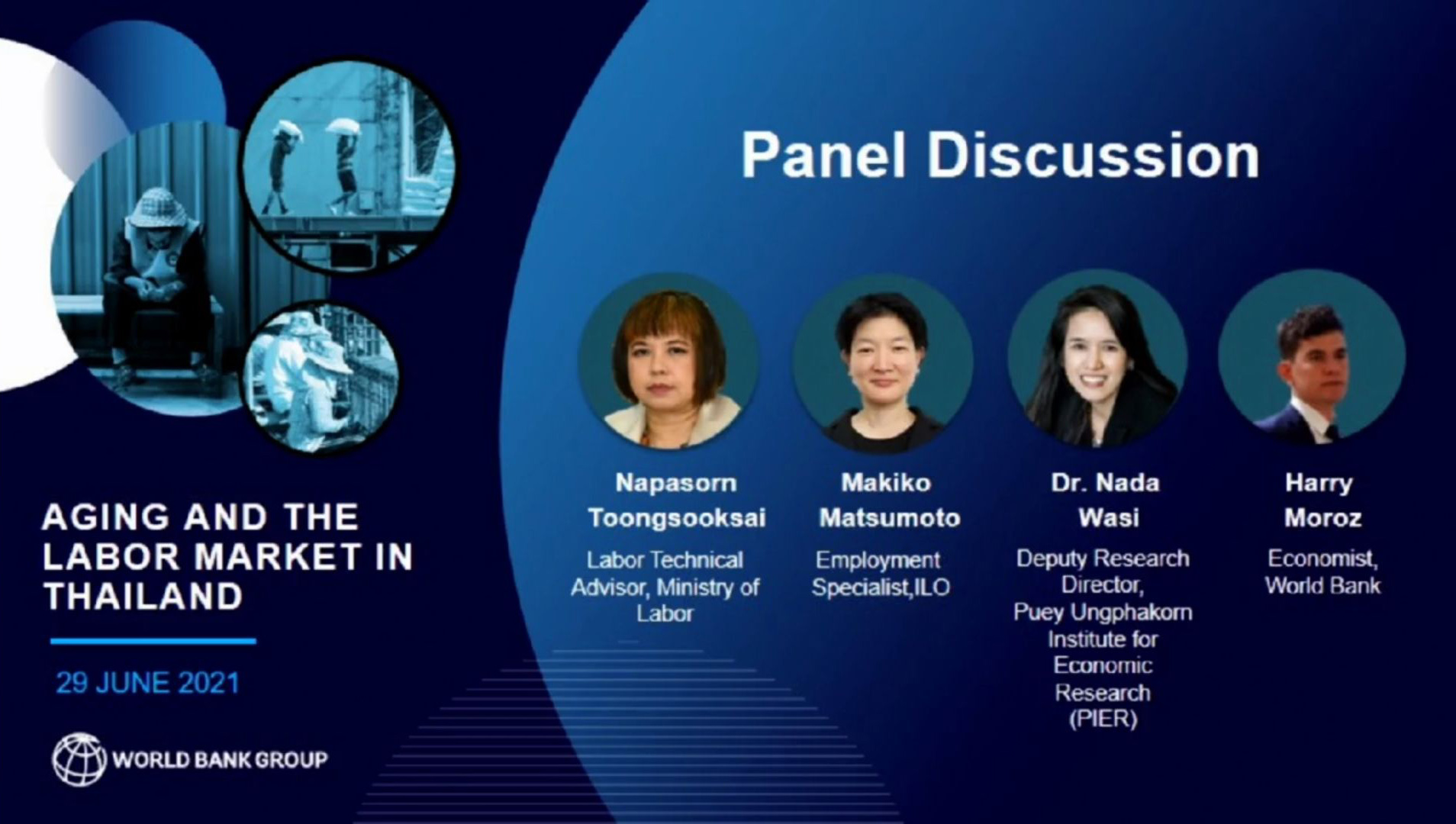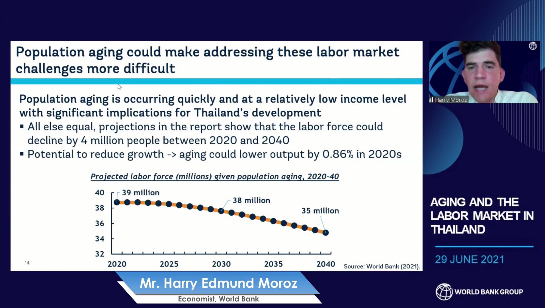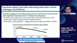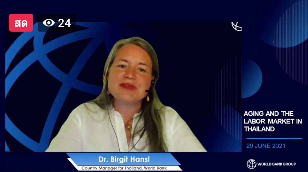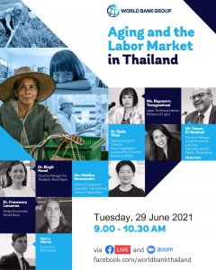 วันที่ 29 มิถุนายน 2564 เวลา 09.00 น. นายสุทธิ สุโกศล ปลัดกระทรวงแรงงาน มอบหมาย นางนภสร ทุ่งสุกใส ที่ปรึกษาวิชาการแรงงาน เป็นผู้แทนกระทรวงแรงงานเข้าร่วมการสัมมนาของธนาคารโลก ในหัวข้อ ภาวะประชากรสูงวัยและตลาดแรงงานในประเทศไทย ร่วมกับผู้แทนจากสถาบันวิจัยเศรษฐกิจป๋วย อึ๊งภากรณ์ และผู้แทนองค์การแรงงานระหว่างประเทศ (ILO) ในรูปแบบการประชุมทางไกลผ่านจอภาพ (Video Conference) ณ ห้องทำงานที่ปรึกษาวิชาการแรงงาน ชั้น 7 อาคารกระทรวงแรงงาน