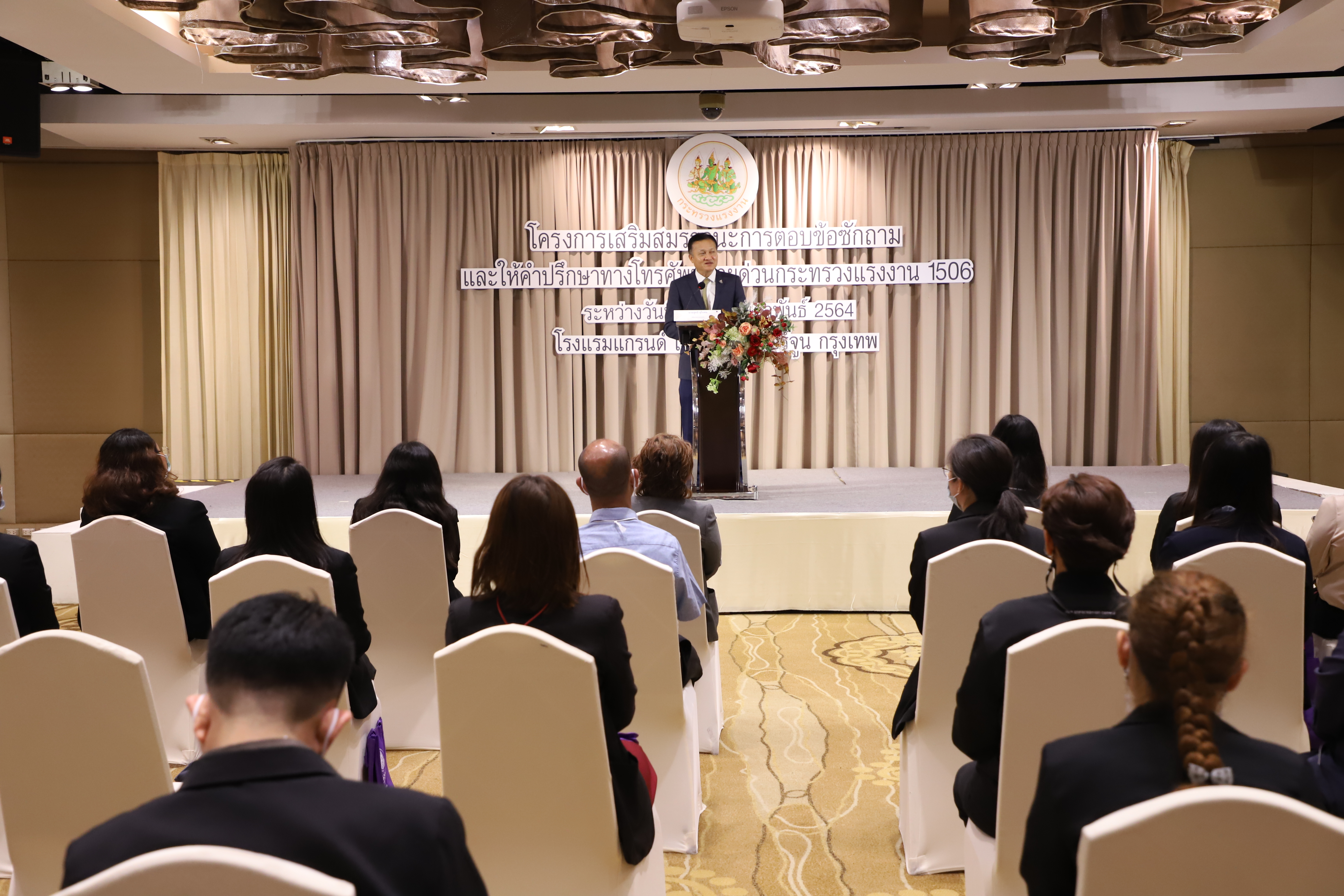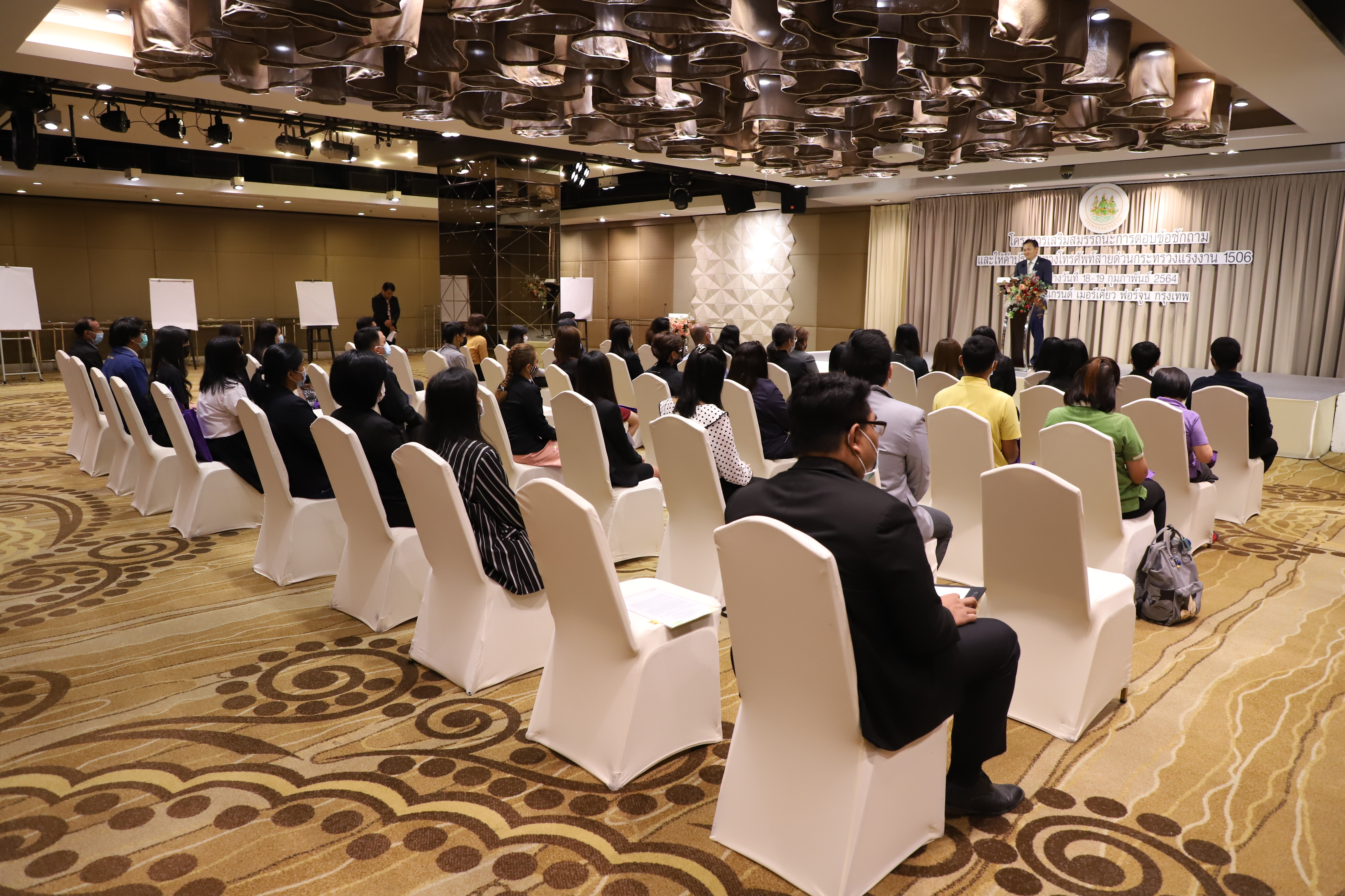 วันที่ 18 กุมภาพันธ์ 2564 เวลา 10.00 น. นายสุทธิ สุโกศล ปลัดกระทรวงแรงงาน เป็นประธานเปิดการอบรมโครงการสมรรถนะการตอบข้อซักถามและคำปรึกษาทางโทรศัพท์สายด่วนกระทรวงแรงงาน 1506 เพื่อจะให้บริการประชาชนได้อย่างมีประสิทธิภาพและประสิทธิพลมากยิ่งขึ้น ณ โรงแรมแกรนด์ เมอร์เคียว กรุงเทพ ฟอร์จูน ซึ่งผลจากการฝึกอบรมในครั้งนี้จะทำให้ผู้เข้าอบรมมีความรู้ ความเข้าใจเกี่ยวกับแนวทางในการตอบข้อซักถามและการแก้ไขปัญหาด้านแรงงานได้อย่างถูกต้อง รวดเร็ว ชัดเจมากยิ่งขึ้น รวมถึงจะได้ฝึกปฏิบัติบันทึกข้อมูลการรับเรื่องร้องเรียน/ร้องทุกข์ของกระทรวงแรงงานทางระบบ MIS เพื่ออำนวยความสะดวกให้แก่เจ้าหน้าที่ในการบันทึกข้อมูลสถิติการรับร้องเรียน/ร้องทุกข์ของกระทรวงแรงงานจากทุกช่องทาง และสามารถรายงานให้ผู้บริหารทราบอย่างมีประสิทธิภาพ โครงการฝึกอบรมครั้งนี้ ประกอบด้วย เจ้าหน้าที่ผู้ปฏิบัติงานสายด่วน กระทรวงแรงงาน 1506 ของทุกหน่วยงานในสังกัดกระทรวงแรงงาน เจ้าหน้าที่ที่เกี่ยวข้องจากสำนักงานปลัดกระทรวงแรงงาน รวมจำนวน 50 คน