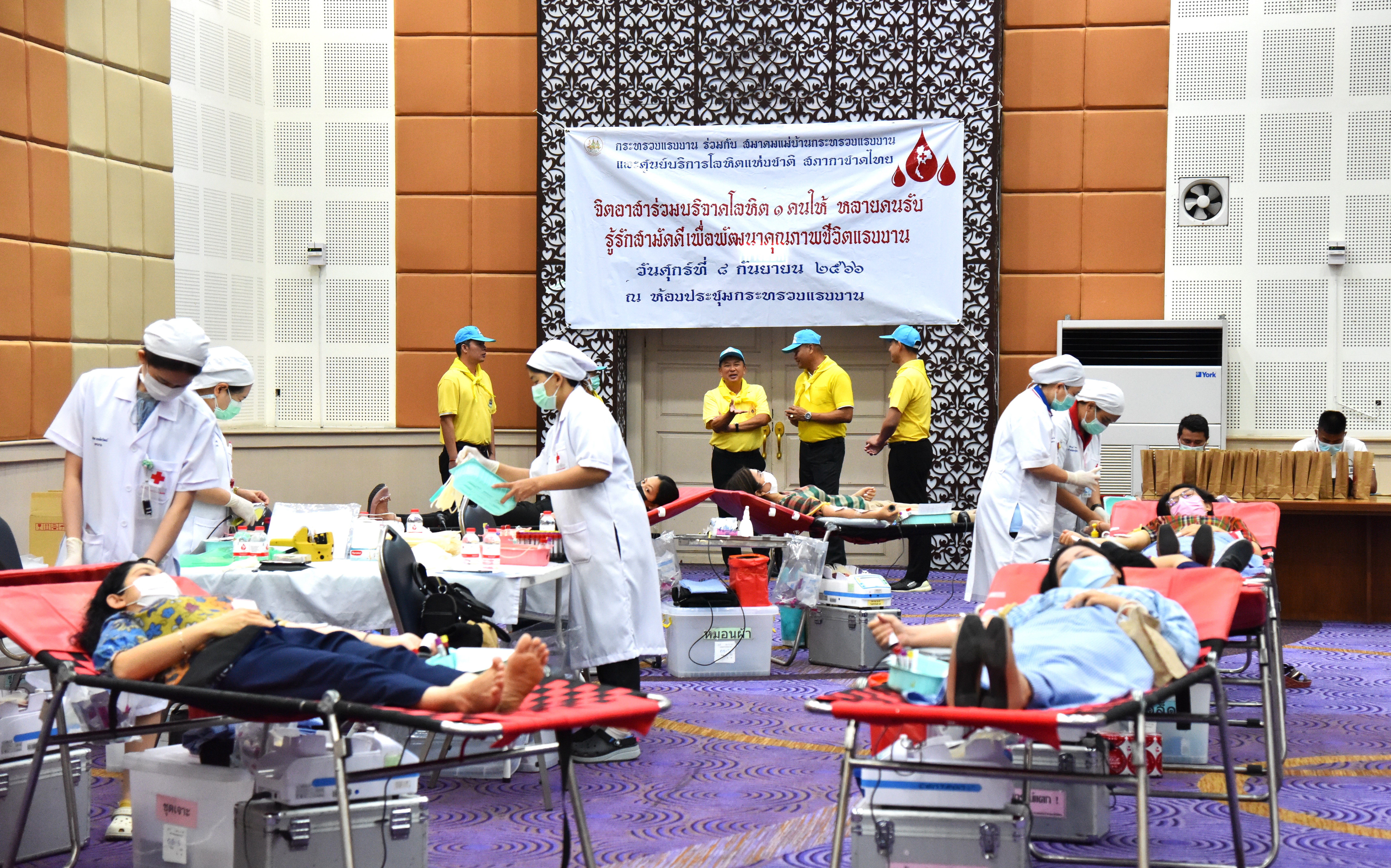 วันที่ 8 กันยายน 2566 เวลา 09.00 น. นายเดชา พฤกษ์พัฒนรักษ์ ผู้ช่วยปลัดกระทรวงแรงงาน พร้อมด้วยคณะกรรมการสมาคมฯ ตรวจเยี่ยมให้กำลังใจผู้บริจาคโลหิต โดยกระทรวงแรงงานร่วมกับสมาคมแม่บ้านกระทรวงแรงงาน และศูนย์บริการโลหิตแห่งชาติ สภากาชาดไทย ร่วมจัดกิจกรรมบริจาคโลหิต ภายใต้ชื่อกิจกรรม “จิตอาสาร่วมบริจาคโลหิต 1 คนให้ หลายคนรับ รู้รักสามัคคี พัฒนาคุณภาพชีวิตแรงงาน” ณ ห้องประชุมกระทรวงแรงงาน ชั้น 5 อาคารกระทรวงแรงงาน
