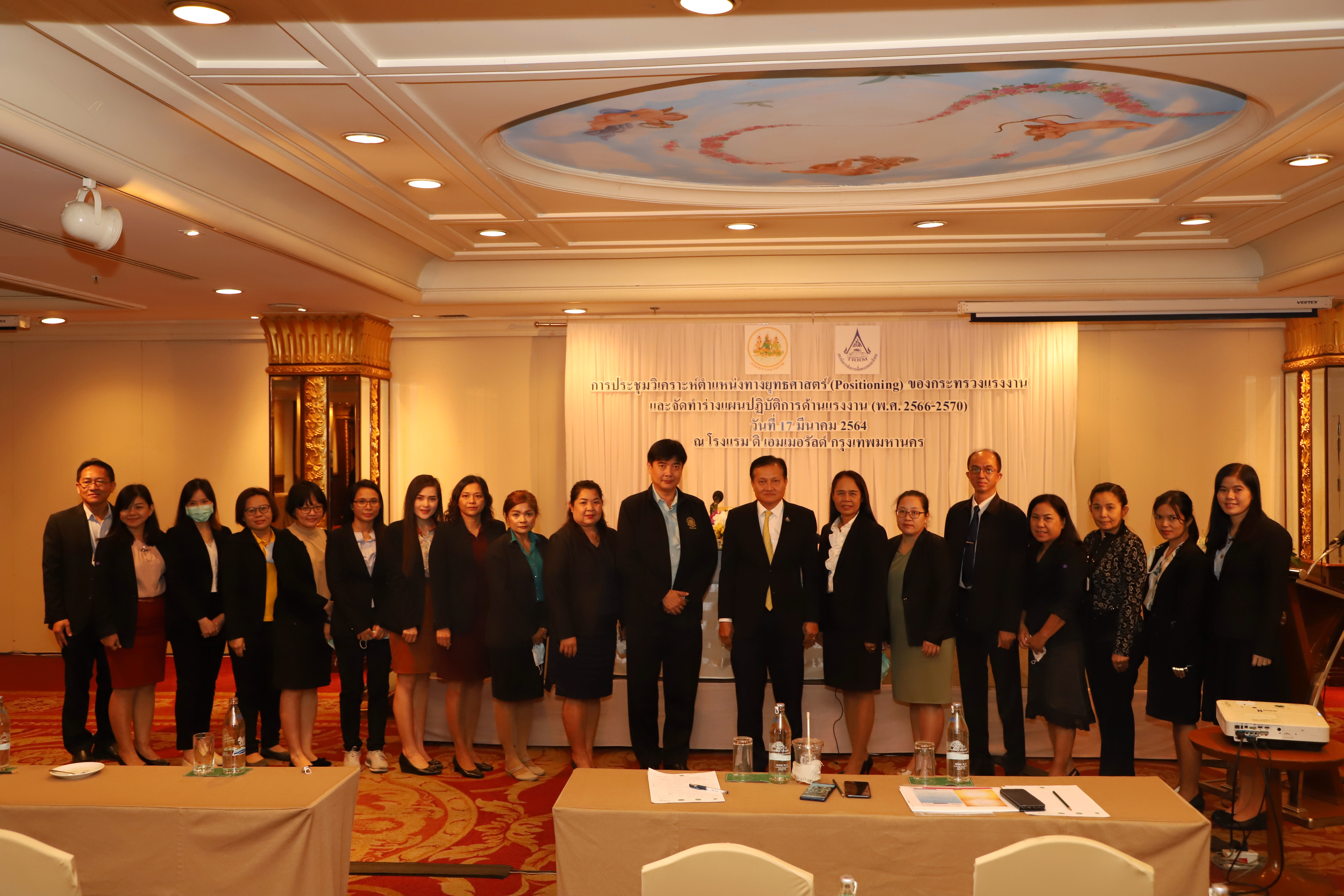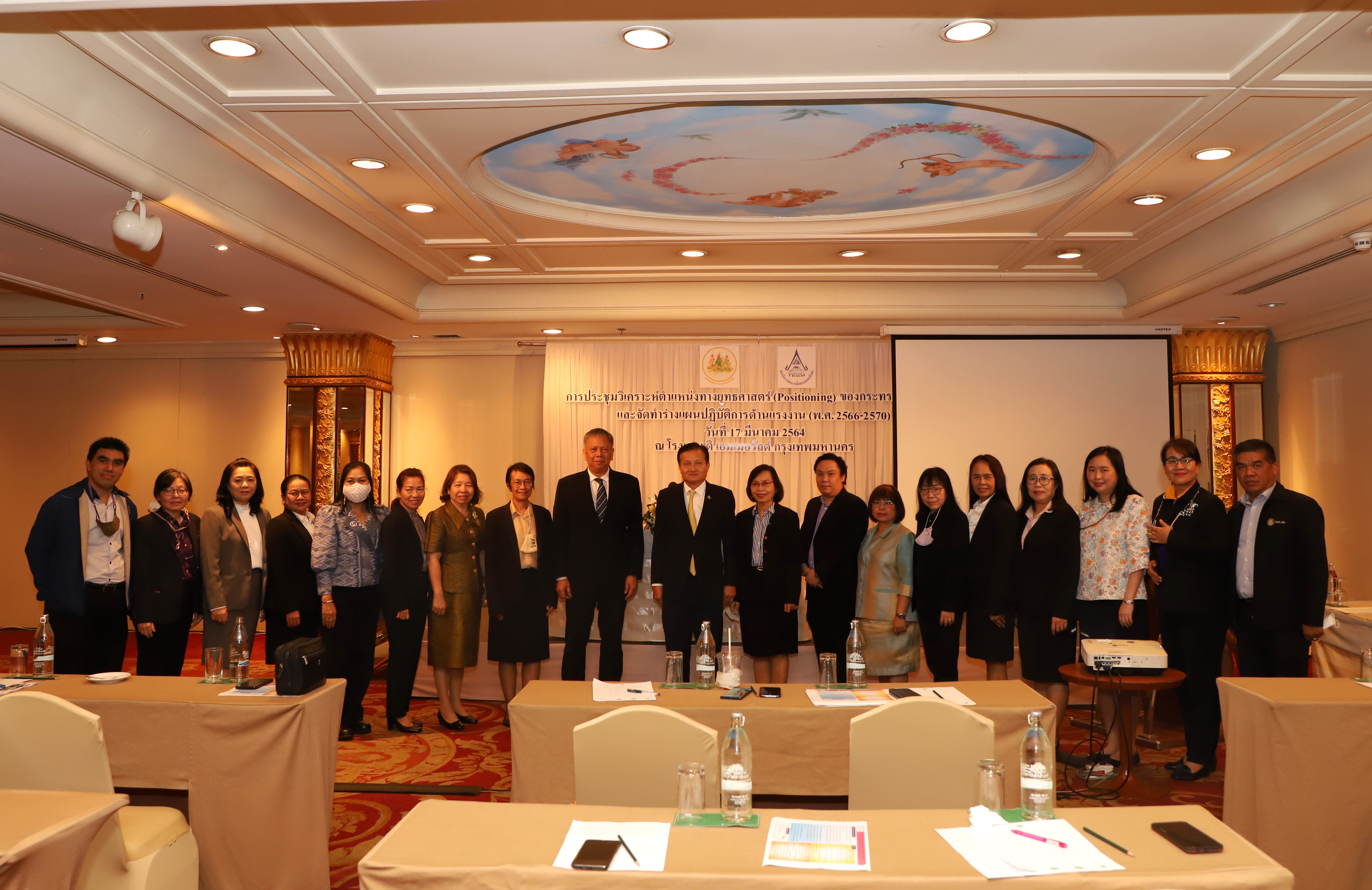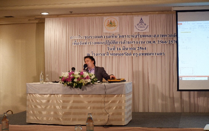 วันที่ 17 มีนาคม 2564 เวลา 09.30 น. นายสุทธิ สุโกศล ปลัดกระทรวงแรงงาน เป็นประธานเปิดการประชุมวิเคราะห์ตำแหน่งทางยุทธศาสตร์ (Positioning) และการจัดทำร่างแผนปฏิบัติการด้านแรงงาน (พ.ศ. 2566 –2570) ณ โรงแรมดิเอมเมอรัลด์ รัชดาภิเษก กรุงเทพมหานคร มีผู้เข้าร่วมประชุมจำนวน 6๐ คน ดังนี้ เลขาธิการสำนักงานประกันสังคม ผู้อำนวยการสำนักงานส่งเสริมความปลอดภัยอาชีวอนามัยและสิ่งแวดล้อมในการทำงาน (องค์กรมหาชน) ผู้ช่วยปลัดกระทรวงแรงงาน ที่ปรึกษาวิชาการแรงงาน และผู้อำนวยการสำนัก/ศูนย์/กอง/กลุ่ม แรงงานจังหวัด ข้าราชการและเจ้าหน้าที่ผู้ปฏิบัติงานด้านแผน โดยมีวัตถุประสงค์เพื่อศึกษาวิเคราะห์ความสอดคล้องเชื่อมโยงของแผนปฏิบัติการด้านแรงงาน (พ.ศ. 2566 –2570) กับแผนระดับที่ 1 ระดับที่ 2 ที่เกี่ยวข้อง และมาตรฐานสากลด้านแรงงาน บริบทด้านแรงงานที่เปลี่ยนแปลง ให้สะท้อนกรอบแนวคิดและทิศทางการทำงานด้านแรงงานเชิงรุก พร้อมรองรับต่อปัญหาแรงงาน ที่จะส่งผลต่อการทำให้แรงงานไทยมีศักยภาพสูงและคุณภาพชีวิตที่ดี และตอบสนองต่อภาพรวมการพัฒนาประเทศต่อไปในอนาคต