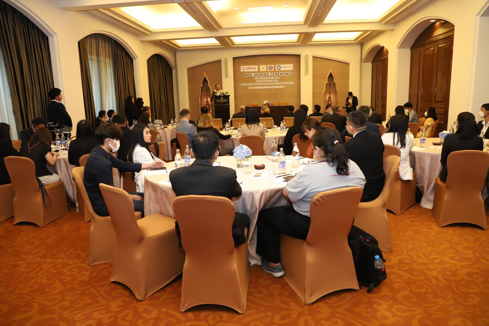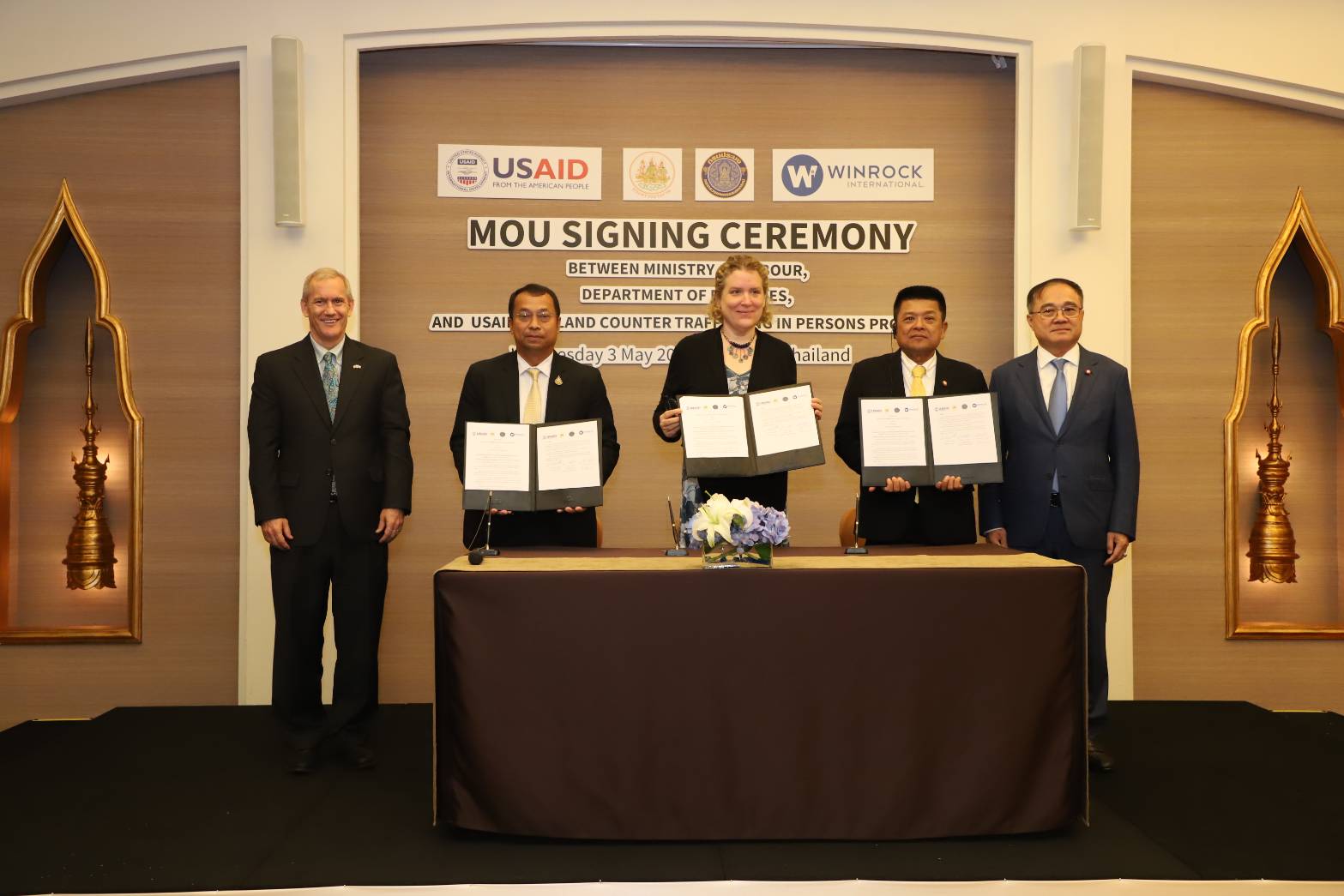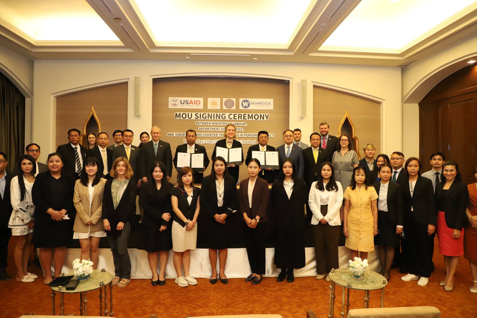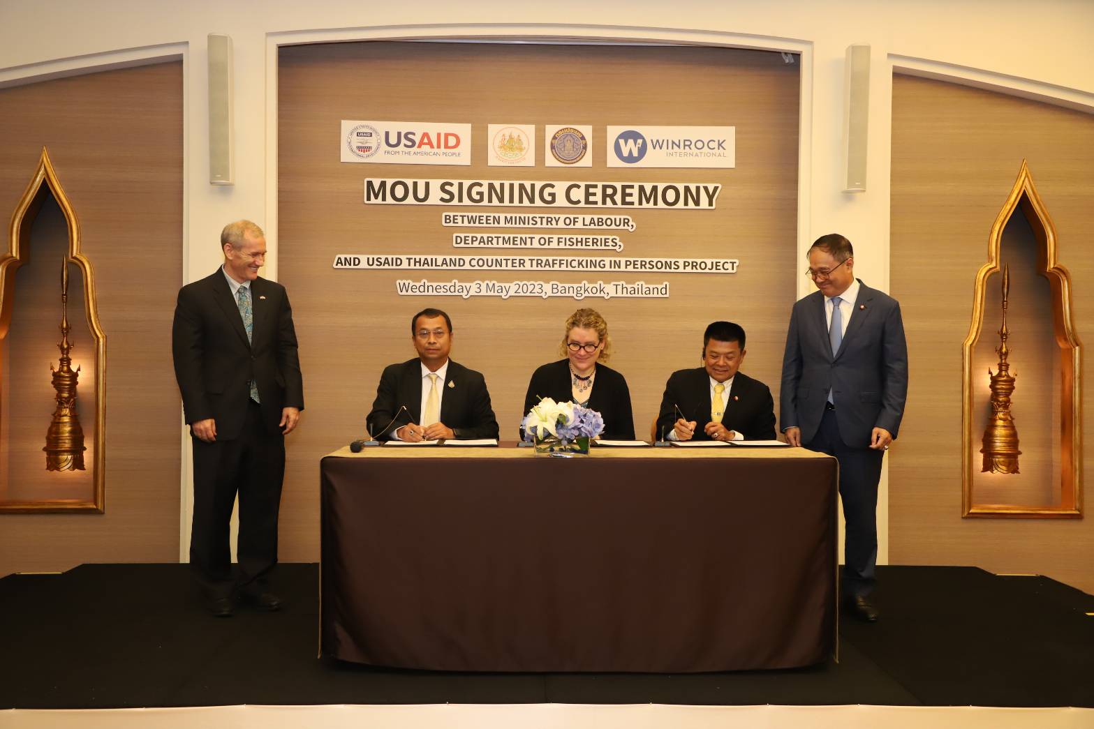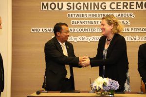 Police Lieutenant Colonel Dr. Thammasak thanked the Ministry of Labour, the Department of Fisheries, and relevant agencies involved in drafting the MOU. Most importantly, he thanked the United States Agency for International Development (USAID) and Winrock International in Thailand, who, together with the government, pushed for the Memorandum of Understanding, making it the origin of the signing ceremony today. The Ministry of Labour is the main and lead agency in the fight against human trafficking, taking on the primary responsibility of Thailand’s anti-trafficking efforts. This important government policy has been set up as a national agenda to raise protection standards and prevent Thai and migrant workers from becoming victims of human trafficking. The Department of Fisheries is another important agency. A series of operations for screening migrant workers in the sea fishing sector has already been established following the National Referral Mechanism (NRM) to screen vulnerable workers in 22 coastal provinces of Thailand. He asked all sectors to join forces as Team Thailand to drive the fight against human trafficking to eliminate forced labour and human trafficking in Thailand and continue to become ranked in the Trafficking in Persons Report as Tier 1.