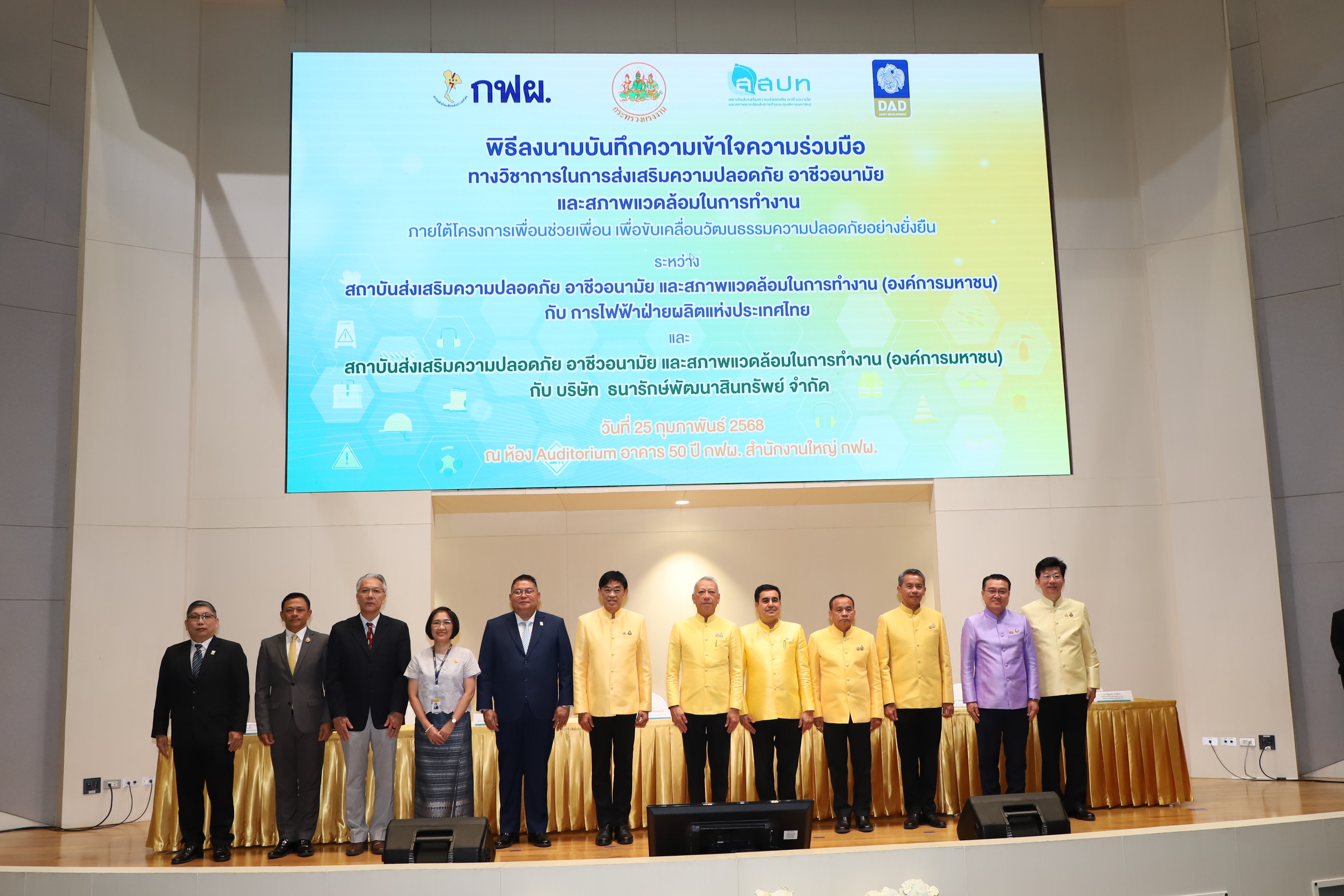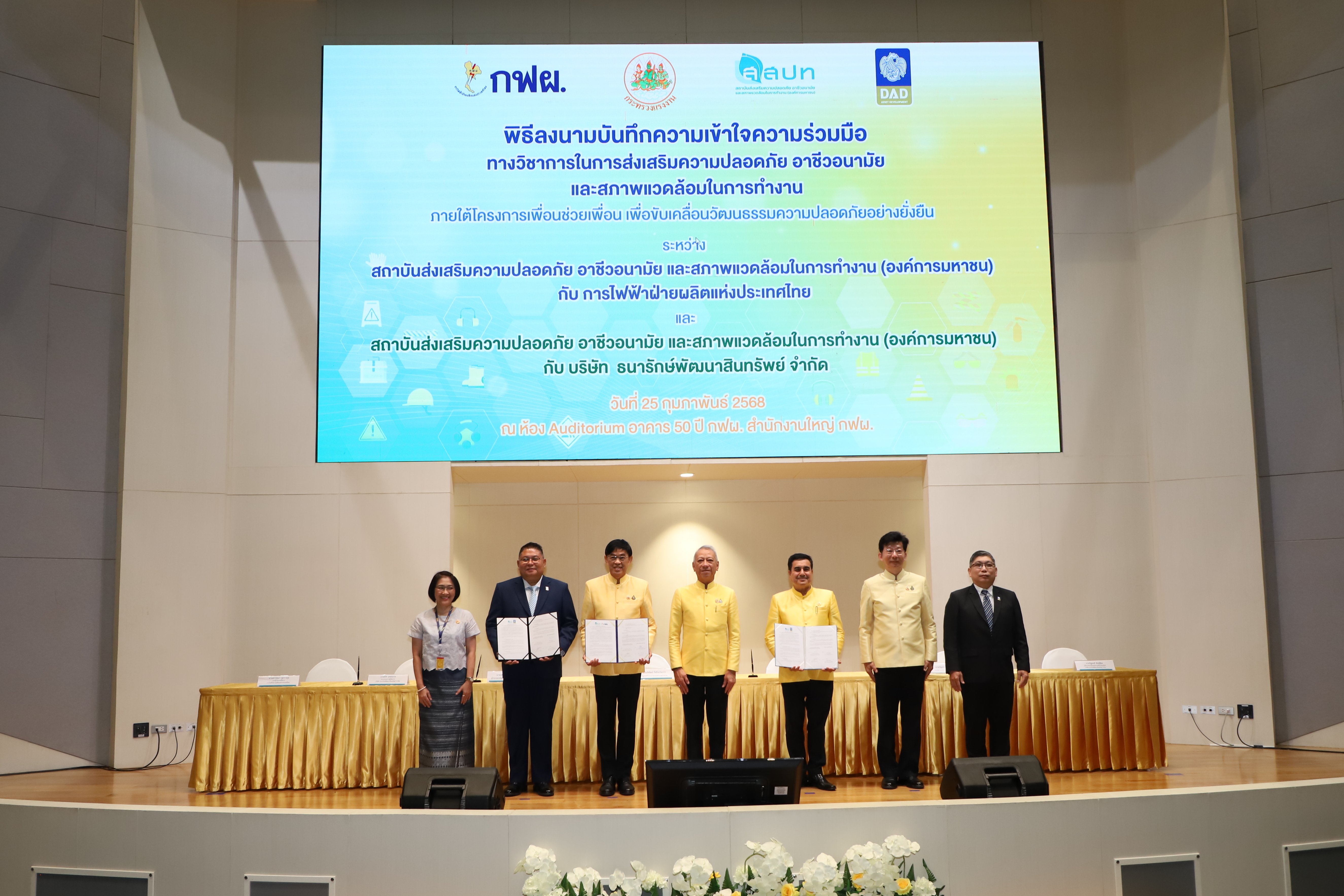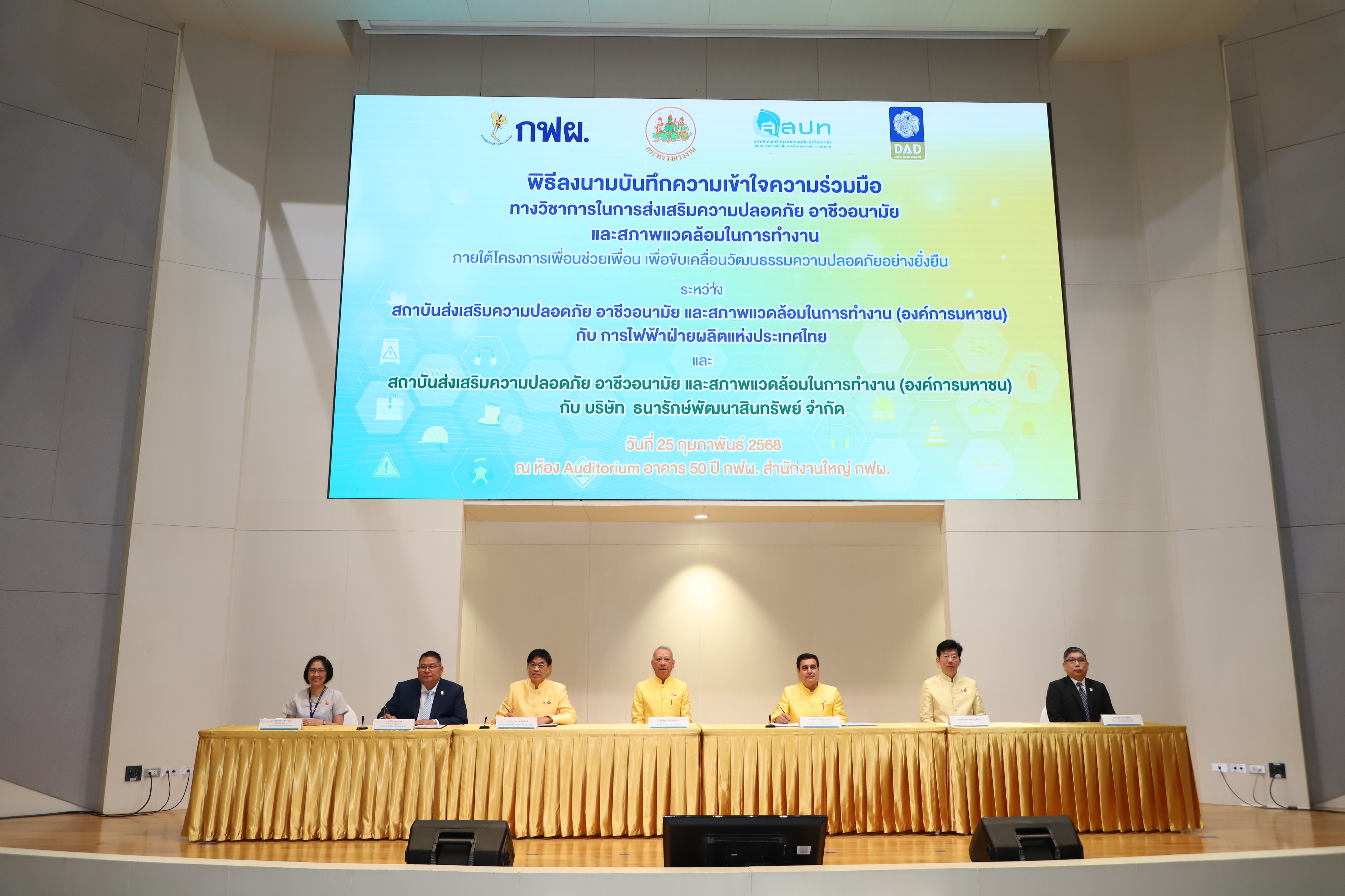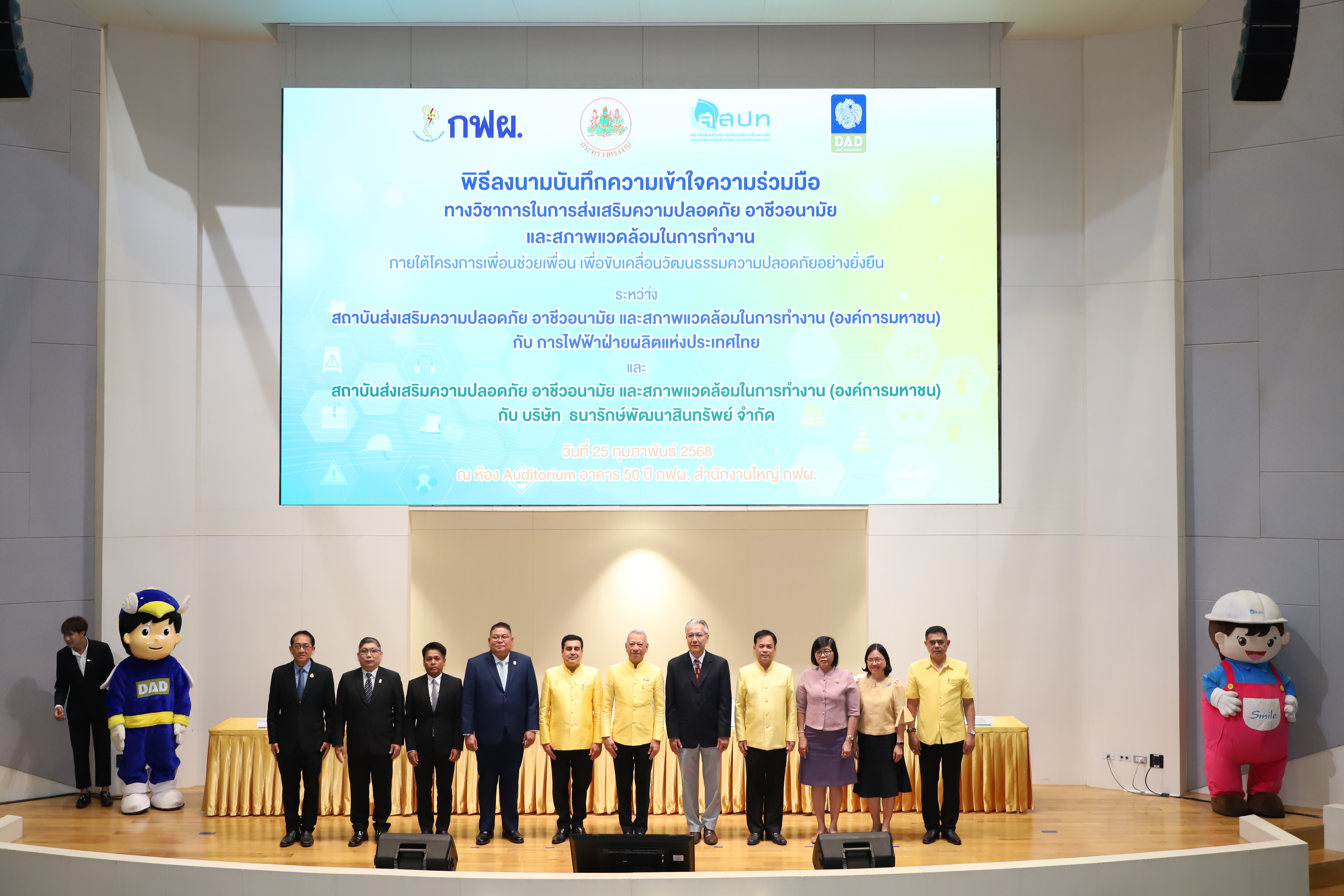 กระทรวงแรงงาน โดยสถาบันส่งเสริมความปลอดภัย อาชีวอนามัย และสภาพแวดล้อมในการทำงาน (องค์การมหาชน) ร่วมกับ การไฟฟ้าฝ่ายผลิตแห่งประเทศไทย (กฟผ.) และ บริษัท ธนารักษ์พัฒนาสินทรัพย์ จำกัด (ธพส.) เดินหน้าสร้างมาตรฐานความปลอดภัยในการทำงานสู่สถานประกอบการในห่วงโซ่อุปทาน (Supply Chain) ผ่านโครงการ “เพื่อนช่วยเพื่อนเพื่อขับเคลื่อนวัฒนธรรมความปลอดภัยอย่างยั่งยืน” ภายใต้แคมเปญ “ส่งต่อความปลอดภัย…ส่งต่อความห่วงใยระหว่างกัน” ตั้งเป้าขยายแนวปฏิบัติด้านความปลอดภัยไปยังสถานประกอบการกว่า 200 แห่ง ทั่วประเทศ“ยกระดับมาตรฐานความปลอดภัย ลดอุบัติเหตุในการทำงาน”