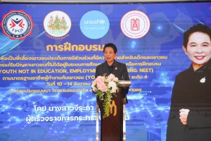 นางสาวจีระภา กล่าวต่อว่า กระทรวงแรงงาน ตระหนักถึงความซับซ้อนของปัญหานี้ จึงได้ร่วมกับ องค์การยูนิเซฟ ประเทศไทย และภาคีเครือข่าย เพื่อขับเคลื่อนการแก้ไขปัญหาอย่างบูรณาการ โดยเราได้ถอดบทเรียนความสำเร็จจากโครงการนำร่องในพื้นที่จังหวัดชายแดนภาคใต้ และในปีนี้ เรากำลังขยายผลการดำเนินงานไปยัง 10 จังหวัดเป้าหมายทั่วทุกภูมิภาค รวมถึงพื้นที่นำร่องเดิมอีก 2 จังหวัด ซึ่งกระทรวงแรงงานทำงานหน่วยงานเดียวไม่ได้ เราต้องอาศัยความร่วมมือจากภาคเอกชน ท้องถิ่นและชุมชน ในการส่งต่อเยาวชนเข้าสู่โอกาสที่เหมาะสม ไม่ว่าจะเป็นการศึกษาต่อ การฝึกอาชีพหรือการจ้างงาน หัวใจสำคัญของโครงการนี้ คือ “กลไกในระดับพื้นที่” เพราะบริบท ปัญหา และวิถีชีวิตของเยาวชนในแต่ละจังหวัดนั้นแตกต่างกัน คนที่จะเข้าถึงและเข้าใจเยาวชนได้ดีที่สุด ไม่ใช่ส่วนกลาง แต่คือ ท่านทั้งหลายที่นั่งอยู่ที่นี่ โดยเฉพาะ บัณฑิตแรงงาน และอาสาสมัครแรงงาน ท่านคือ”โซ่ข้อกลาง” ที่เชื่อมโยงนโยบายไปสู่การปฏิบัติจริง ท่านคือผู้ที่จะลงไปเคาะประตูบ้าน ค้นหา พูดคุย และจูงมือเยาวชนเหล่านั้นให้กลับเข้าสู่โอกาสอีกครั้ง