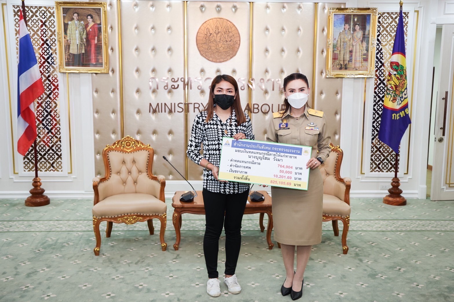 นางธิวัลรัตน์ กล่าวต่อว่า ในวันนี้ กระทรวงแรงงาน โดยสำนักงานประกันสังคม ได้มอบสิทธิประโยชน์เงินทดแทนกรณีเสียชีวิตเนื่องจากการทำงานให้แก่นายจ้าง ทายาทและผู้มีสิทธิ มีสิทธิได้รับเงินทดแทนตามพระราชบัญญัติเงินทดแทน พ.ศ.2537 และเงินบำเหน็จชราภาพกองทุนประกันสังคม แก่ญาติจำนวน 3 ราย ได้แก่ รายแรก คุณเกวรีชัย คำมิ่ง ญาติของนางบุญโฮม วังมา อายุ 42 ปี จะได้ค่าทำศพ 50,000 บาท ค่าทดแทน อัตราเดือนละ 6,374.20 บาทเป็นเวลา 10 ปี เป็นเงิน 764,904 บาท และเงินบำเหน็จชราภาพกรณีเสียชีวิต 10,201.69 บาทรวมเป็นเงินทั้งหมด 825,105.69 บาท รายที่สอง คุณปรัชญา บุญภักดี ญาติของนางประไพ สุปมา จะได้ค่าทำศพ 50,000 บาท ค่าทดแทน อัตราเดือนละ 6,428.80 บาท เป็นเวลา 10 ปี เป็นเงิน 771,456 บาท และเงินบำเหน็จชราภาพกรณีเสียชีวิต 63,064.83 บาท รวมเป็นเงินทั้งหมด884,520.83 บาท รายที่สาม คุณฟัรฮาน มะลูล้อง ญาติของนางอุดร เลขสันต์ จะได้ค่าทำศพ50,000 บาท ค่าทดแทน อัตราเดือนละ 6,447 บาท เป็นเวลา 10 ปี เป็นเงิน 773,640 บาท และเงินบำเหน็จชราภาพกรณีเสียชีวิต 74,835.08 บาท รวมเป็นเงินทั้งหมด 898,475.08 บาท รวมทั้ง 3 รายเป็นเงินทั้งสิ้นเป็นจำนวนเงิน 2,608,101.6 บาท
