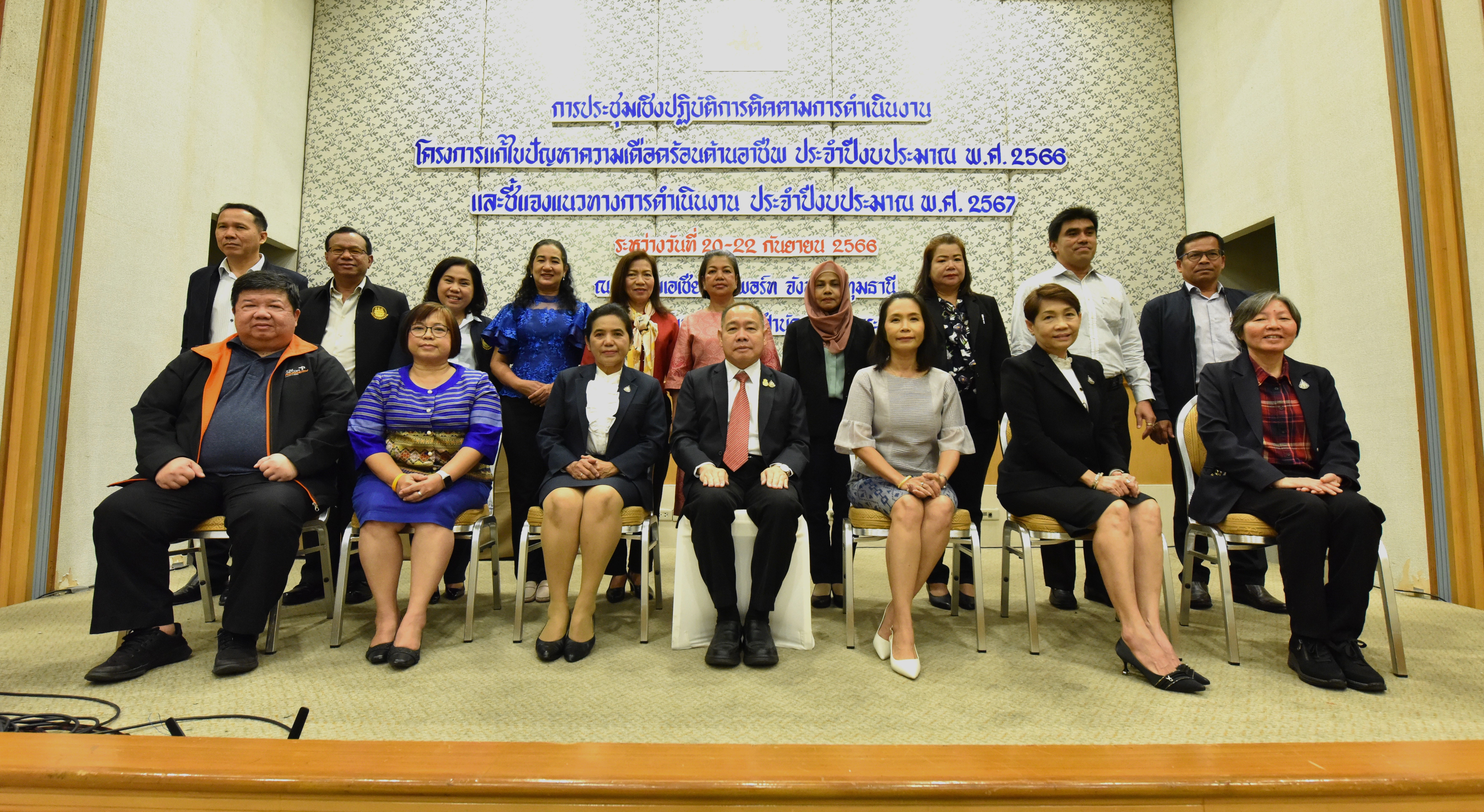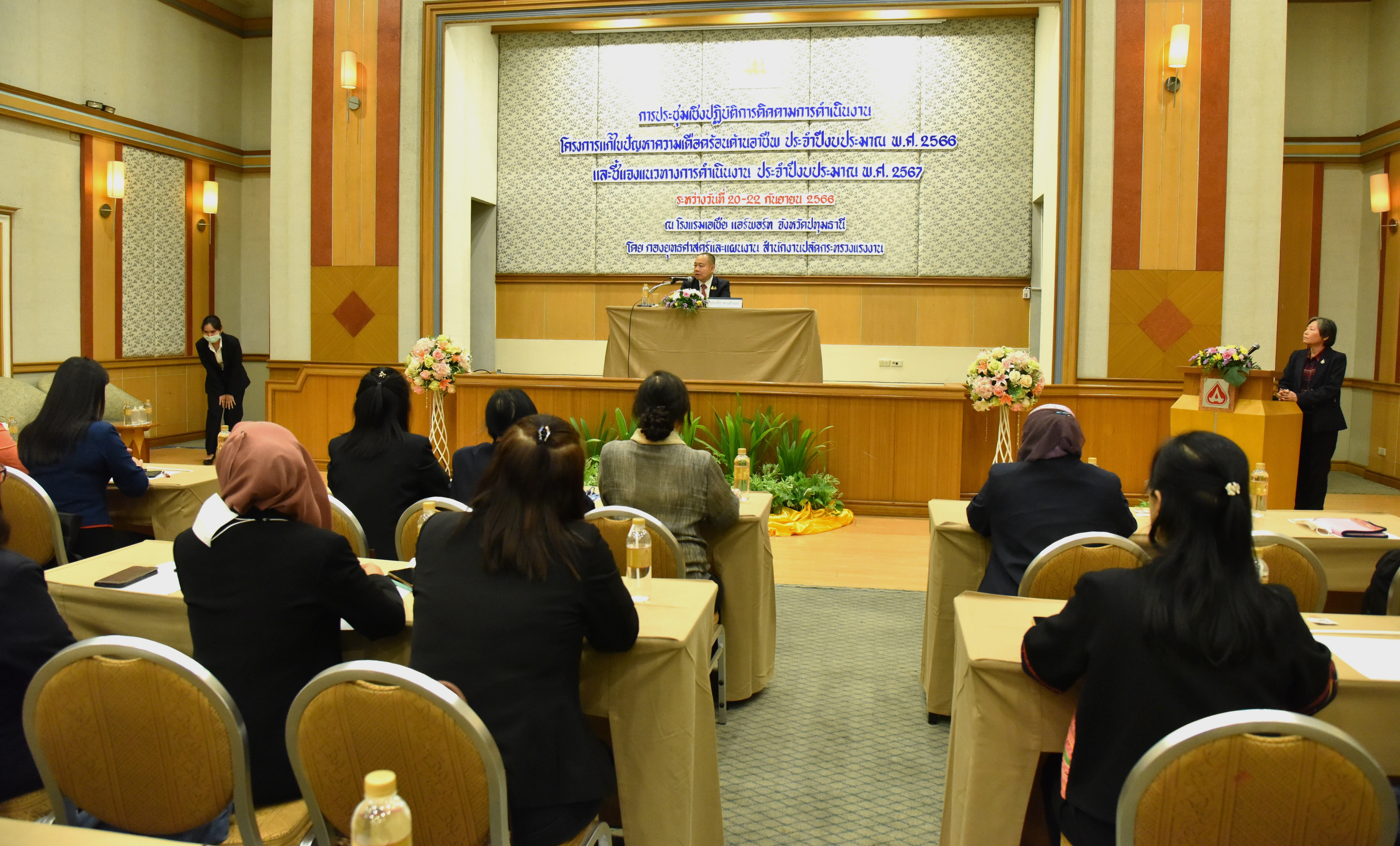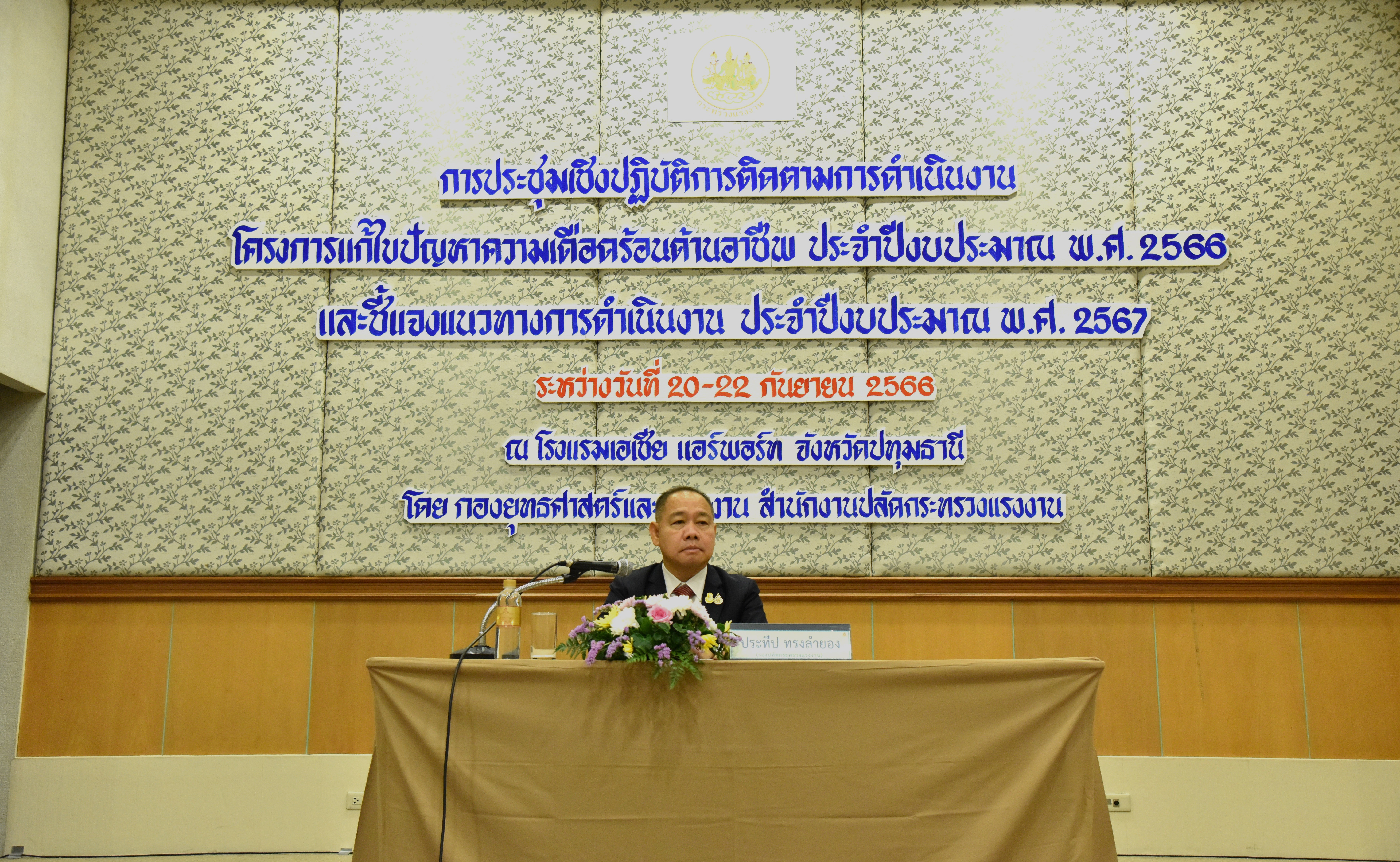 On September 21, 2023, at 09.30 hours, the Deputy Permanent Secretary of Labour, Mr. Prateep Songlamyong, chaired the opening of a workshop to follow up on the performance of the project to solve occupational issues for the 2023 fiscal year and explained operational guidelines for the 2024 fiscal year. The occasion took place at the Dusita Meeting Room, Asia Airport Hotel, Lam Luk Ka District, Pathum Thani Province. He said that this meeting is a follow-up of performance and operational guidelines for the following year to drive the national strategy. This is a determination that every government agency must carry out its work and is considered very important to the Ministry of Labour. The present situation is faced with many challenging labour issues. It was also created when the labour situation rapidly changed and became increasingly challenging. It is well known that from 2020 to 2023, the Ministry of Labour had to work hard, as it is an agency caring for people directly affected by the COVID-19 outbreak. The Ministry of Labour does not solve problems or work to achieve only macro results, but it must be done quickly and in time with the situation at every stage. This causes the need to adjust laws, issue measures, and continuously set new policies and projects to help the many affected workers in the past year. Therefore, it is a good principle to follow up on and present the operational guidelines for the 2024 fiscal year, which will lead to the creation of important projects in the future. He asked that everyone use their knowledge, experiences, and ideas to the fullest and provide maximum benefit to the people.