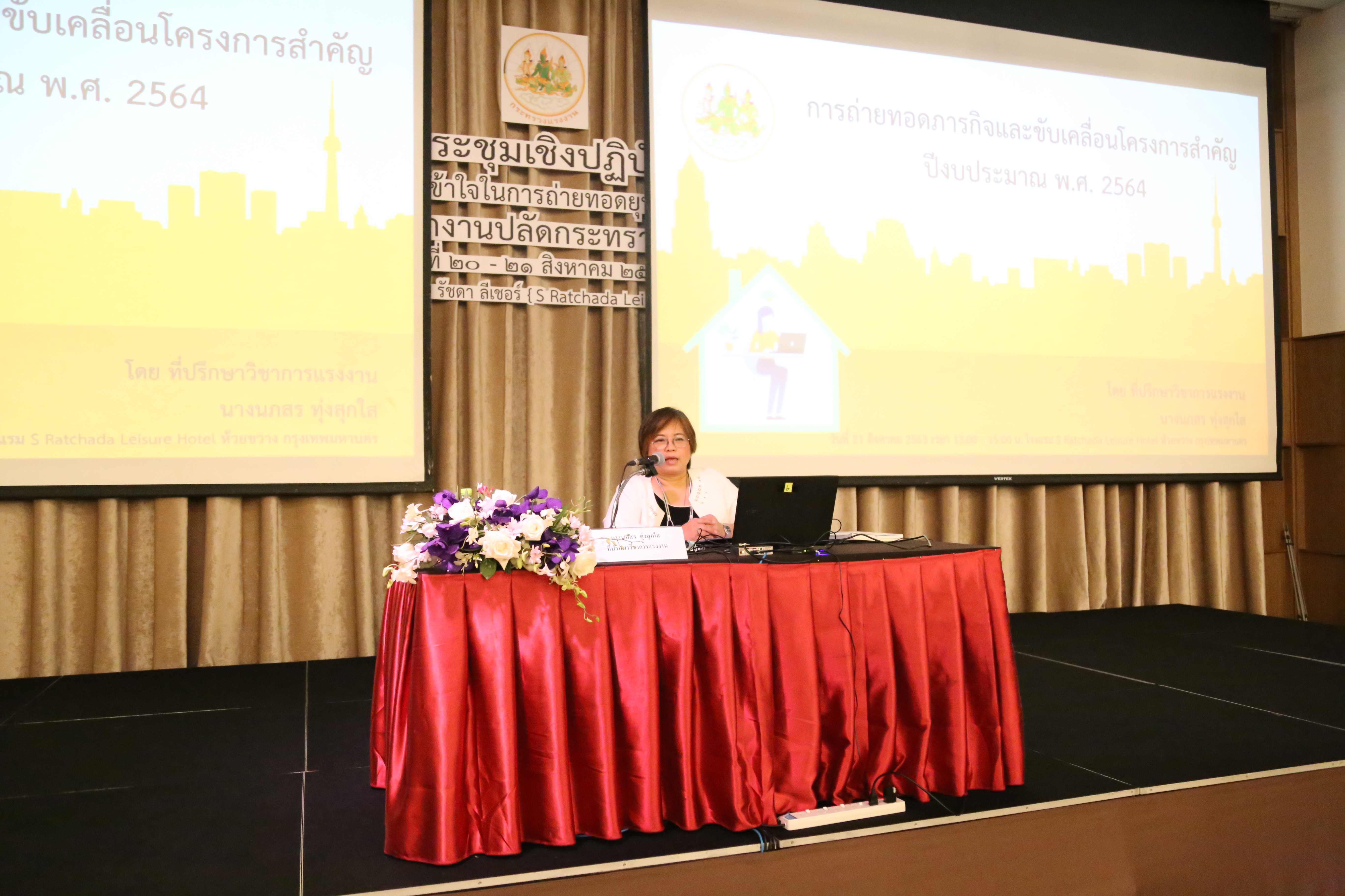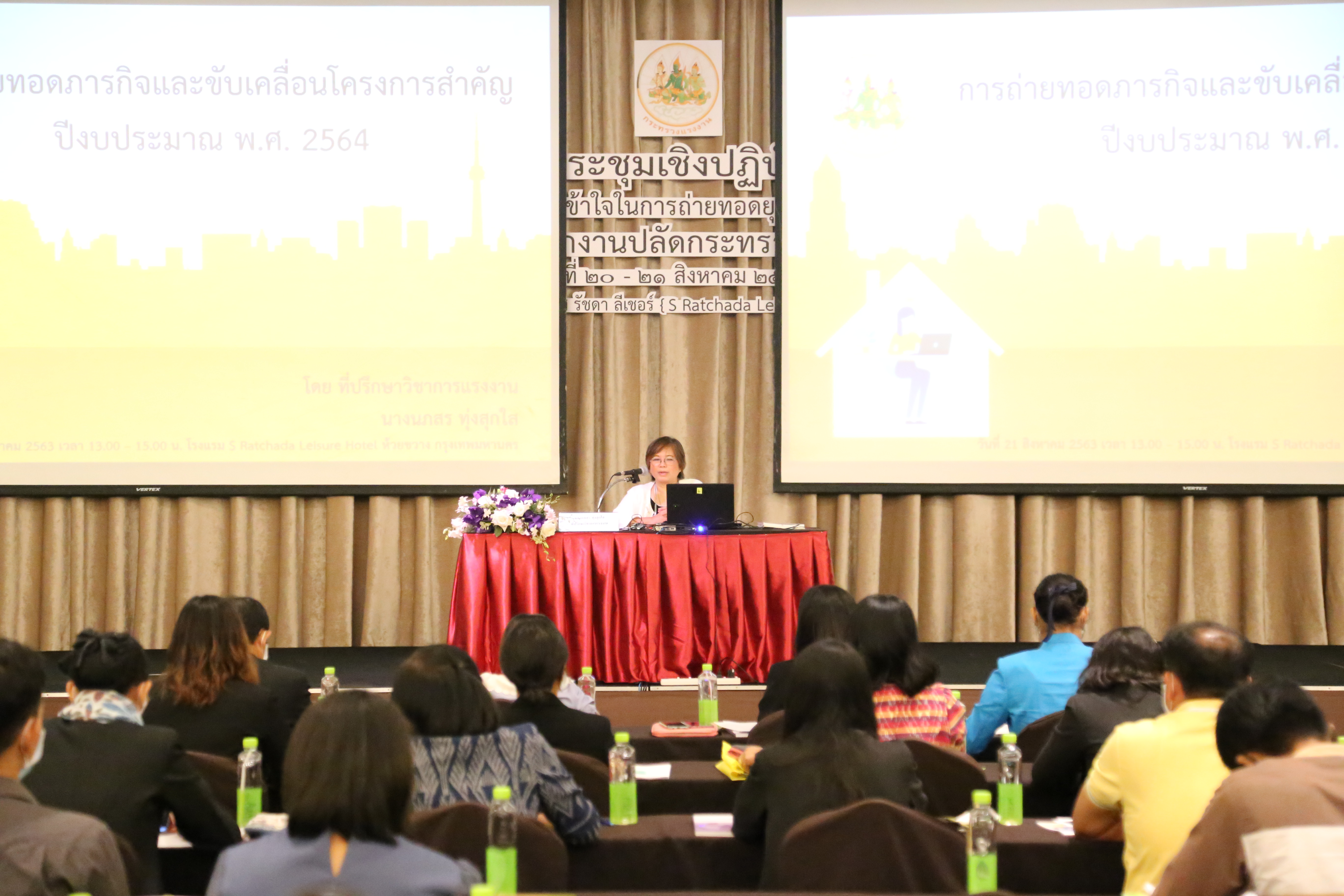 วันที่ ๒๐ สิงหาคม ๒๕๖๓ เวลา ๐๙.๓๐ น. นายสุทธิ สุโกศล ปลัดกระทรวงแรงงาน มอบหมายให้ นางนภสร ทุ่งสุกใส ผู้ตรวจราชการกรม การจัดหางาน รักษาการในตำแหน่งที่ปรึกษาวิชาการแรงงาน เป็นประธานเปิดการประชุมเชิงปฏิบัติการเพื่อสร้างความรู้ความเข้าใจในการถ่ายทอดยุทธศาสตร์ไปสู่การปฏิบัติ และบรรยายพิเศษ ภารกิจด้านแรงงาน ความท้าทายกับจุดหมายก้าวไปข้างหน้า ณ โรงแรม S Ratchada Leisure Hotel ห้วยขวาง กรุงเทพมหานคร โดยกล่าวว่า ปัจจุบันกระทรวงแรงงานมีส่วนสนับสนุนในการขับเคลื่อนการพัฒนาประเทศ โดยมีโครงการมากถึง ๒๓๑ โครงการ ที่สนับสนุนระดับความสำเร็จตัวชี้วัดตามแผนยุทธศาสตร์ชาติ จำนวน ๕ ยุทธศาสตร์ ๘ ประเด็น ตามแผนแม่บทภายใต้ยุทธศาสตร์ชาติ ๑๖ ประเด็นหลัก ประเด็นเร่งด่วนตามนโยบายรัฐบาล ๑๒ ด้าน เป้าหมายการพัฒนาที่ยั่งยืนของโลก SDG จำนวน ๑๗ เรื่อง และยังมีตัวชี้วัดอีกมากมายที่เข้าไปเกี่ยวข้อง เช่น ตัวชี้วัดการจัดอันดับขีดความสามารถในการแข่งขันของประเทศ โดยสถาบัน IMD หรือตัวชี้วัดการจัดอันดับประเทศที่มีสถานการณ์การค้ามนุษย์ ตามรายงาน TIP Report เป็นต้น