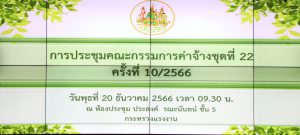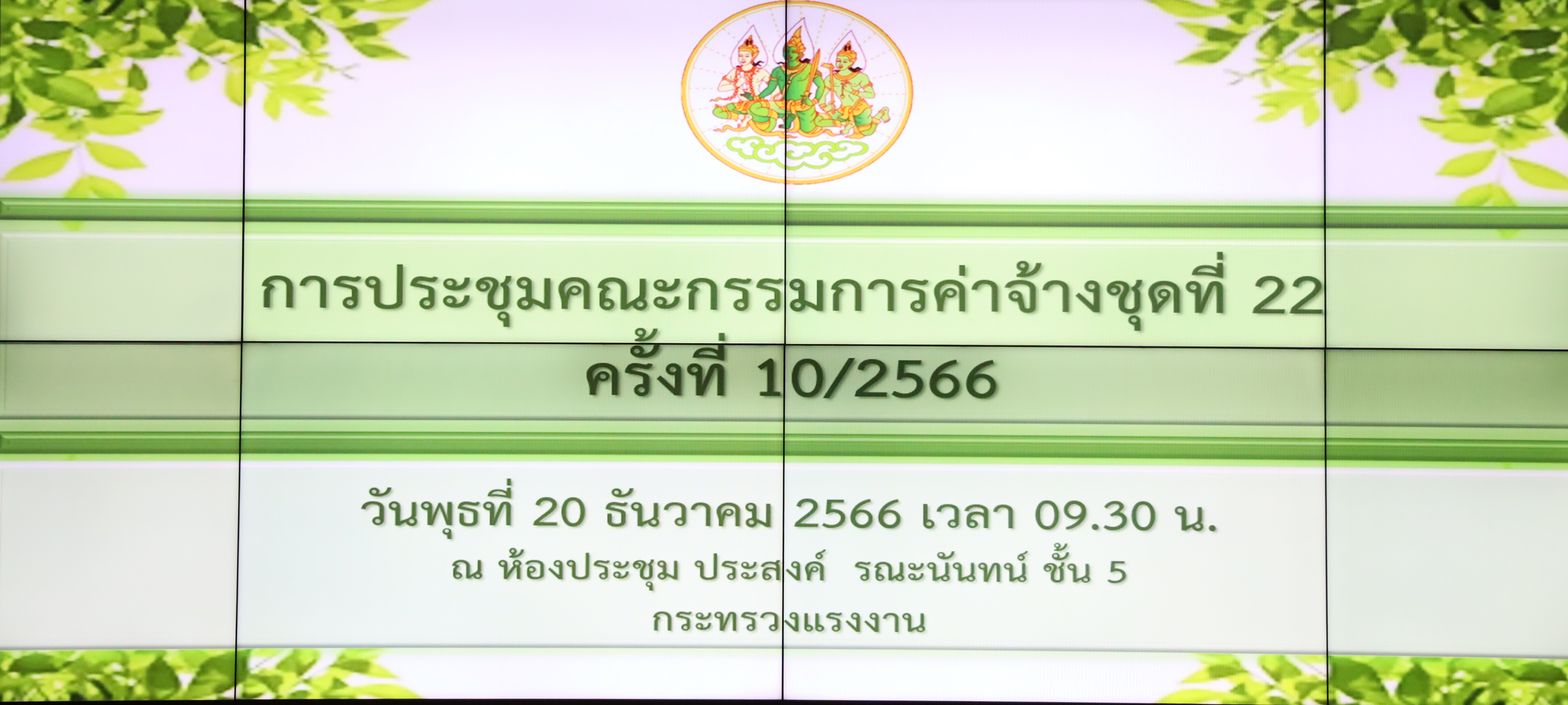 วันที่ 20 ธันวาคม 2566 เวลา 9.30น. นายไพโรจน์ โชติกเสถียร ปลัดกระทรวงแรงงาน เป็นประธานประชุมคณะกรรมการค่าจ้าง ชุดที่ 22 ครั้งที่ 10/2566 โดยมี นายเดชา พฤกษ์พัฒนรักษ์ รองปลัดกระทรวงแรงงาน นางโสภา เกียรตินิรชา ผู้ตรวจราชการกระทรวงแรงงานรักษาราชการแทนอธิบดีกรมสวัสดิการและคุ้มครองแรงงาน รวมถึงกรรมการผู้แทนภาครัฐ กรรมการผู้แทนฝ่ายนายจ้าง กรรมการผู้แทนฝ่ายลูกจ้าง และเจ้าหน้าที่ที่เกี่ยวข้องเข้าร่วมประชุม ณ ห้องประชุมประสงค์ รณะนันทน์ ชั้น 5 อาคารกระทรวงแรงงาน