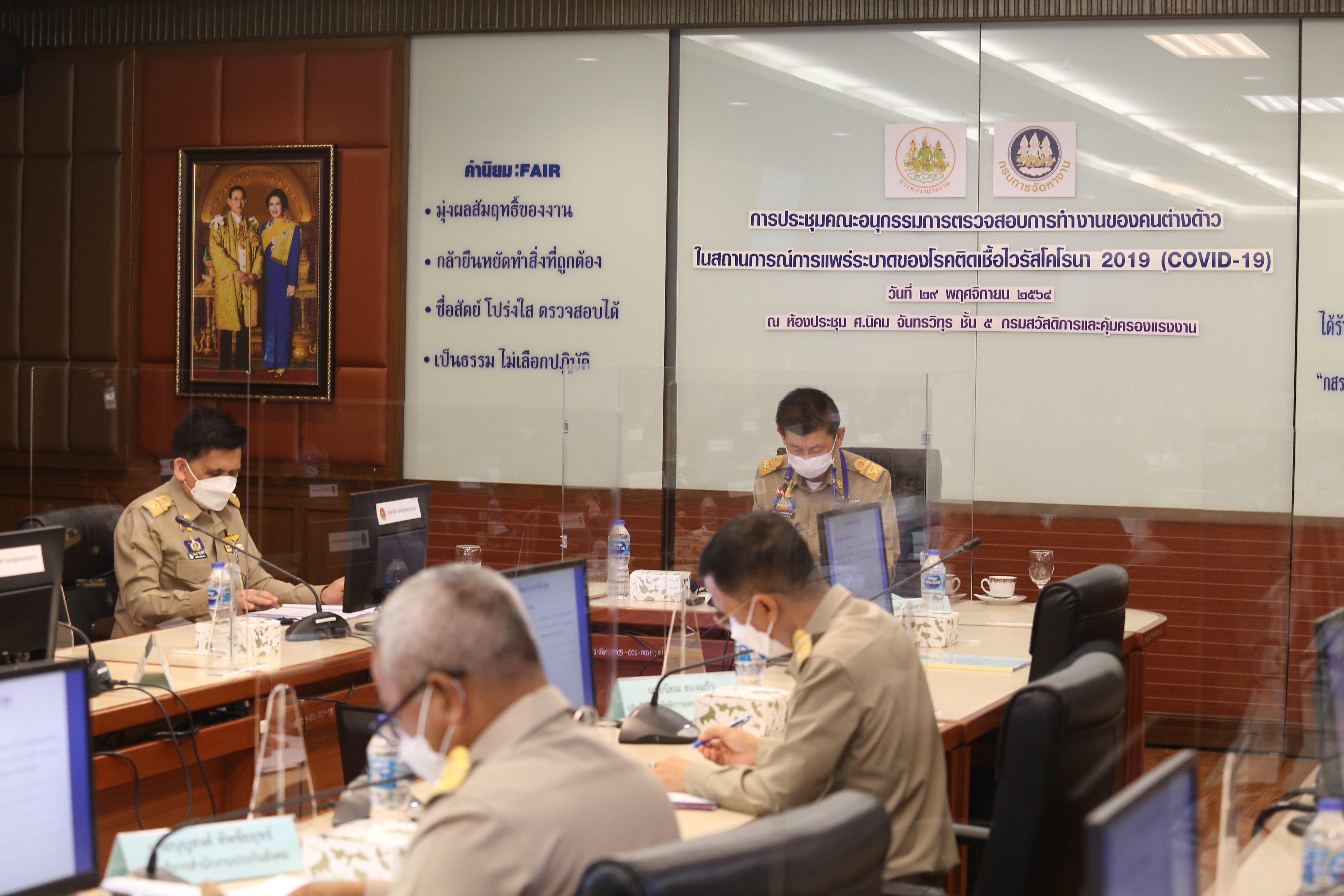 วันที่ 29 พฤศจิกายน 2564 เวลา 13.30 น. นายบุญชอบ สุทธมนัสวงษ์ ปลัดกระทรวงแรงงาน เป็นประธานการประชุมคณะอนุกรรมการตรวจสอบการทำงานของคนต่างด้าวในสถานการณ์การแพร่ระบาดของโรคติดเชื้อไวรัสโคโรนา 2019 (COVID-19) โดยที่ประชุมได้พิจารณา แต่งตั้งคณะทำงานอำนวยการและชุดเฉพาะกิจ ตรวจสอบ ปราบปราม การใช้แรงงานต่างด้าวผิดกฎหมาย เพื่อสนับสนุนการควบคุมและป้องกันการแพร่ระบาดของโรคติดเชื้อไวรัสโคโรนา 2019 ตามมติคณะรัฐมนตรีเมื่อวันที่ 28 กันยายน 2564 และการค้ามนุษย์ด้านแรงงาน และระยะเวลาดำเนินการและกลุ่มเป้าหมายในการตรวจสอบ ปราบปราม จับกุม และดำเนินคดีนายจ้าง/สถานประกอบการ และแรงงานต่างด้าวผิดกฎหมาย ณ ห้องประชุม ศ.นิคม จันทรวิทุร ชั้น 5 กรมสวัสดิการและคุ้มครองแรงงาน อาคารกระทรวงแรงงาน