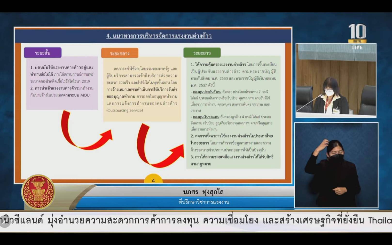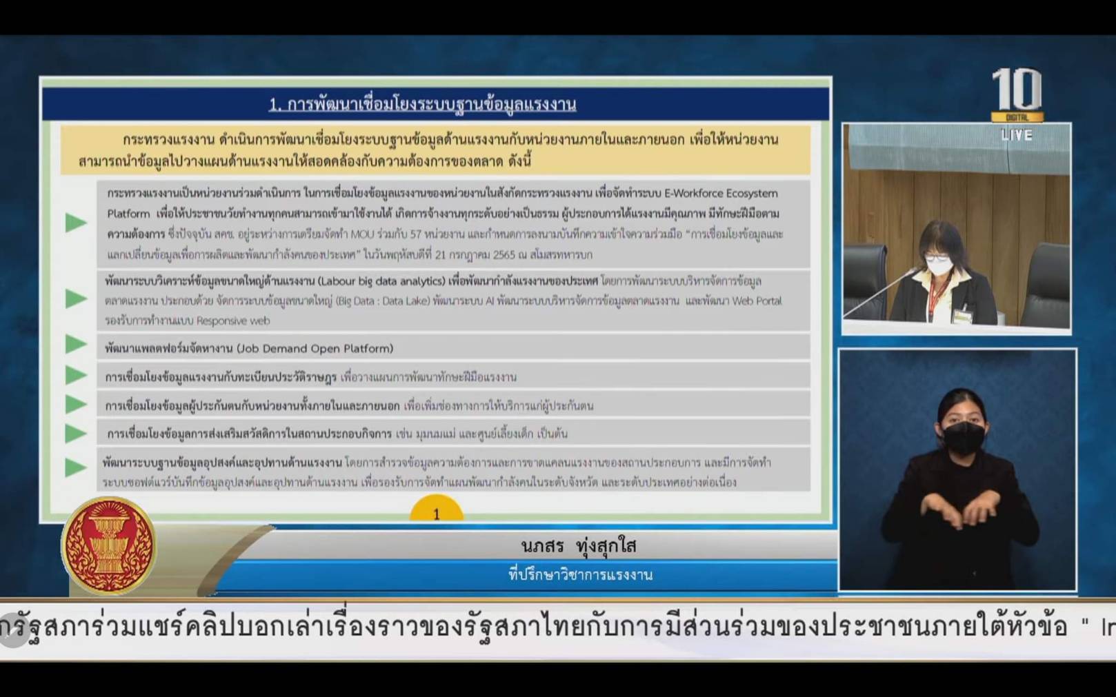 วันที่ 4 กรกฎาคม 2565 นางนภสร ทุ่งสุกใส ที่ปรึกษาวิชาการแรงงาน และผู้แทนหน่วยงานในสังกัดกระทรวงแรงงาน ได้เข้าร่วมประชุมเพื่อตอบประเด็นที่สอบถามของการประชุมวุฒิสภา ในการติดตาม เสนอแนะ และเร่งรัดการปฏิรูปประเทศและการดำเนินงานตามยุทธศาสตร์ชาติ ณ ห้องประชุมจันทรา ชั้น 2 อาคารรัฐสภา (เกียกกาย) ประกอบด้วย 2 ประเด็นสำคัญ ได้แก่ เรื่องที่ 1 ร่างแผนพัฒนาเศรษฐกิจและสังคมแห่งชาติฉบับที่ 13 ภายใต้ยุทธศาสตร์ชาติด้านการพัฒนาและเสริมสร้างศักยภาพทรัพยากรมนุษย์ ที่เกี่ยวข้องกับกระทรวงแรงงาน และเรื่องที่ 2 ความคืบหน้าการดำเนินงานภายใต้แผนการปฏิรูปประเทศ ด้านวัฒนธรรม กีฬา แรงงาน และการพัฒนาทรัพยากรมนุษย์ ด้านเศรษฐกิจ และด้านสังคม ประกอบด้วย การพัฒนาเชื่อมโยงระบบฐานข้อมูลแรงงานการเตรียมความพร้อมให้แรงงานมีทักษะที่จำเป็นในการทำงานในอนาคต แนวทางการบริหารจัดการแรงงานสูงอายุ และแนวทางการบริหารจัดการแรงงานต่างด้าว