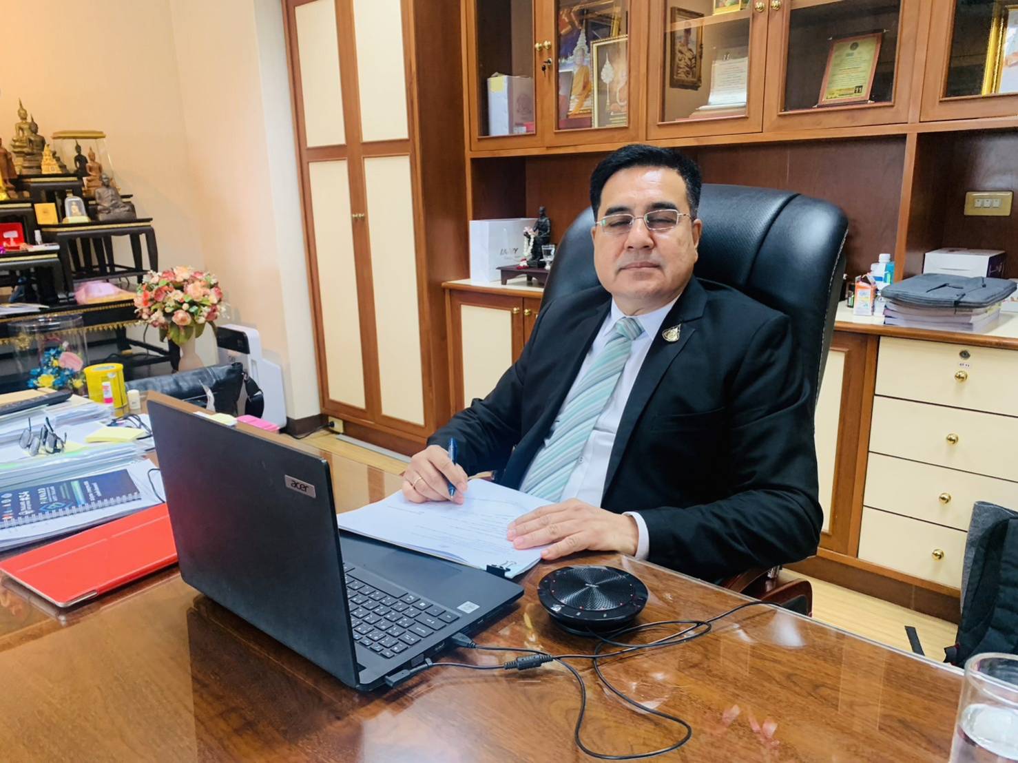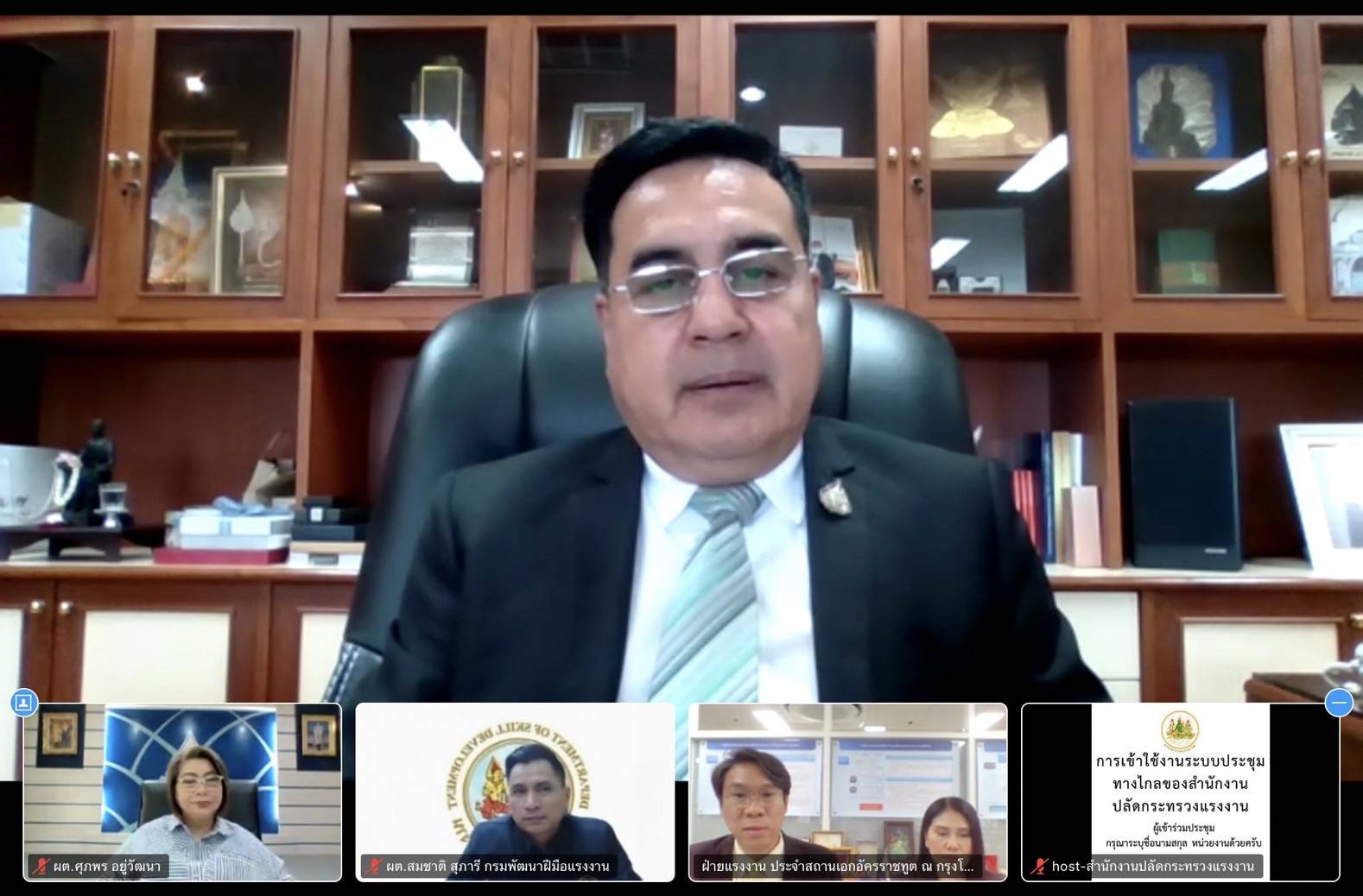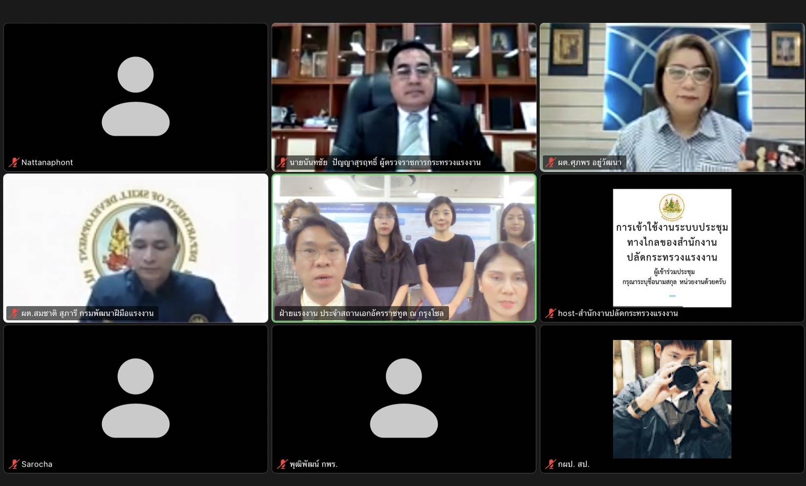 วันที่ 26 กรกฎาคม 2566 นายนันทชัย ปัญญาสุรฤทธิ์ ผู้ตรวจราชการกระทรวงแรงงาน พร้อมด้วยนายสมชาติ สุภารี ผู้ตรวจราชการกรม กรมพัฒนาฝีมือแรงงาน และเรืออากาศเอกหญิง ศุภพร อยู่วัฒนา ผู้ตรวจราชการกรม สำนักงานประกันสังคม ประชุมตรวจนิเทศฝ่ายแรงงาน ประจำสถานเอกอัครราชทูต ณ กรุงโซล สาธารณรัฐเกาหลี ผ่านระบบประชุมทางไกล (Video Conference) ณ ห้องทำงานผู้ตรวจราชการกระทรวงแรงงาน ชั้น 8 โดยมีนายนิธิพัฒน์ วัฒนสุวกุล อัครราชทูตที่ปรึกษา (ฝ่ายแรงงาน) และนางสาวอาภรณ์ อุปการรอด ที่ปรึกษา (ฝ่ายแรงงาน) เข้าร่วมการประชุม