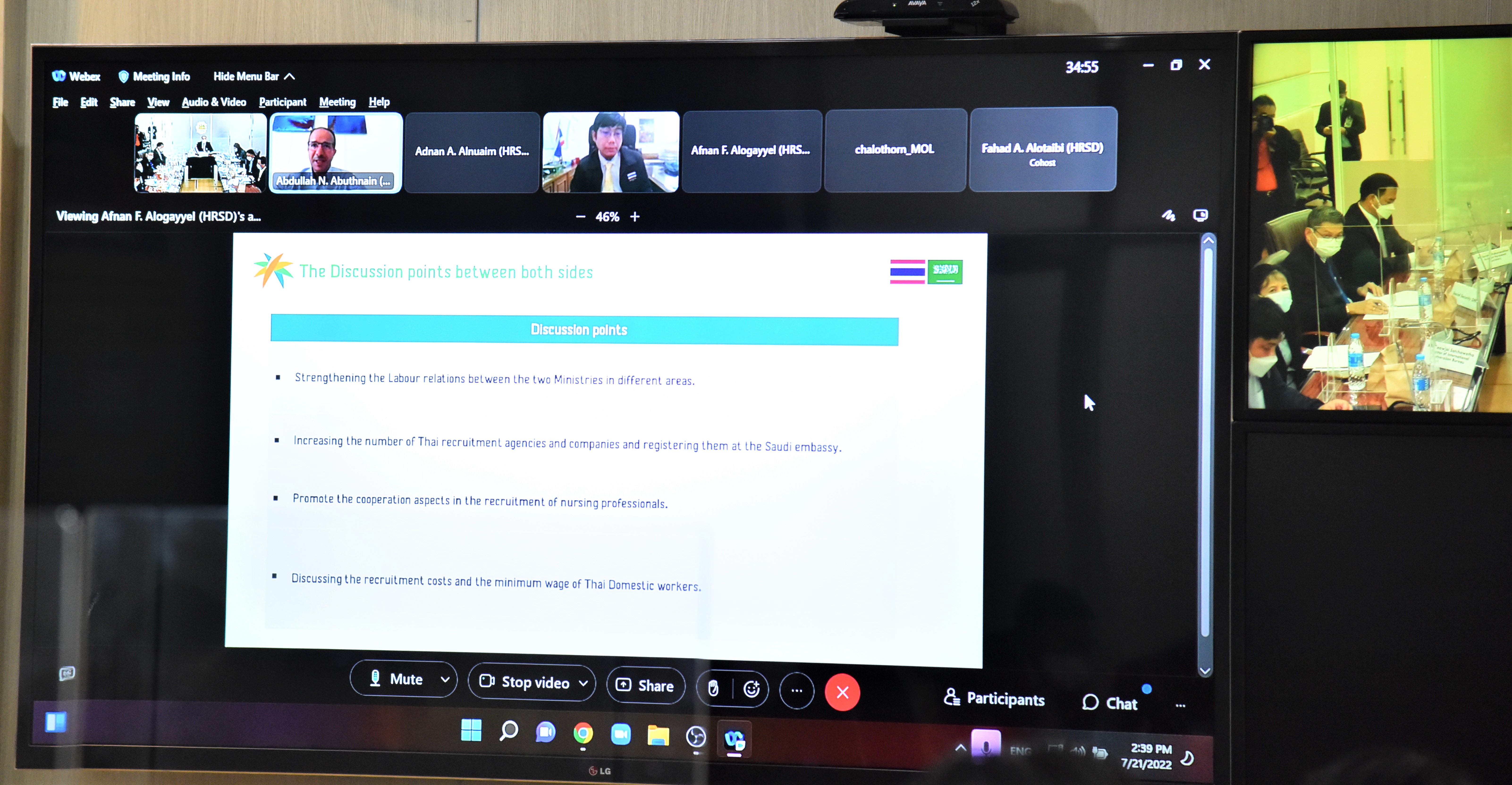 วันที่ 21 กรกฎาคม 2565 เวลา 14.30 น. นายสุชาติ ชมกลิ่น รัฐมนตรีว่าการกระทรวงแรงงาน มอบหมายให้ นายสุรชัย ชัยตระกูลทอง ผู้ช่วยรัฐมนตรีประจำกระทรวงแรงงาน เป็นประธานการประชุมหารือร่วมกับ ดร.อับดุลลาห์ อะบู ธีนีน ผู้ช่วยรัฐมนตรีว่าการกระทรวงทรัพยากรมนุษย์และการพัฒนาสังคมซาอุดีอาระเบีย ประเด็นความคืบหน้ากระชับความสัมพันธ์ด้านแรงงานระหว่างไทยและซาอุดีอาระเบีย ผ่านระบบการประชุมทางไกล (Video Conference) โดยมี นายสมาสภ์ ปัทมะสุคนธ์ ผู้ช่วยปลัดกระทรวงแรงงาน พร้อมด้วยผู้แทนจากสำนักประสานความร่วมมือระหว่างประเทศ สำนักงานปลัดกระทรวงแรงงาน และหน่วยงานในสังกัดกระทรวงแรงงาน เข้าร่วมการประชุมในครั้งนี้ด้วย ณ ห้องประชุมแสงสิงแก้ว ชั้น 5 อาคารกระทรวงแรงงาน