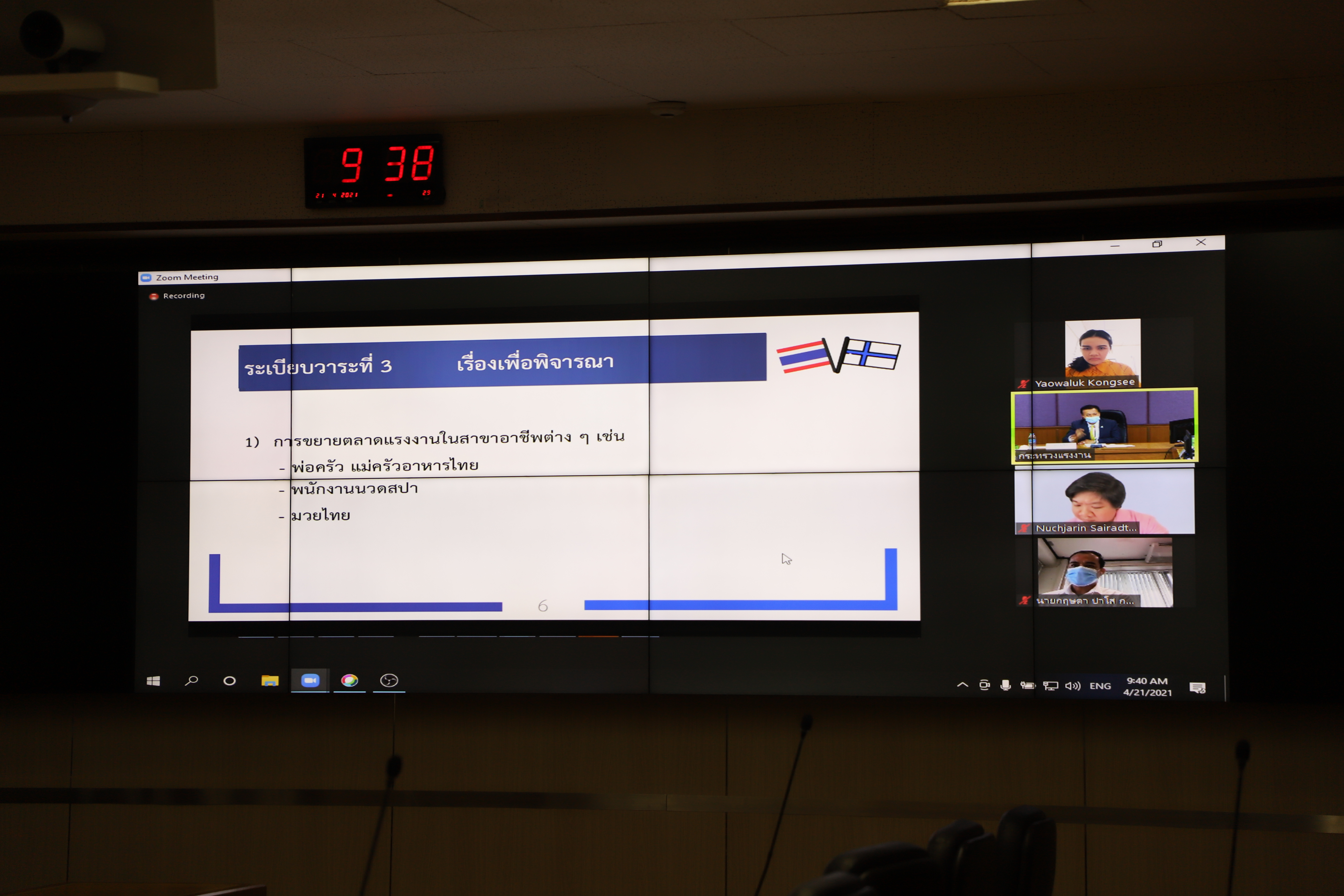 วันที่ 21 เมษายน 2564 เวลา 09.30 น. นายสุทธิ สุโกศล ปลัดกระทรวงแรงงาน เป็นประธานการประชุมหารือเตรียมการในประเด็นที่เกี่ยวข้องด้านแรงงานก่อนการหารือกับสาธารณรัฐฟินแลนด์ ณ ห้องประชุมประสงค์ รณะนันทน์ ชั้น 5 อาคารกระทรวงแรง โดยที่ประชุมได้มีการหารือเรื่องการขยายตลาดแรงงานในสาขาอาชีพต่างๆ เช่น พ่อครัวแม่ครัวอาหารไทย พนักงานนวดสปา และมวยไทย รวมทั้งการแลกเปลี่ยนผู้เชี่ยวชาญ นักเรียน นักศึกษาในการฝึกอบรมด้านเทคโนโลยีขั้นสูงแห่งอนาคต การจัดระบบอาชีวศึกษาและการพัฒนาทักษะฝีมือแรงงานในสถานประกอบกิจการกับสาธารณรัฐฟินแลนด์