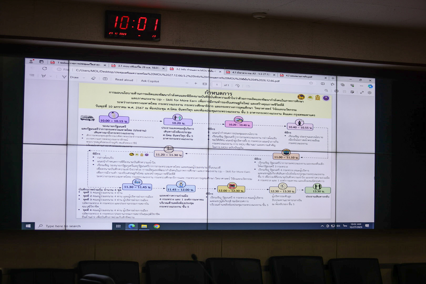 โดยที่ประชุมได้พิจารณาการรับชมวีดิทัศน์แนะนำผู้บริหารกระทรวง 4 กระทรวง แนะนำภารกิจกระทรวงแรงงาน ผลการดำเนินงานตามบันทึกข้อตกลงความร่วมมือที่ผ่านมา และสาระสำคัญของบันทึกความเข้าใจฉบับปัจจุบัน ทั้งนี้ การรับมอบนโยบายด้านการผลิตและพัฒนากำลังคน และพิธีลงนามบันทึกความเข้าใจดังกล่าวจะกำหนดจัดขึ้นในวันที่ 10 มกราคม 2567 นี้ ณ ห้องประชุมกระทรวงแรงงาน ชั้น 5 อาคารกระทรวงแรงงาน