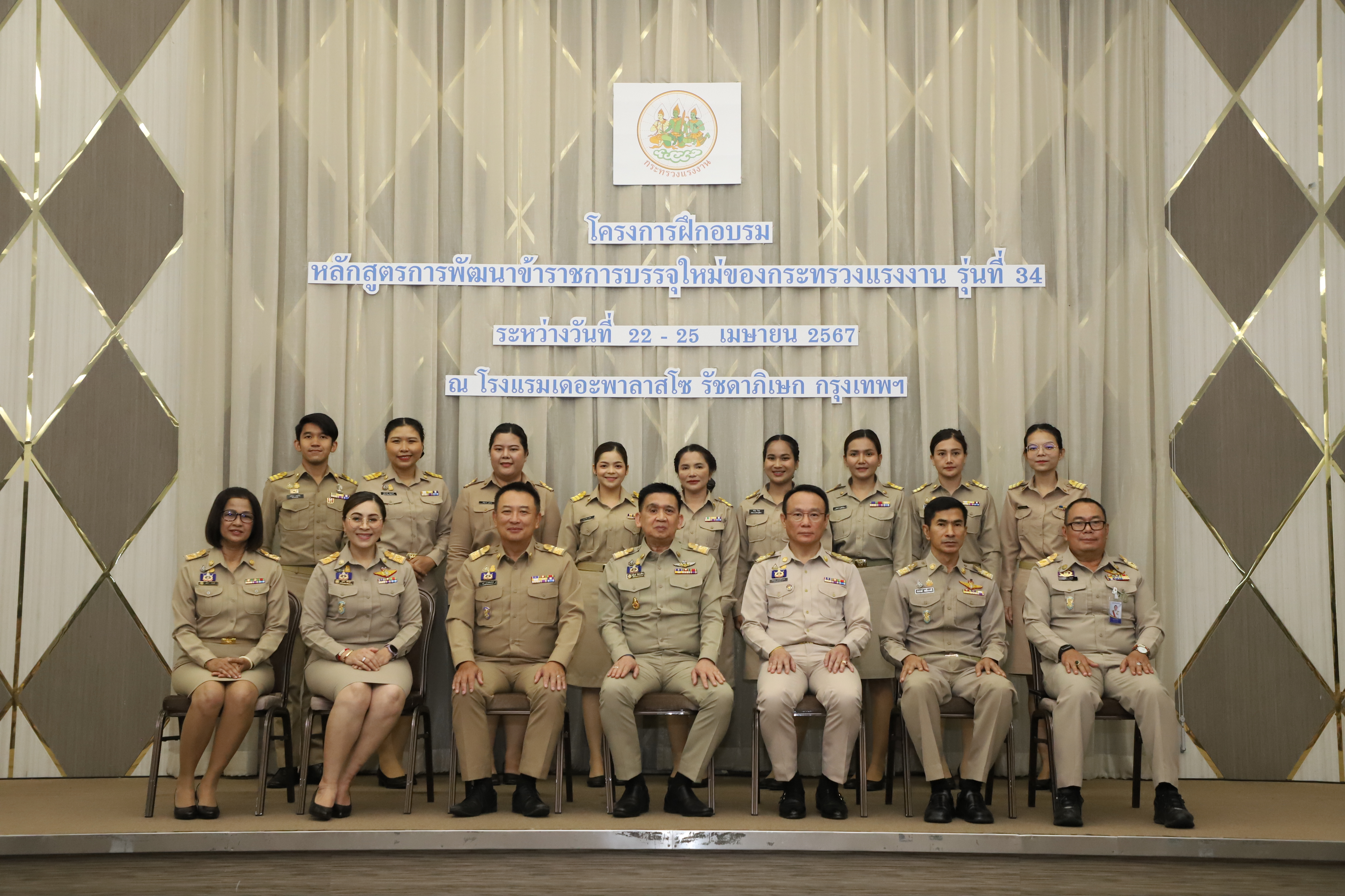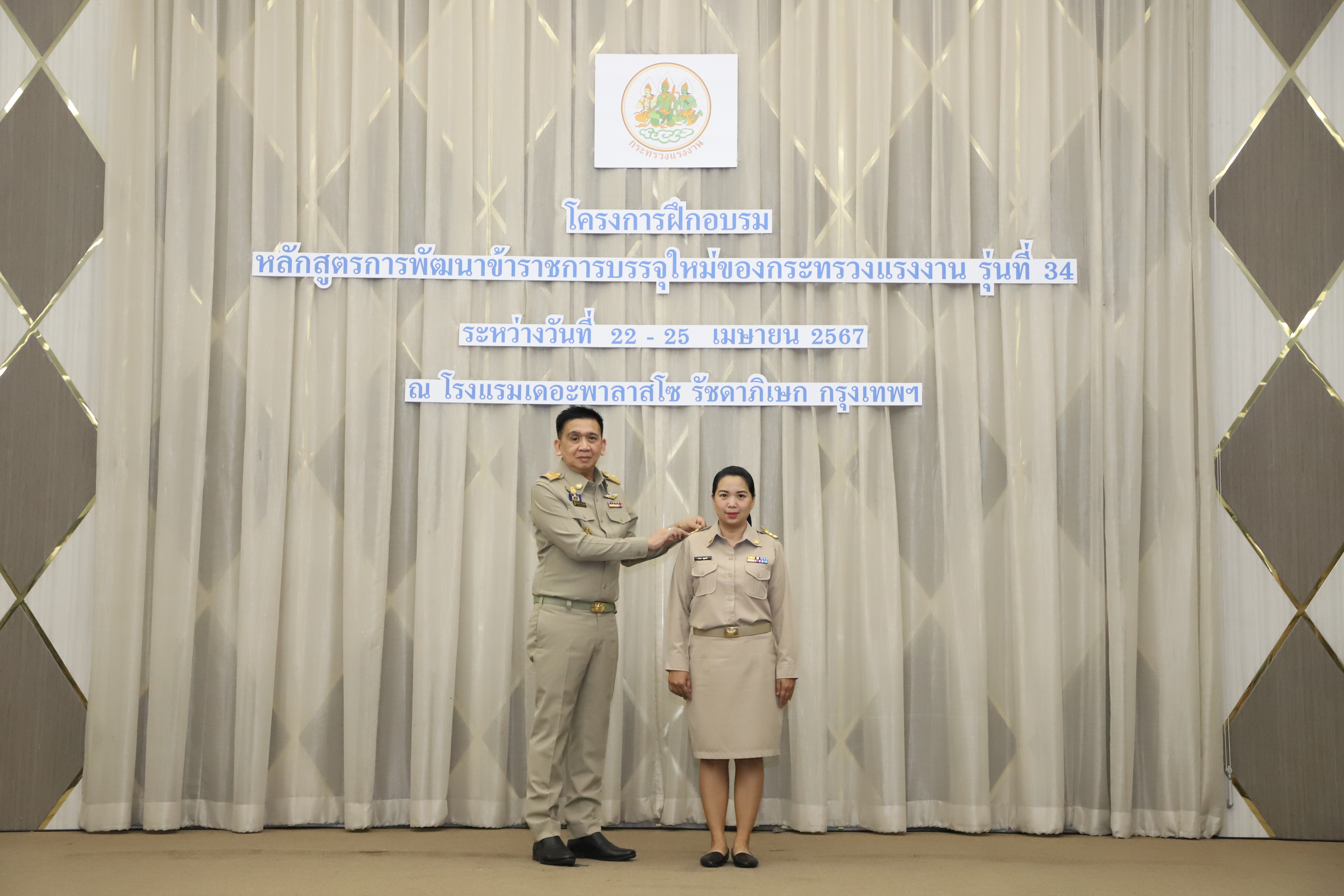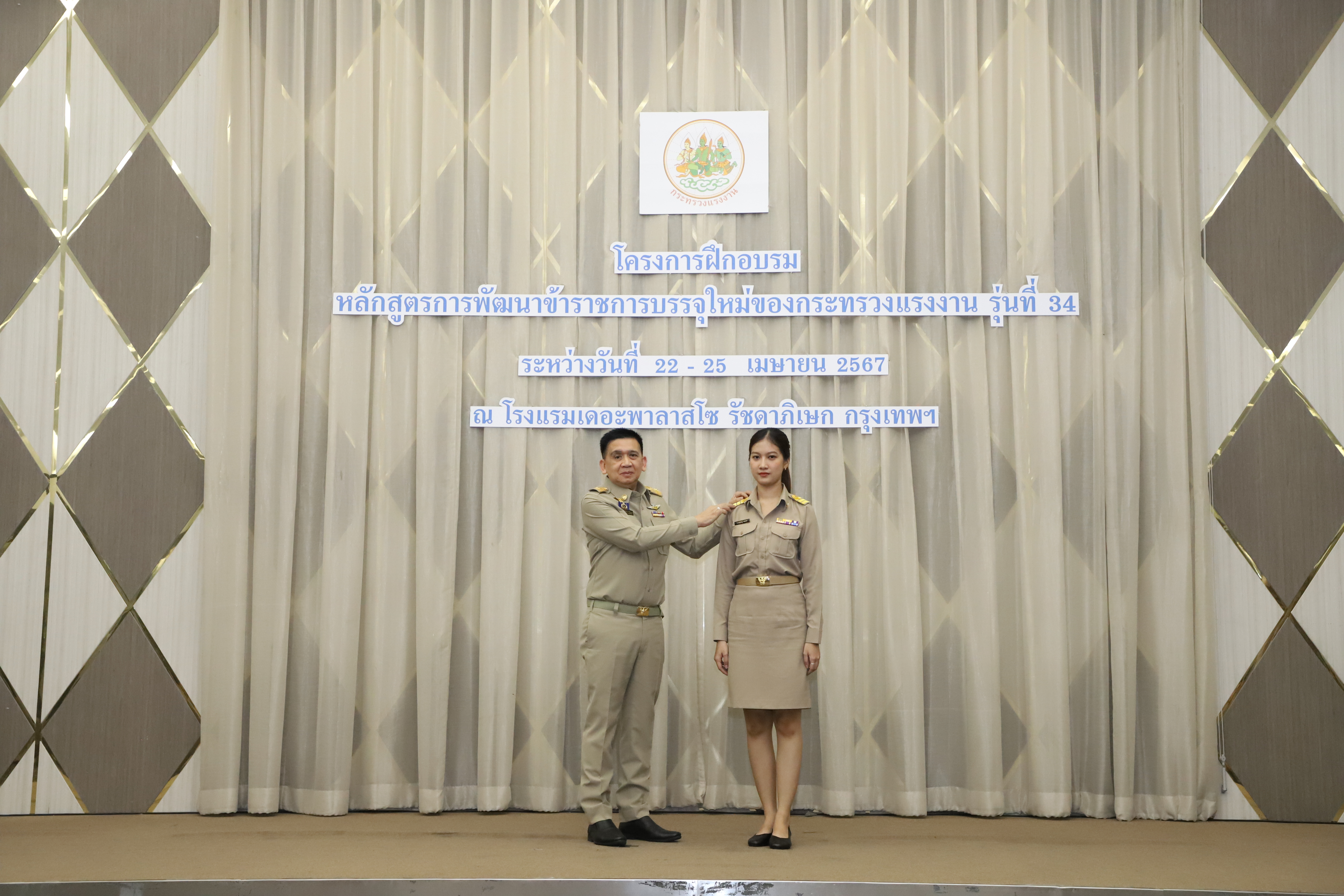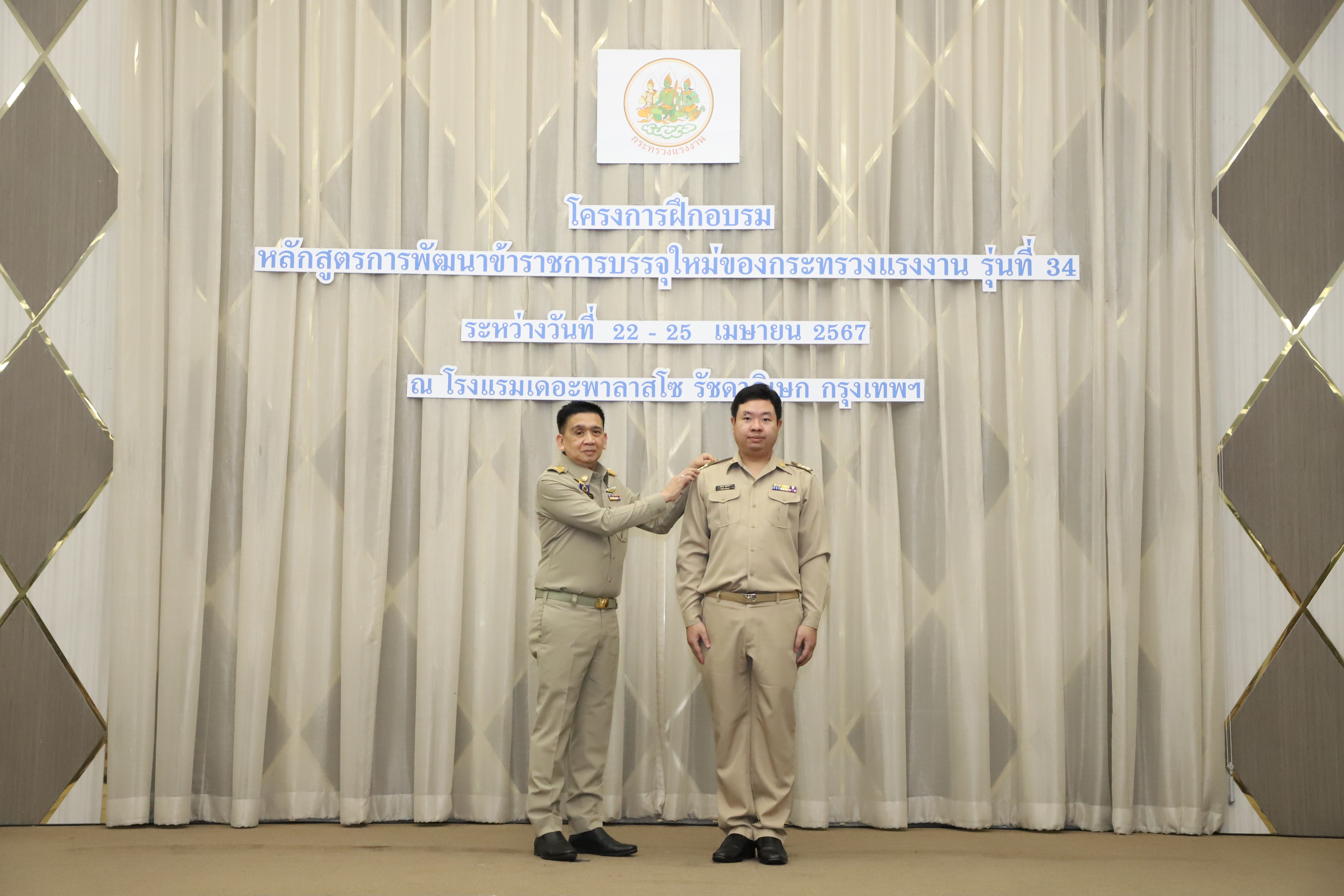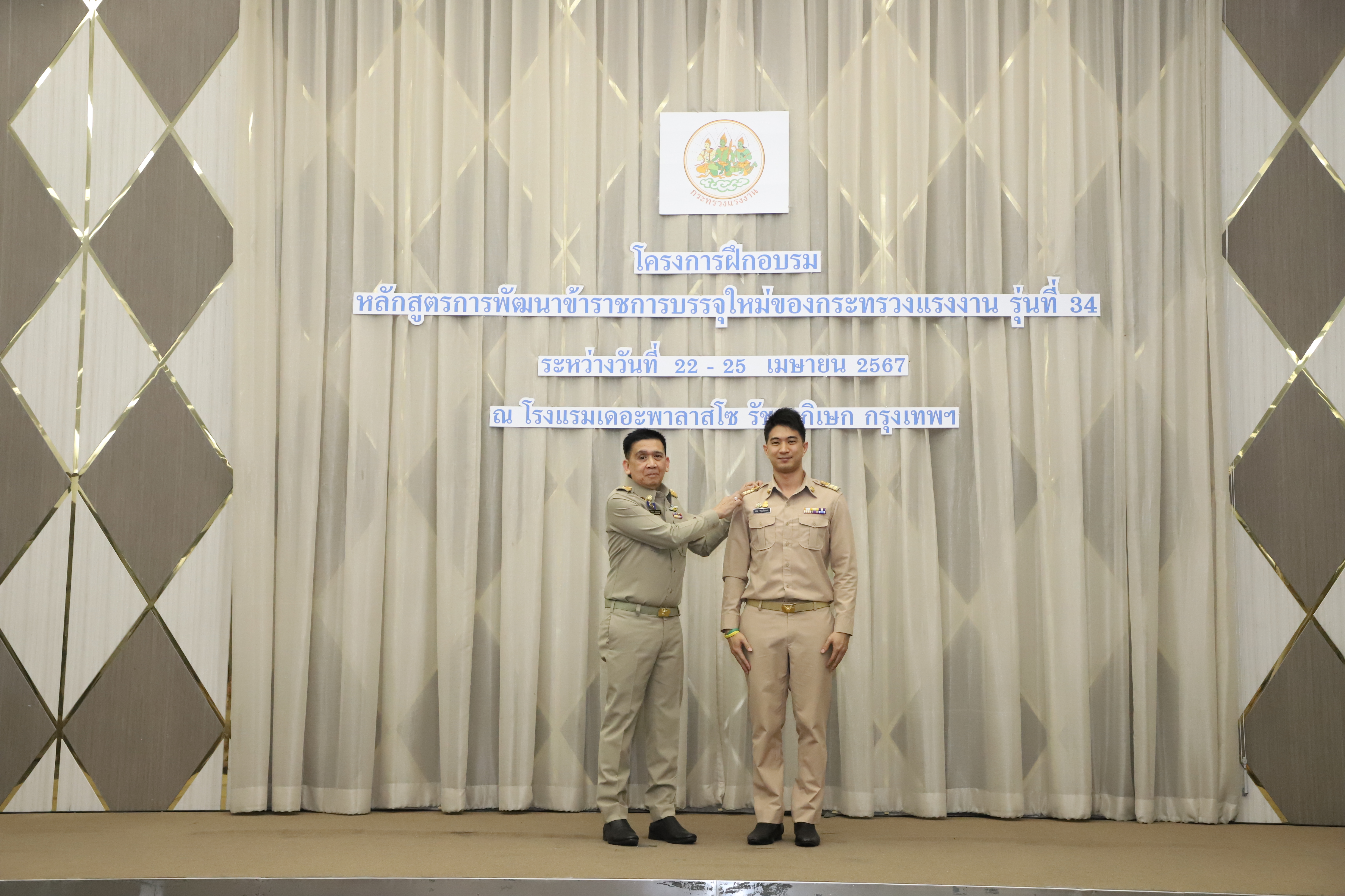 วันที่ 25 เมษายน 2567 นายไพโรจน์ โชติกเสถียร ปลัดกระทรวงแรงงาน เป็นประธานในพิธีประดับอินทรธนูและพิธีปิดโครงการฝึกอบรมหลักสูตรการพัฒนาข้าราชการบรรจุใหม่ของกระทรวงแรงงาน รุ่นที่ 34 ณ ห้องประชุมGrand Palazzo ชั้น 7 โรงแรม เดอะพาลาสโซ กรุงเทพ โดยมี นายเดชา พฤกษ์พัฒนรักษ์ รองปลัดกระทรวงแรงงาน และผู้บริหารกระทรวงแรงงาน ร่วมเป็นเกียรติในพิธีฯ ดังกล่าว