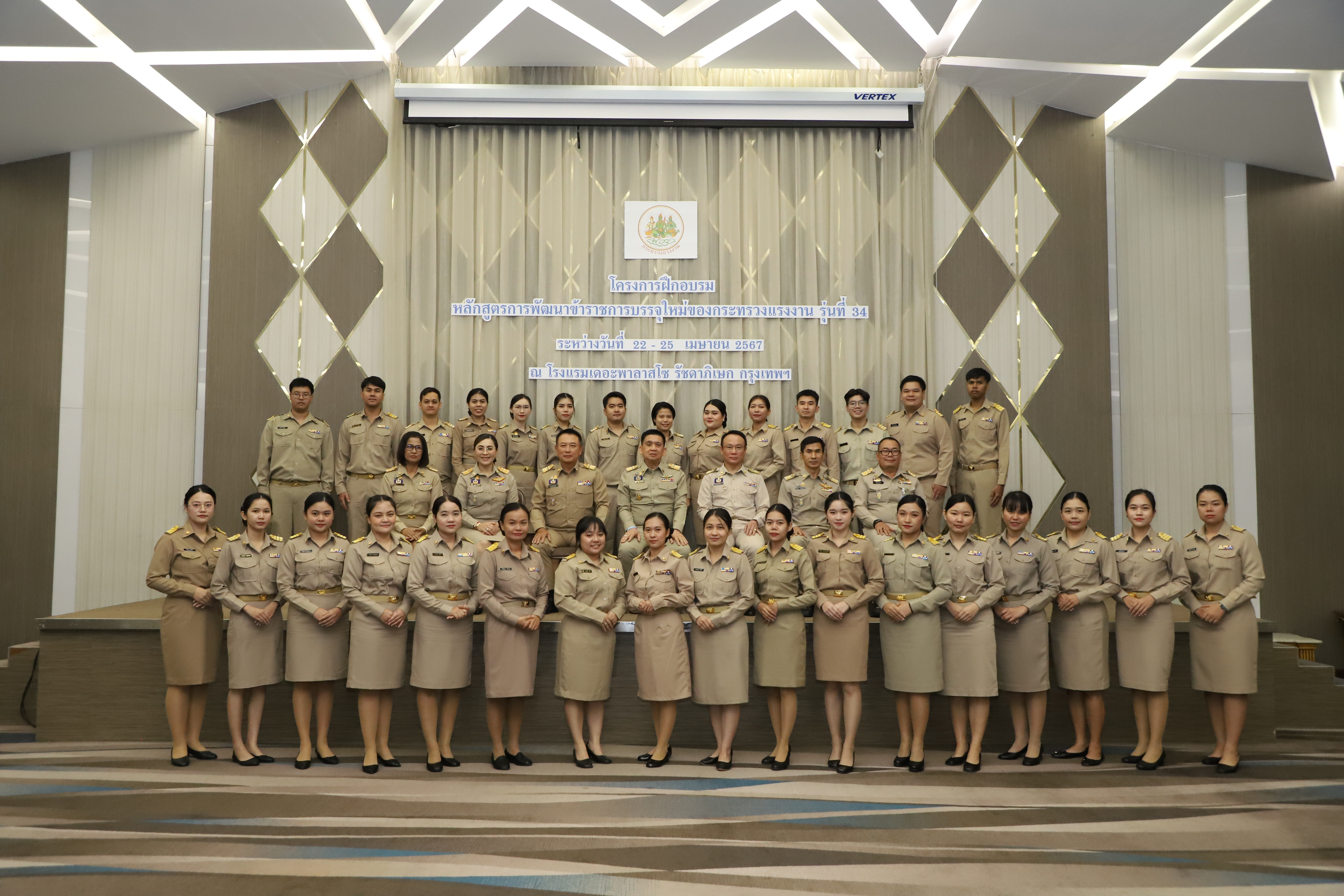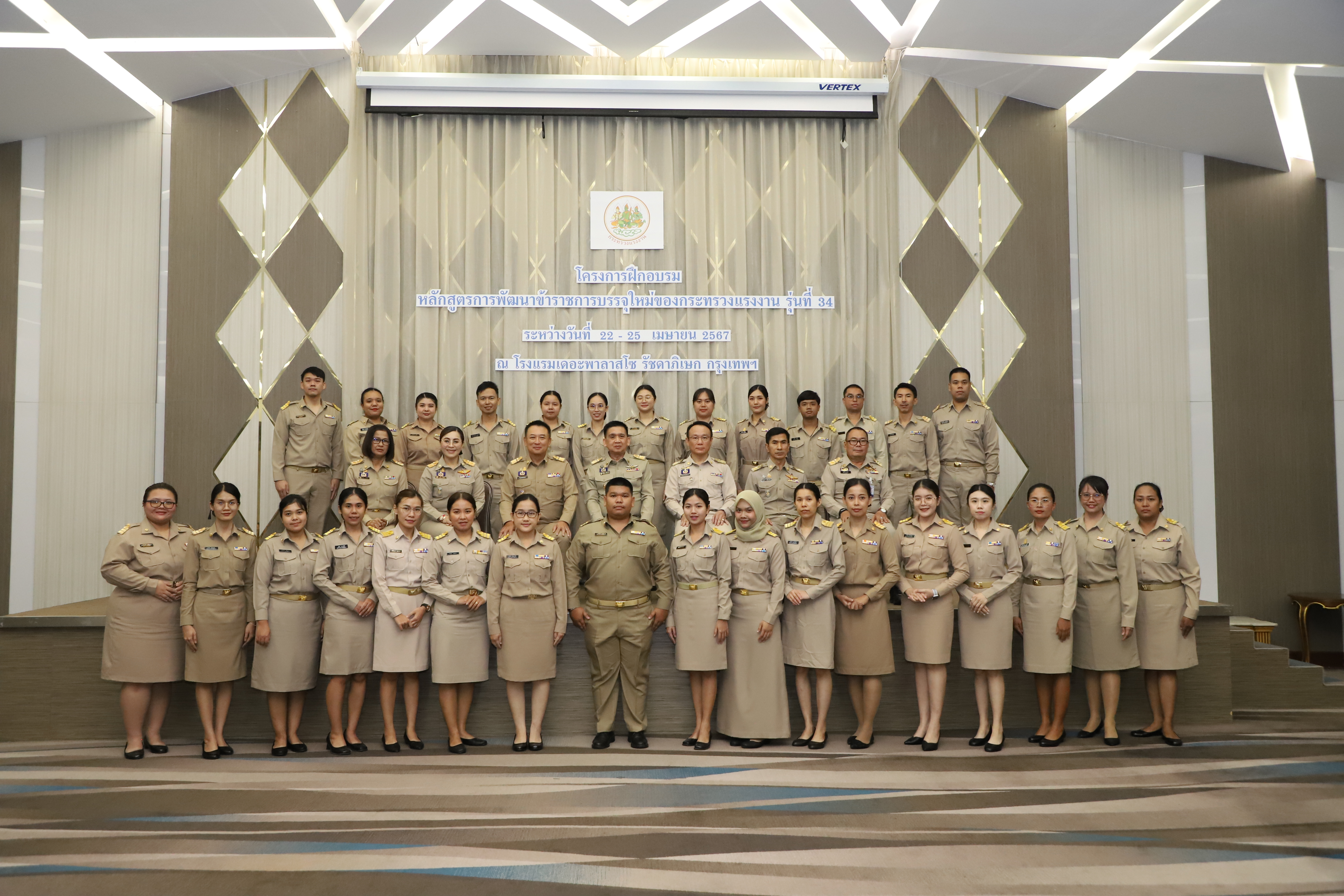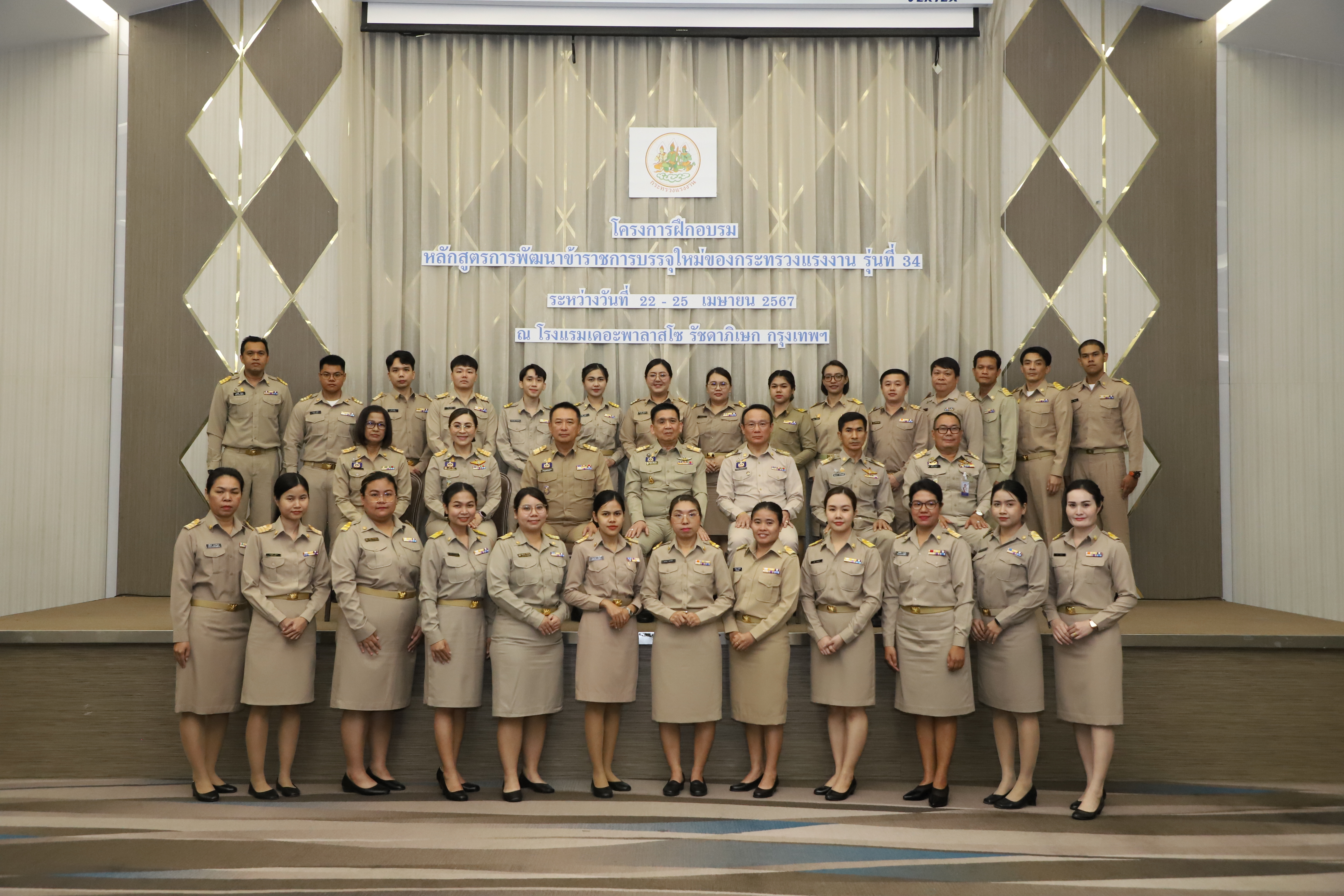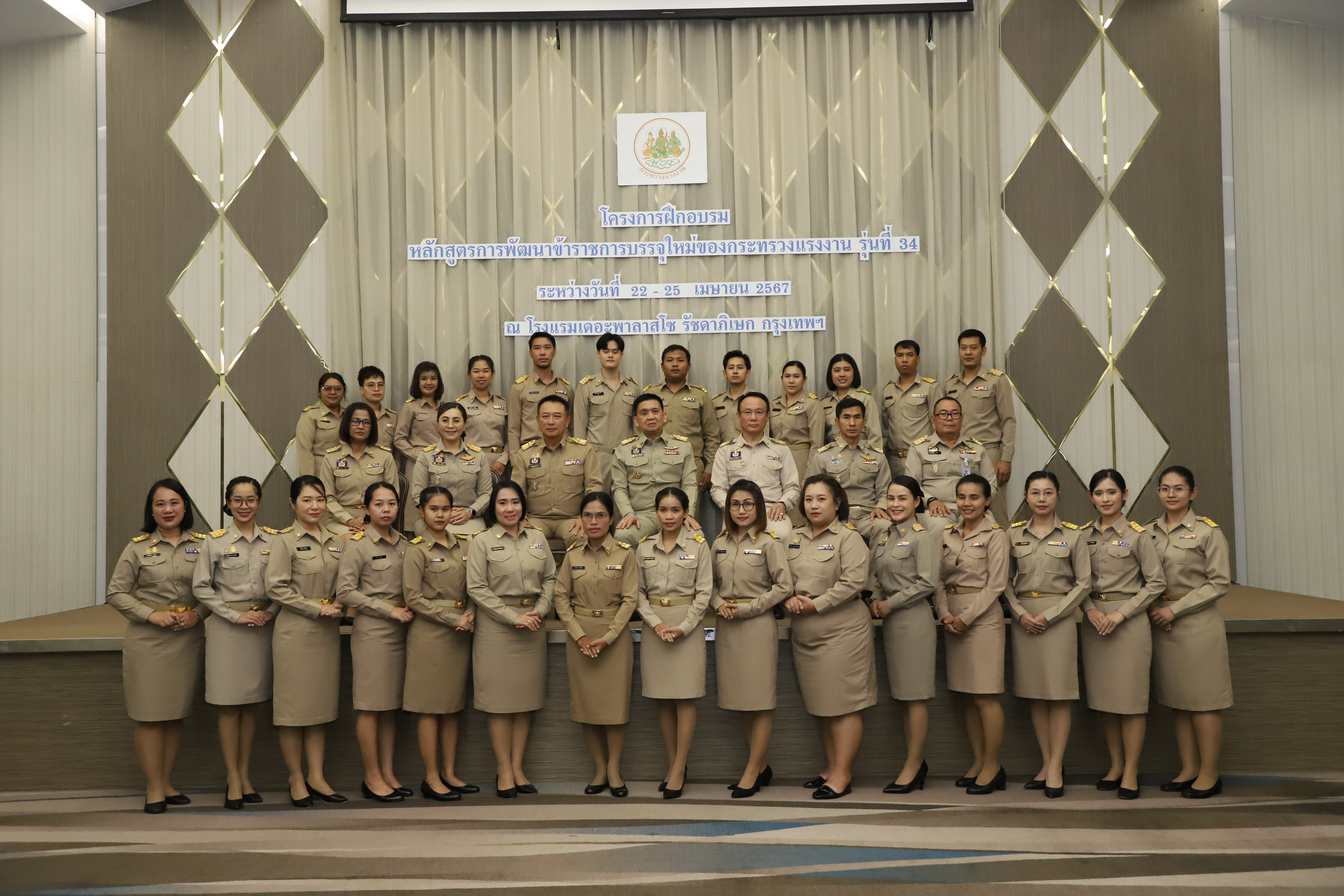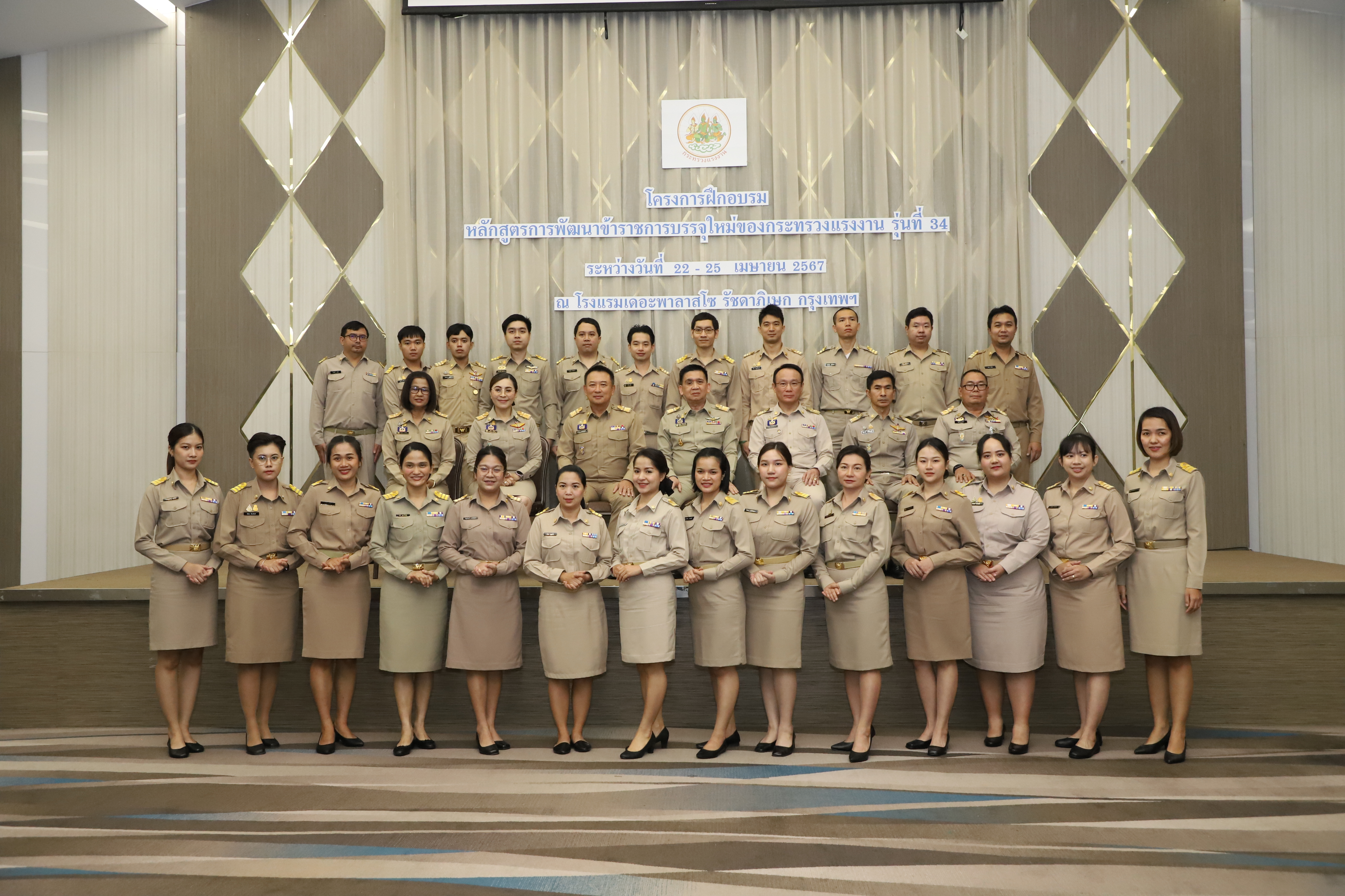 วันที่ 25 เมษายน 2567 นายไพโรจน์ โชติกเสถียร ปลัดกระทรวงแรงงาน เป็นประธานในพิธีประดับอินทรธนูและพิธีปิดโครงการฝึกอบรมหลักสูตรการพัฒนาข้าราชการบรรจุใหม่ของกระทรวงแรงงาน รุ่นที่ 34 ณ ห้องประชุมGrand Palazzo ชั้น 7 โรงแรม เดอะพาลาสโซ กรุงเทพ โดยมี นายเดชา พฤกษ์พัฒนรักษ์ รองปลัดกระทรวงแรงงาน และผู้บริหารกระทรวงแรงงาน ร่วมเป็นเกียรติในพิธีฯ ดังกล่าว