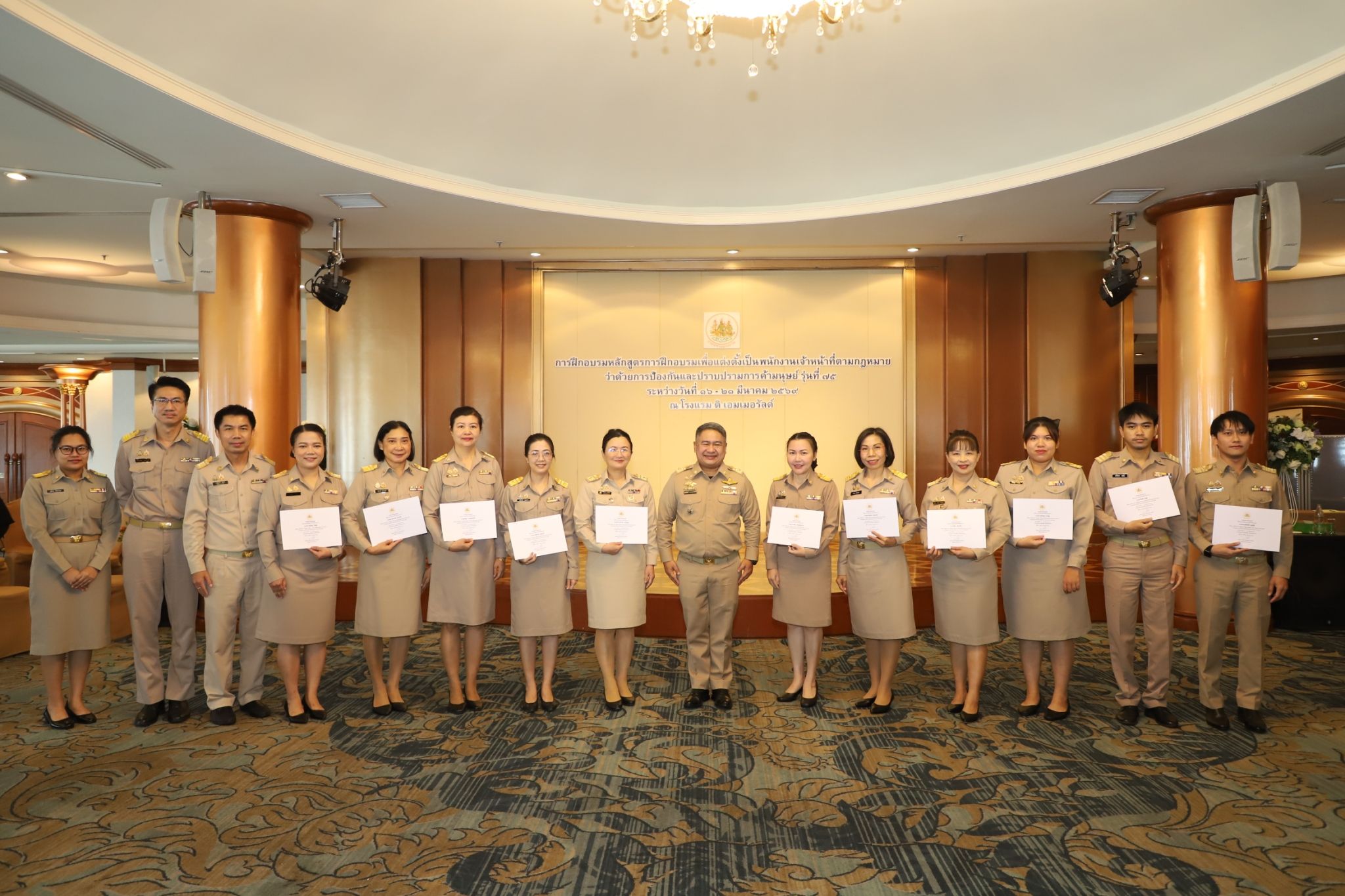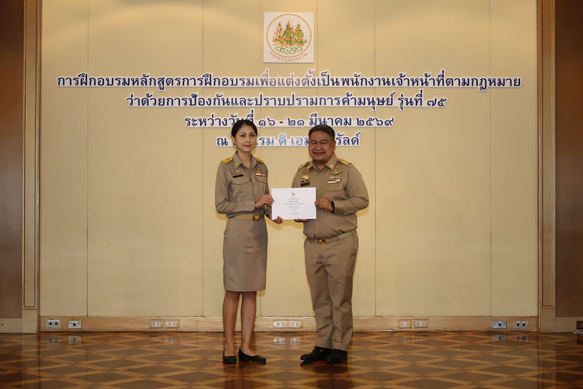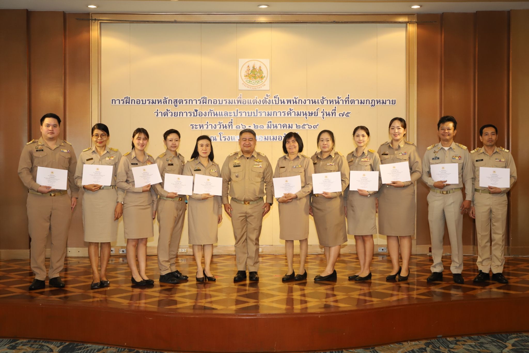 วันที่ 21 มีนาคม 2569 เวลา 10.00 น. พันตำรวจโท วรรณพงษ์ คชรักษ์ ปลัดกระทรวงแรงงาน มอบหมายให้ นายเสกสิทธิ์ สวรรยาธิปัติ ผู้ช่วยปลัดกระทรวงแรงงาน เป็นประธานในพิธีมอบประกาศนียบัตรและกล่าวปิดโครงการฝึกอบรมหลักสูตรการฝึกอบรมเพื่อแต่งตั้งเป็นพนักงานเจ้าหน้าที่ตามกฎหมายว่าด้วยการป้องกันและปราบปรามการค้ามนุษย์ รุ่นที่ 75 โดยมี นางสาวโสภณา บุญ-หลง ผู้อำนวยการสำนักงานเลขานุการศูนย์บัญชาการป้องกันการค้ามนุษย์ด้านแรงงาน กล่าวรายงาน ณ ห้องพาโนรามา ชั้น 14 โรงแรม ดิ เอมเมอรัลด์ ถนนรัชดาภิเษก เขตดินแดง กรุงเทพมหานคร