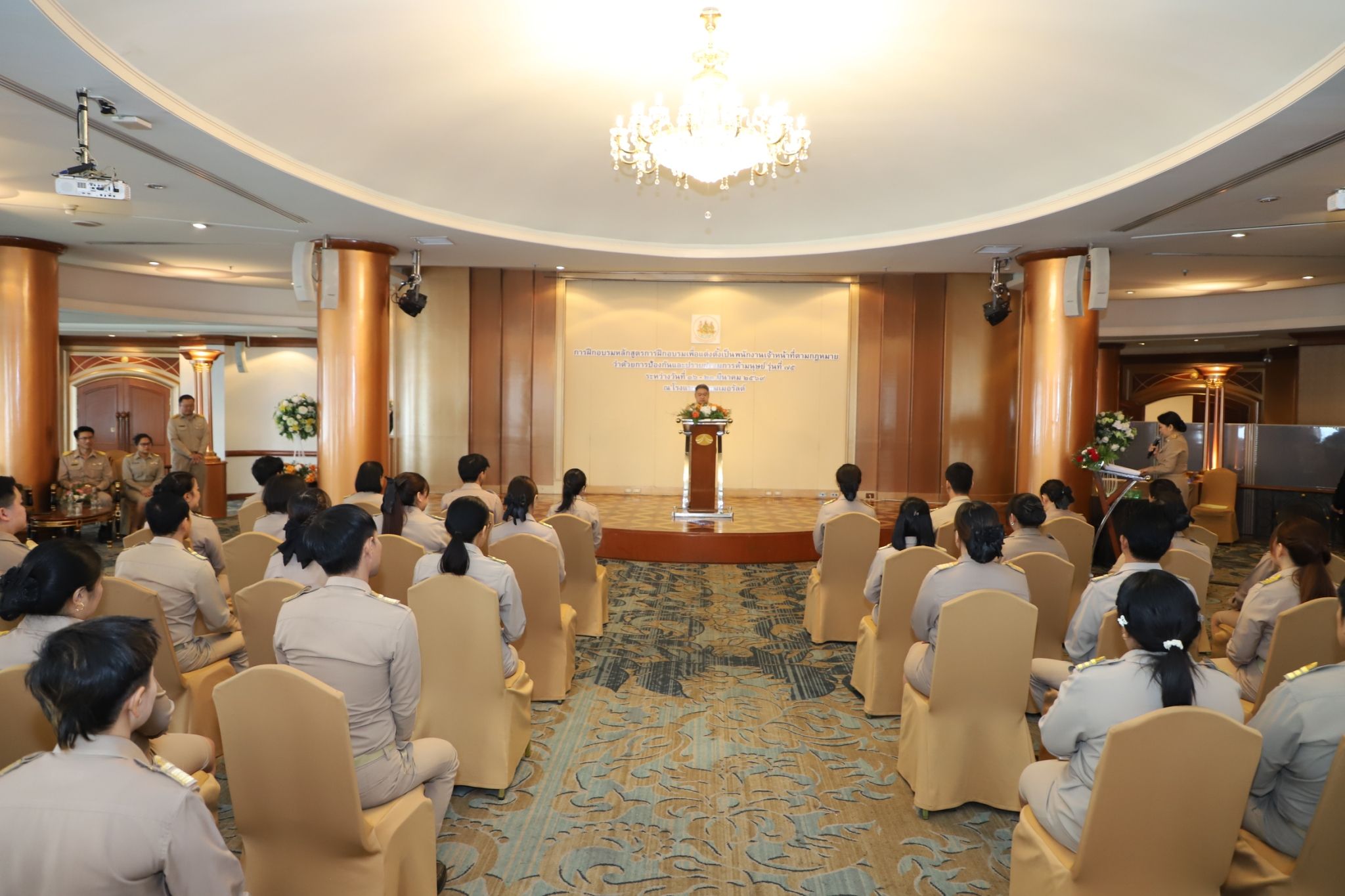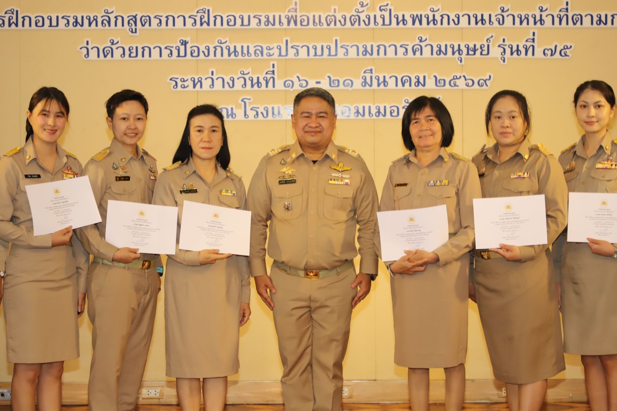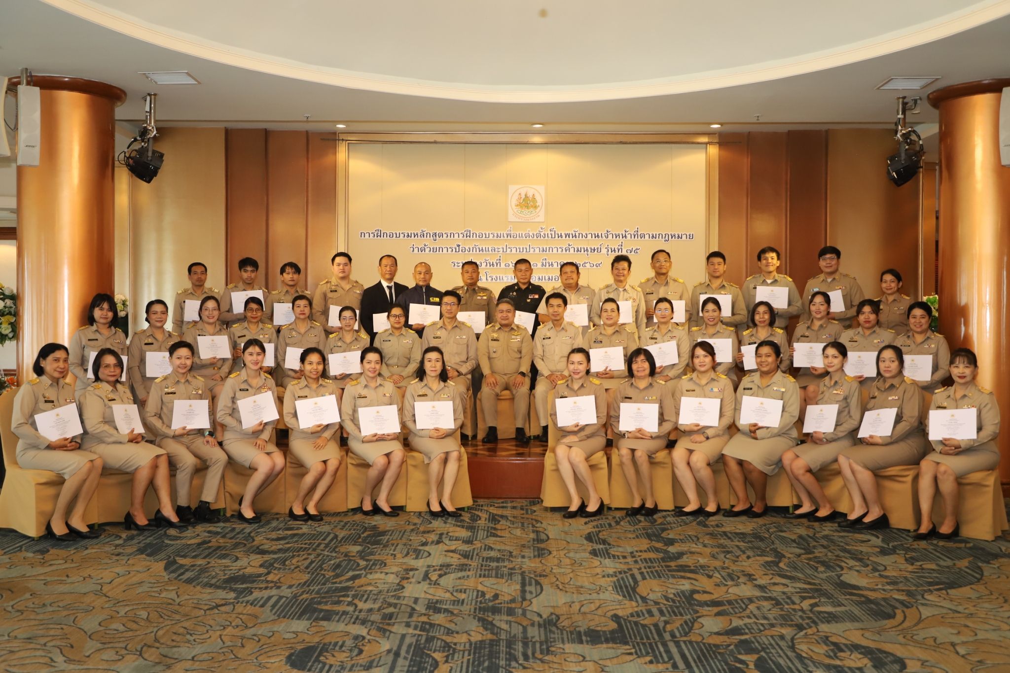 วันที่ 21 มีนาคม 2569 เวลา 10.00 น. พันตำรวจโท วรรณพงษ์ คชรักษ์ ปลัดกระทรวงแรงงาน มอบหมายให้ นายเสกสิทธิ์ สวรรยาธิปัติ ผู้ช่วยปลัดกระทรวงแรงงาน เป็นประธานในพิธีมอบประกาศนียบัตรและกล่าวปิดโครงการฝึกอบรมหลักสูตรการฝึกอบรมเพื่อแต่งตั้งเป็นพนักงานเจ้าหน้าที่ตามกฎหมายว่าด้วยการป้องกันและปราบปรามการค้ามนุษย์ รุ่นที่ 75 โดยมี นางสาวโสภณา บุญ-หลง ผู้อำนวยการสำนักงานเลขานุการศูนย์บัญชาการป้องกันการค้ามนุษย์ด้านแรงงาน กล่าวรายงาน ณ ห้องพาโนรามา ชั้น 14 โรงแรม ดิ เอมเมอรัลด์ ถนนรัชดาภิเษก เขตดินแดง กรุงเทพมหานคร