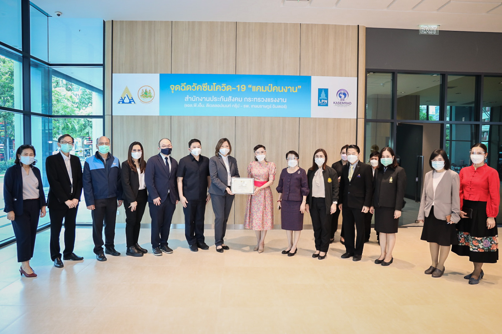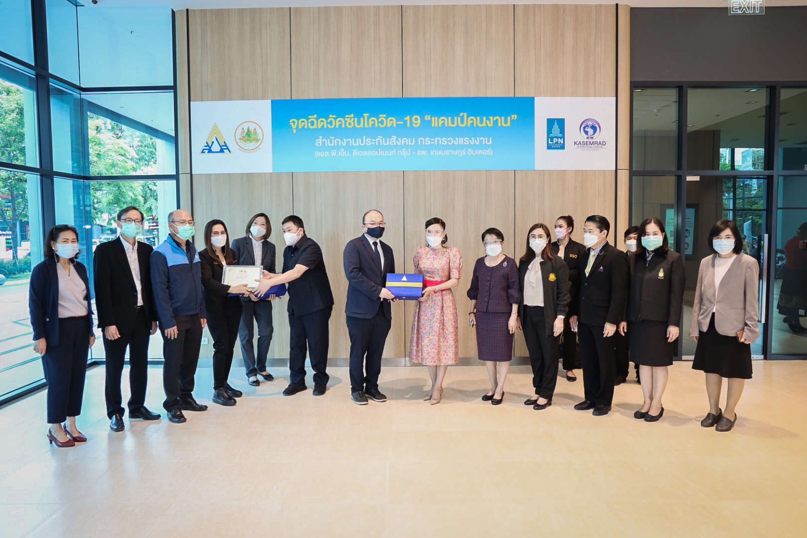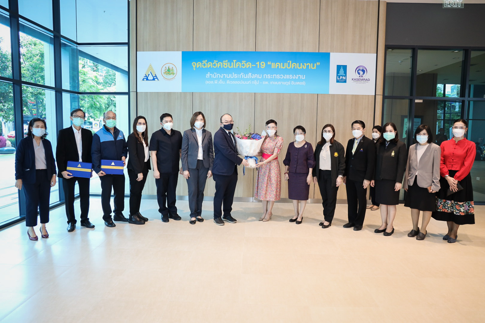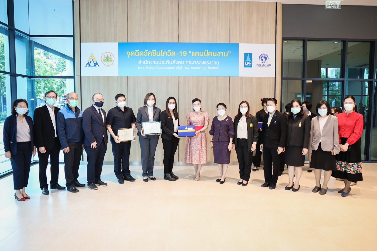 เมื่อวันที่ 3 สิงหาคม 2564 นายสุชาติ ชมกลิ่น รัฐมนตรีว่าการกระทรวงแรงงาน มอบหมายให้ นางธิวัลรัตน์ อังกินันทน์ ที่ปรึกษารัฐมนตรีว่าการกระทรวงแรงงาน ลงพื้นที่มอบใบประกาศขอบคุณภาคเอกชนที่ร่วมให้การสนับสนุนสถานที่และโรงพยาบาลในเครือข่ายประกันสังคมที่สนับสนุนบุคลากรทางการแพทย์ในการฉีดวัคซีนโควิด-19 แคมป์คนงาน ณ อาคารลุมพินีทาวเวอร์ ถนนวิภาวดี แขวงจอมพล เขตจตุจักร กรุงเทพมหานคร โดยมี นางเธียรรัตน์ นะวะมะวัฒน์ โฆษกกระทรวงแรงงาน (ฝ่ายการเมือง) คุณสมศรี เตชะไกรศรี กรรมการผู้จัดการ บริษัทแอล.พี.พี. พร็อพเพอร์ตี้ มาเนจเมนท์ จำกัด และคณะเจ้าหน้าที่บริหาร บริษัท แอล.พี.เอ็น ดีเวลลอปเมนท์ จำกัด (มหาชน) นางสาวบุปผา เรืองสุด ผู้ตรวจราชการกระทรวงแรงงาน เข้าร่วมในครั้งนี้ด้วย โดย นางธิวัลรัตน์ กล่าวว่า ตามที่รัฐบาลภายใต้การนำของ พล.อ.ประยุทธ์ จันทร์โอชา นายกรัฐมนตรี และ รมว.กลาโหม และ ท่าน พล.อ.ประวิตร วงษ์สุวรรณ รองนายกรัฐมนตรี ซึ่งกำกับดูแลกระทรวงแรงงาน ได้มีความห่วงใยพี่น้องผู้ใช้แรงงาน และประชาชนทั่วไปจากสถานการณ์การระบาดของโรคโควิด-19 และกำหนดให้การฉีดวัคซีนเป็นวาระแห่งชาตินั้น ในส่วนของกระทรวงแรงงานได้ดำเนินการตามมาตรการปิดแคมป์คนงานเป็นเวลา 1 เดือน โดยมีเป้าหมายดำเนินการฉีดวัคซีนให้แก่คนงานในแคมป์ประมาณ 80,000 คน เป้าหมายดำเนินการ 3,000 คนต่อวัน จากแคมป์คนงานในพื้นที่กรุงเทพมหานครทั้งหมด 611 แคมป์ คนงาน 83,082 คน เป็นคนไทย 32,471 คน ต่างด้าว 50,611 คน