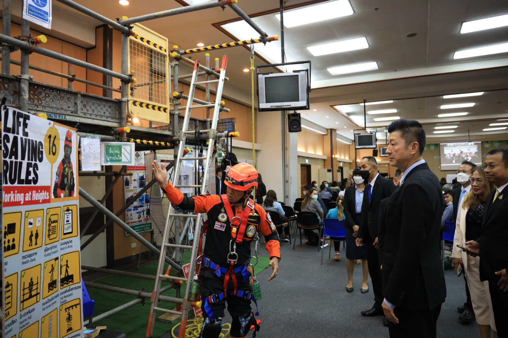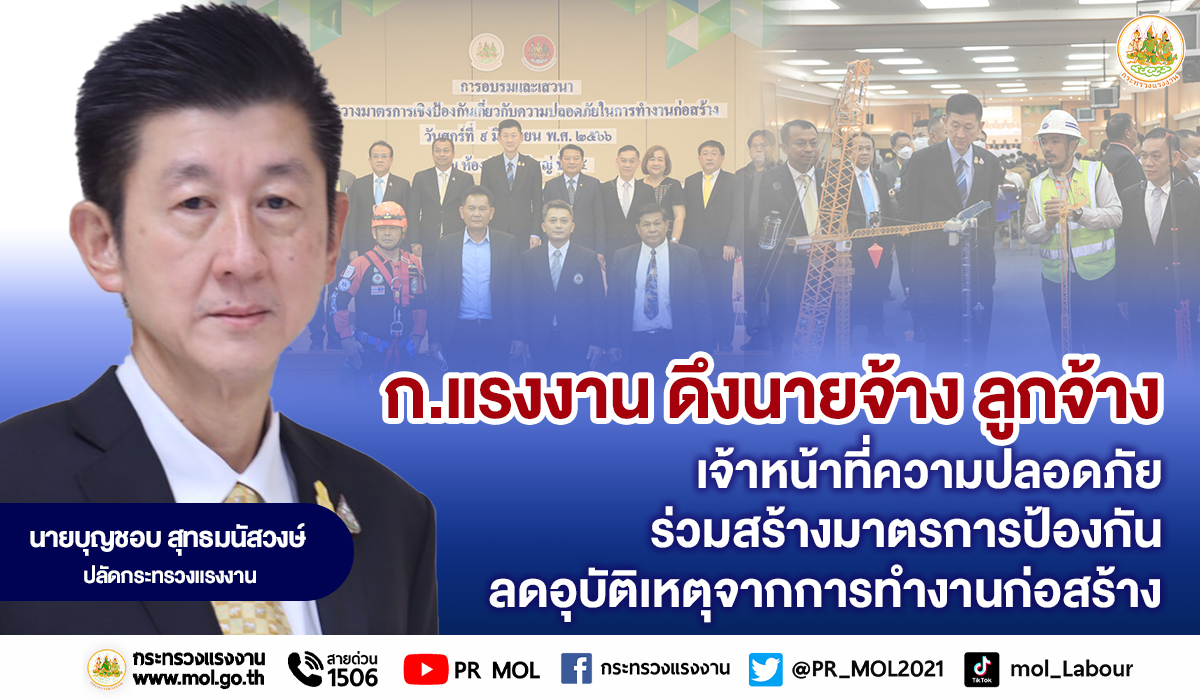 วันที่ 9 มิ.ย. 2566 เวลา 13.30 น. นายบุญชอบ สุทธิมนัสวงษ์ ปลัดกระทรวงแรงงานปลัดกระทรวงแรงงาน เป็นประธานเปิดกิจกรรมการวางมาตรการเชิงป้องกันเกี่ยวกับความปลอดภัยในการทำงานก่อสร้าง สร้างองค์ความรู้และจิตสำนึกที่ดีด้านความปลอดภัยแก่นายจ้าง ลูกจ้าง และเจ้าหน้าที่ความปลอดภัย (จป.) ในกิจการก่อสร้างกว่า 600 คน
