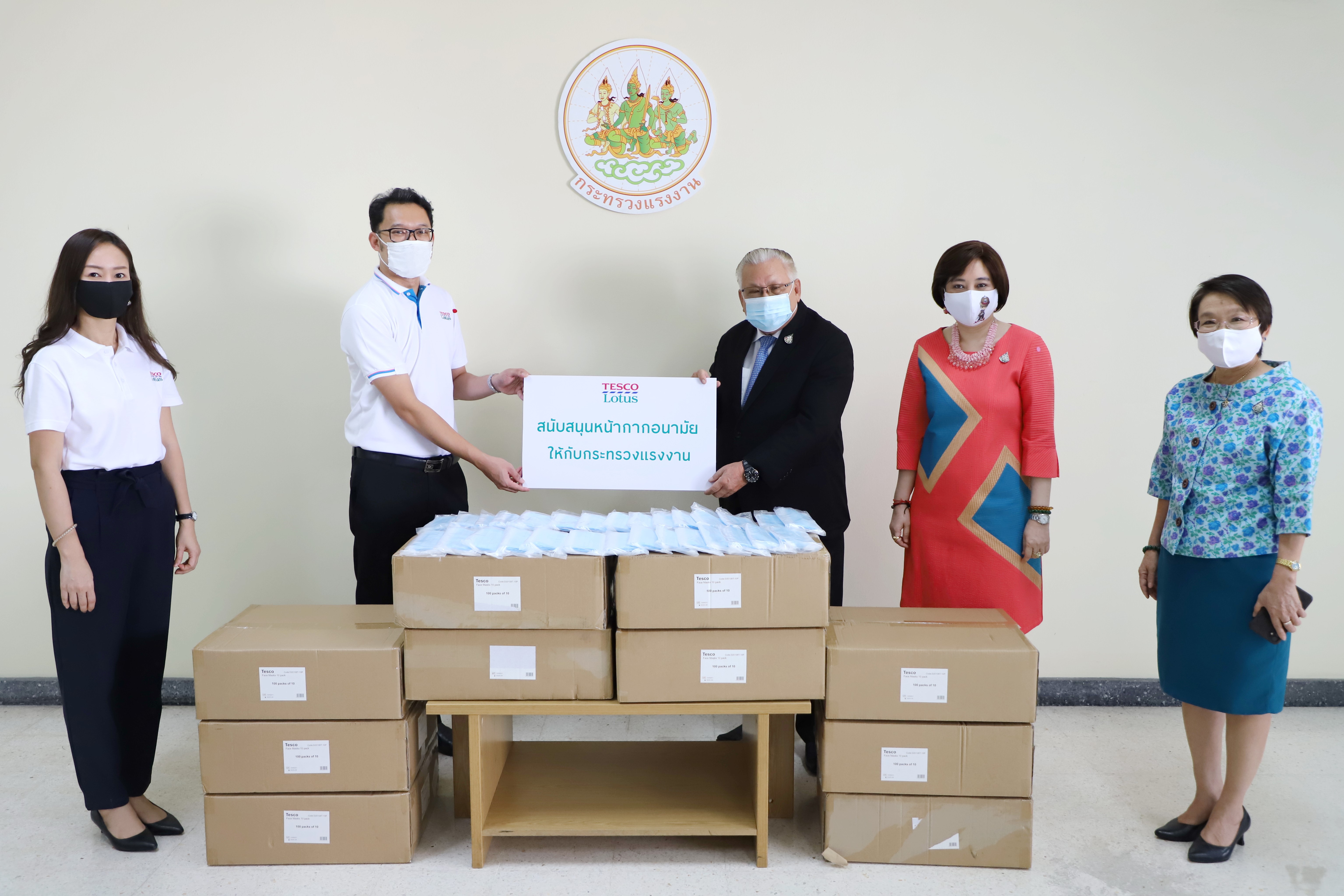 เมื่อวันที่ 21 เมษายน 2563 เวลา 13.30 น. พลโท นันทเดช เมฆสวัสดิ์ เลขานุการรัฐมนตรีว่าการกระทรวงแรงงาน นางสาวอนุสรี ทับสุวรรณ สมาชิกสภาผู้แทนราษฎร คณะกรรมาธิการการแรงงานและที่ปรึกษารัฐมนตรีว่าการกระทรวงแรงงาน พร้อมด้วย นางเธียรรัตน์ นะวะมะวัฒน์ รองปลัดกระทรวงแรงงาน ร่วมรับมอบหน้ากากอนามัย จำนวน 10,000 ชิ้น จาก คุณธนเดช ตระกูลยิ่งยง ผู้จัดการอาวุโส แผนกรัฐสัมพันธ์ ฝ่ายกิจการบริษัท และคุณกิตติกาญจน์ บุญเจือ ผู้จัดการแผนกกิจการบรรษัท – รัฐสัมพันธ์ บริษัท เอก-ชัย ดีสทริบิวชั่น ซิสเทม จำกัด (เทสโก้ โลตัส) เพื่อสนับสนุนการปฏิบัติงานของเจ้าหน้าที่หน่วยงานในสังกัดกระทรวงแรงงานไว้ใช้ประโยชน์ในราชการป้องกันการแพร่ระบาดของเชื้อไวรัสโควิด -19 ณ บริเวณชั้น 7 อาคารกระทรวงแรงงาน