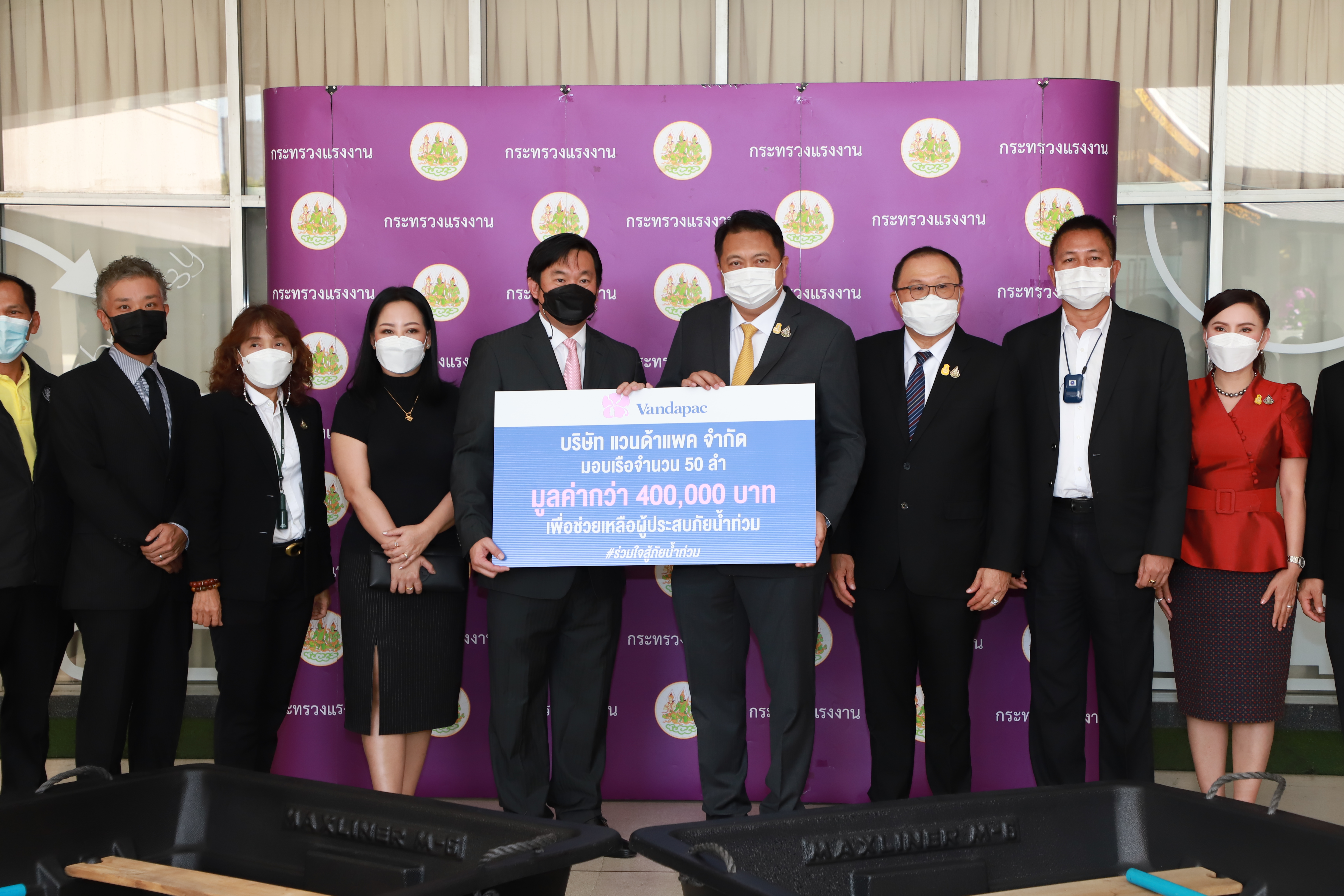 วันที่ 15 ตุลาคม 2564 นายสุชาติ ชมกลิ่น รัฐมนตรีว่าการกระทรวงแรงงาน รับมอบเรือ จาก บริษัท แวนด้าแพค จำกัด จำนวน 50 ลำ มูลค่ากว่า 400,000 บาท เพื่อให้กระทรวงแรงงานนำไปช่วยเหลือพี่น้องผู้ใช้แรงงานที่ประสพภัยในพื้นที่อุทกภัย ณ บริเวณห้องโถง ชั้นล่าง อาคารกระทรวงแรงงาน